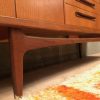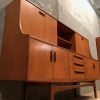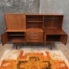 A G Plan Fresco teak Highboard with a single sliding top door, open shelving and drop down cocktail servery. The lower section has a bank of three drawers including a cutlery drawer with double doors on either side enclosing a single shelf.