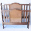 A Jacobean style double bed with bowed top rail and barley twist supports, the centred rattan panels with carved scrolls, flanked on both sides with slats, raised on turned legs.