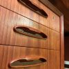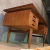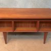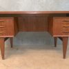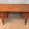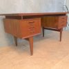 A hard to find Mid Century Danish teak floating desk each pedestal containing a bank of three drawers, the opposite side of the desk recessed for books or display