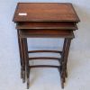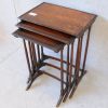 A nest of three 20th Century Oak Tables, plain rectangular tops, raised on ring turned spindle supports, terminating in splay feet. Size:69 high x 53 wide x 36cm deep.