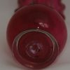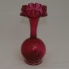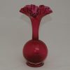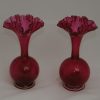 A pair of Victorian cranberry glass frill neck vases with a bulbous base and trumpet shape stem. 16cm high.