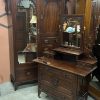 A Victorian dressing table that has a swing mirror on bracket supports each with a small jewellery drawer. The base has a top and lower full width drawers and a central two door cupboard. It has decorative shaped brackets and a repeating semicircular carved arch detail and finials at the top of the mirror. It has a shaped and pierced plinth that forms bracket feet, and a full set of decorative matching handles. Some restoration required. There is also a matching wardrobe $1,495.00 search stock number 11916