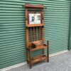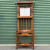 An Arts and crafts oak hallstand tapering in width from top to bottom with bevelled mirror above open slats and hinged glove box. It has capped square columns and bottom shelf with tin umbrella trays.