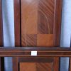 A Edwardian mahogany slatted double bed with boxwood stringing inlay, the centre has a rectangular quartered panel with oval inlay. The bed end has a decorative shaped apron, the bed is raised on casters.