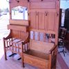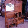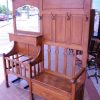 A large Oak Art Nouveau hallstand the moulded capping is supported by a series of brackets the beveled and fielded panel back with an arrangment of hooks and a small storage compartment over a walking stick and umbrella stand. To the right there is a seat that lifts up for storage that has heart shaped design to the slatted back. Raised on square legs with moulded skid’s. Size: 200cm high x 160cm wide x 43cm deep.