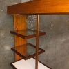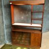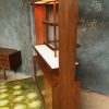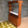 A Turnbridge of London mid century teak bar and room divider. The pelmet has internal lighting with a diffuser, two glass shelves and a spill resistant bar top over an open shelf. The base has two sliding glass doors and a single teak door that enclose an internal shelf. The reverse side has three teak panels on a plinth base