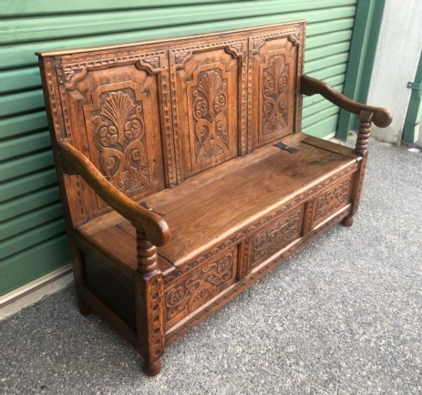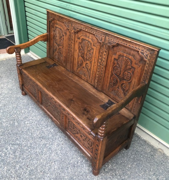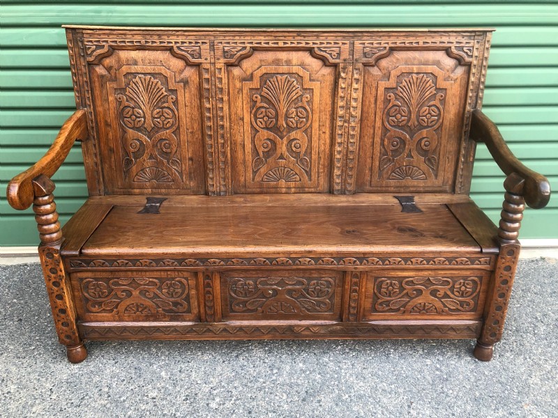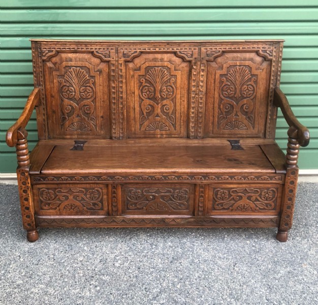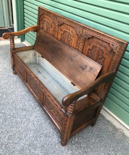 A late 19th/early 20th century settle/hallway bench seat that has decoratively carved panels, scrolling arms that are supported on bobbin turned supports the seat lifts up for storage in 18th century style.