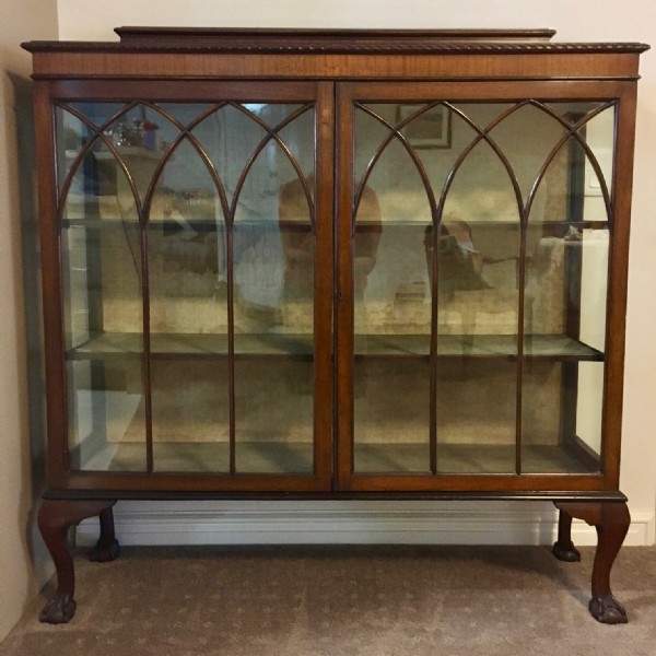 A 1920’s mahogany two door display cabinet the pie crust carved top has a shaped up stand the two gothic arch astragal glazed doors are lockable and enclose three shelves that are lined in the original fabric, raised on crisply carved ball and claw cabriole legs
