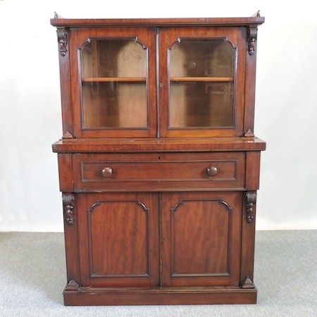 19th century flame mahogany bookcase secretaire, the top has a small gallery above two glazed doors that enclose a single shelf. There are four carved corbels. The base has a secretaire drawer that encloses a fitted interior over two panel doors and plinth base.