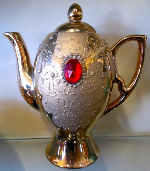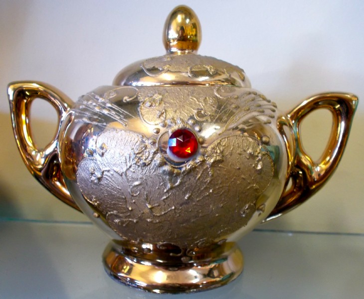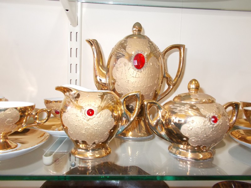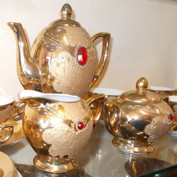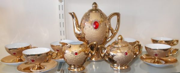 A 22ct gold with red jewel china coffee set marked B E