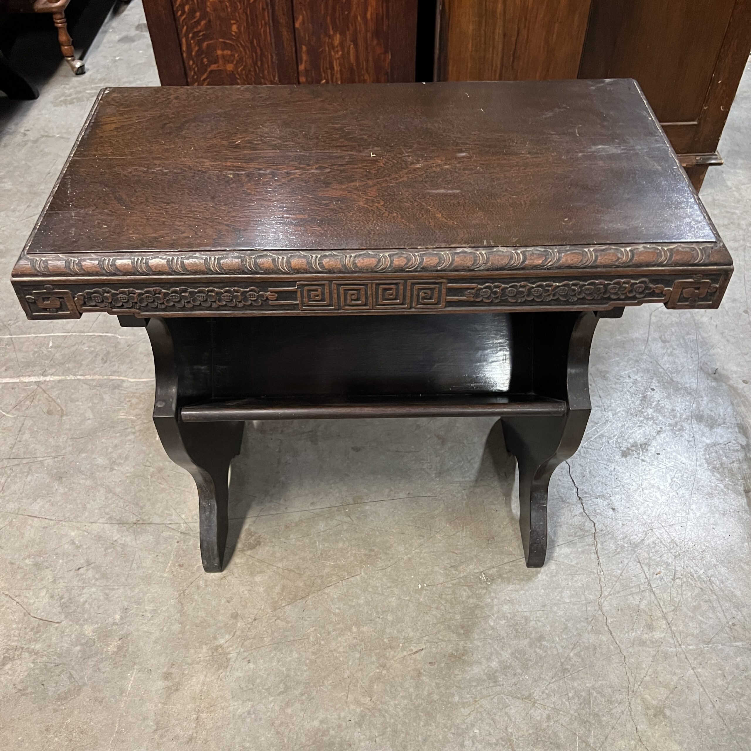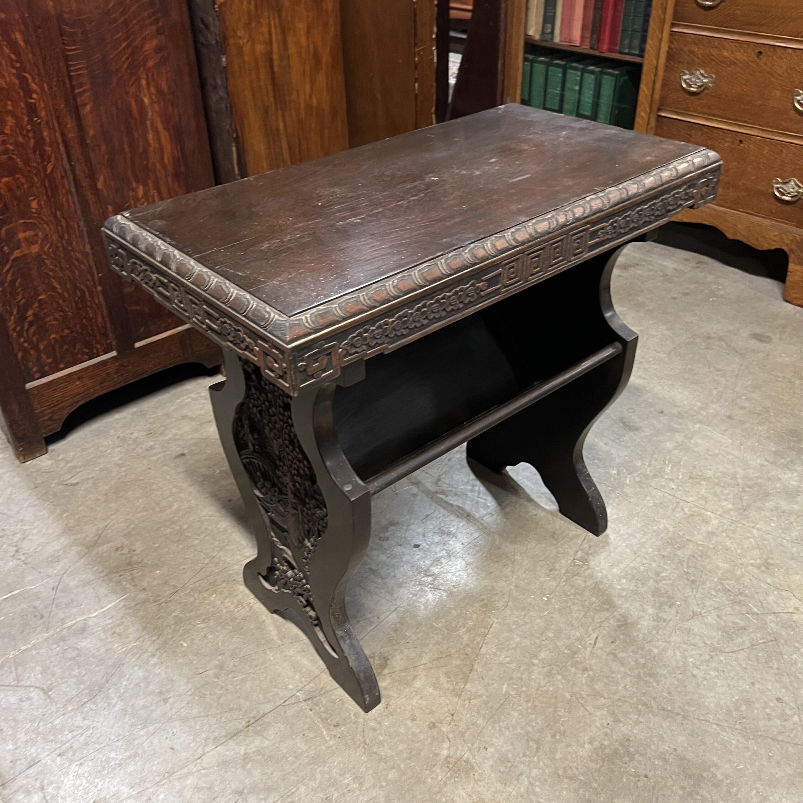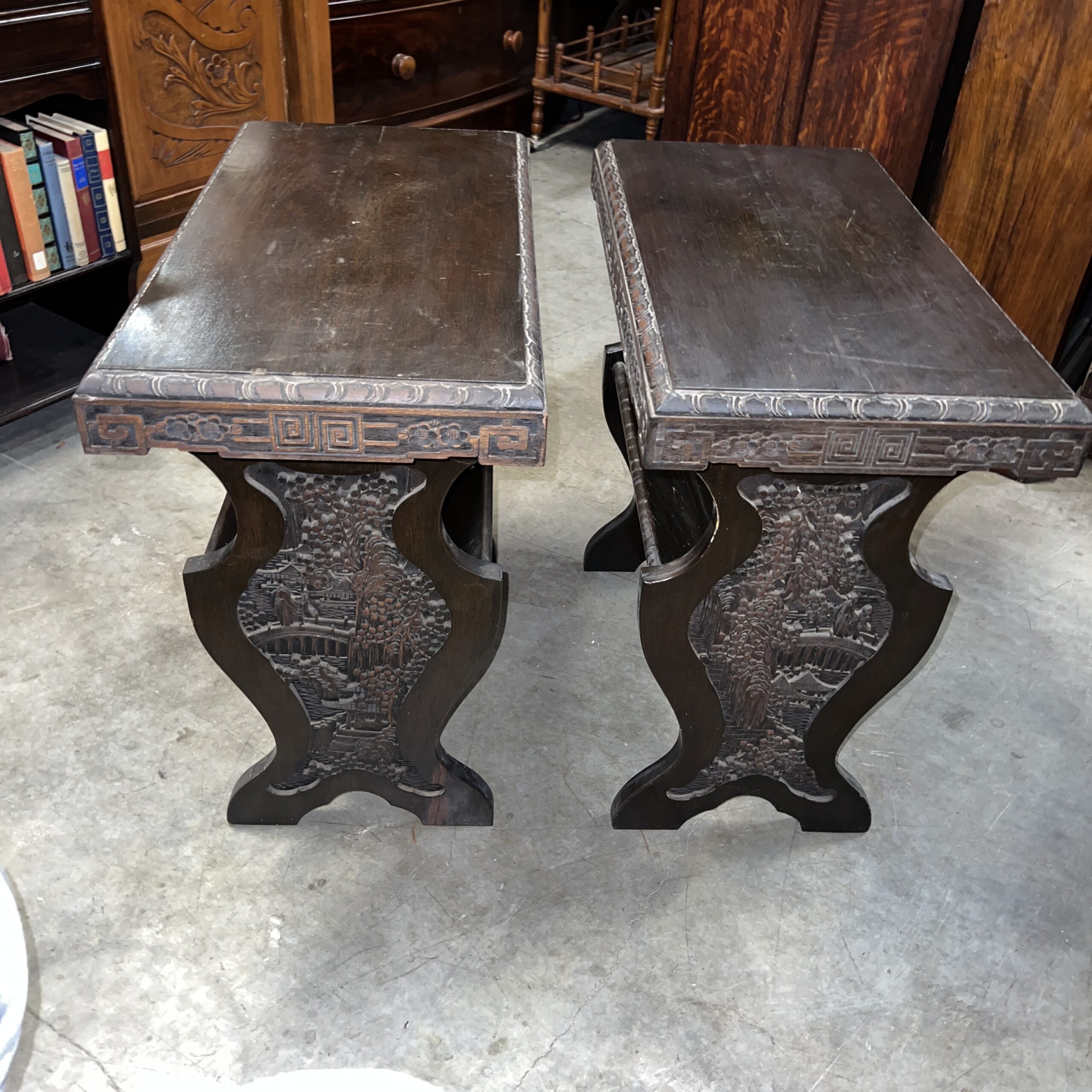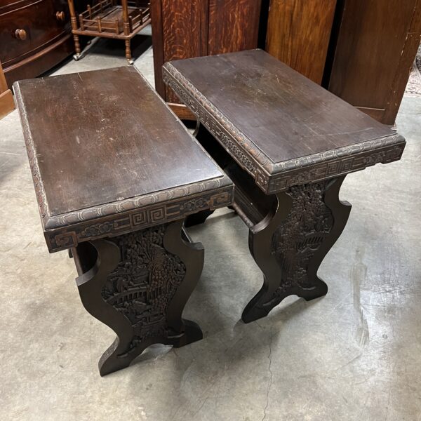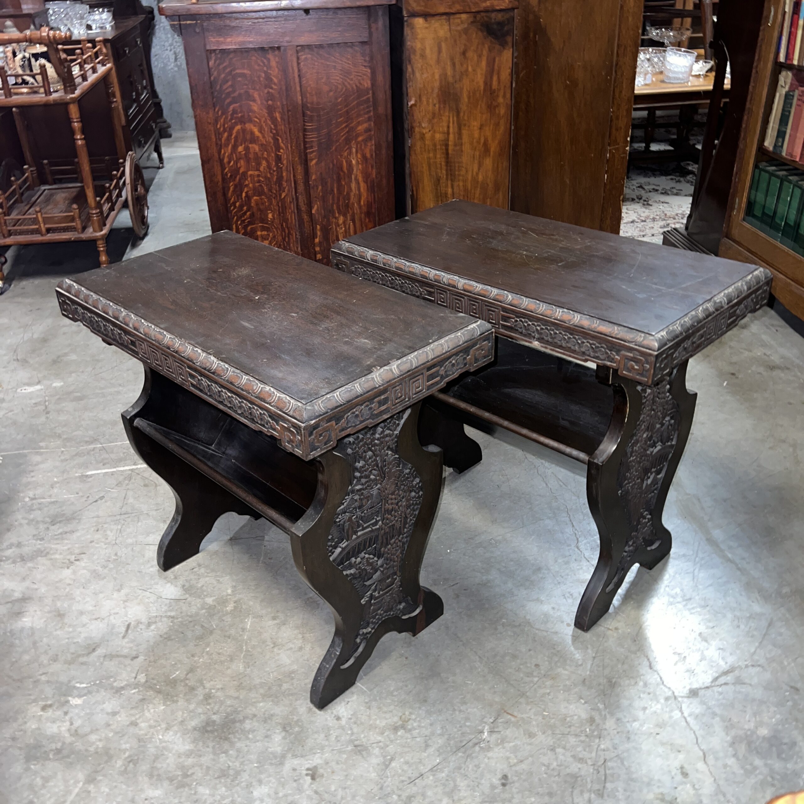 A pair of nicely carved Chinese side tables with a lower angled book shelf. Restored $1,495