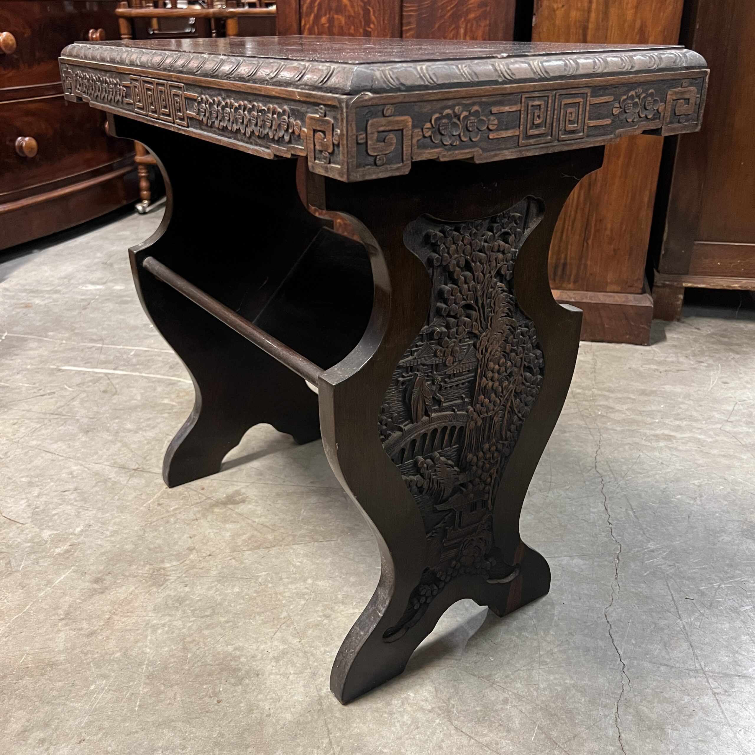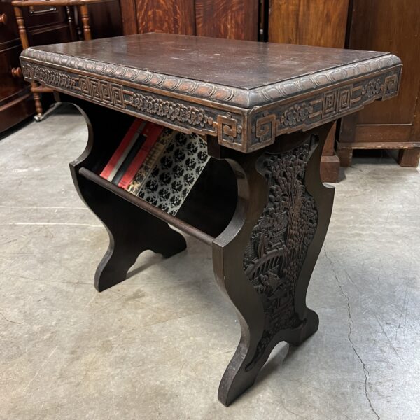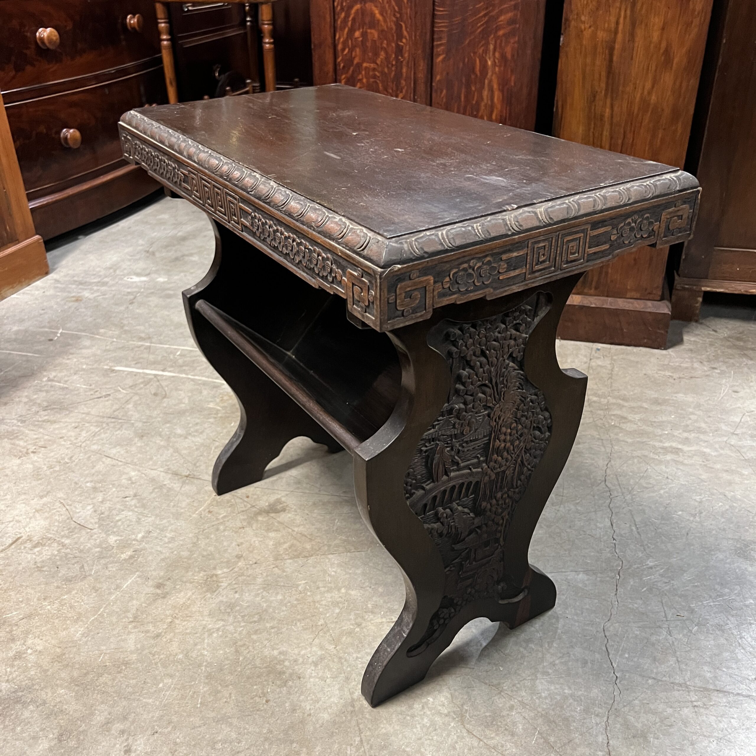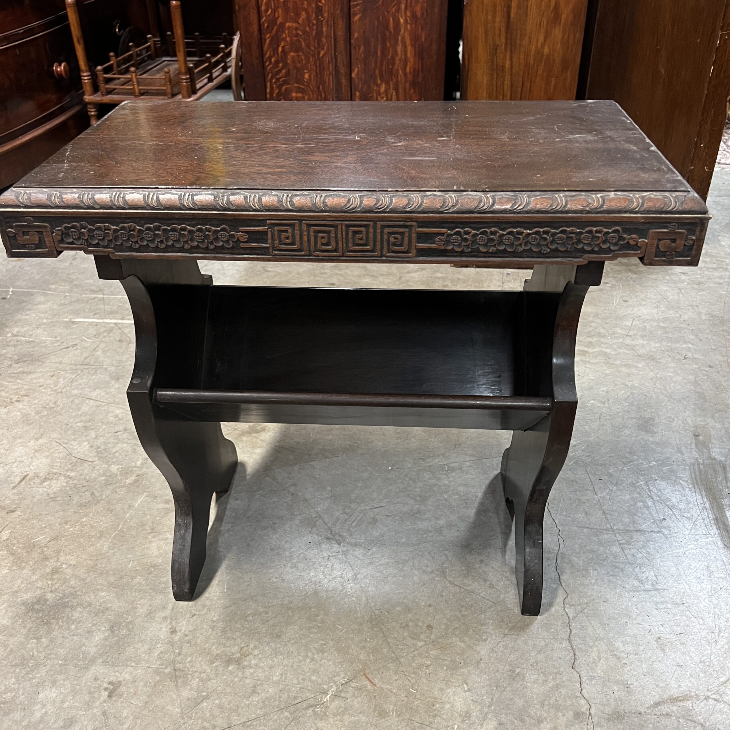 A pair of nicely carved Chinese side tables with a lower angled book shelf. Restored $1,495