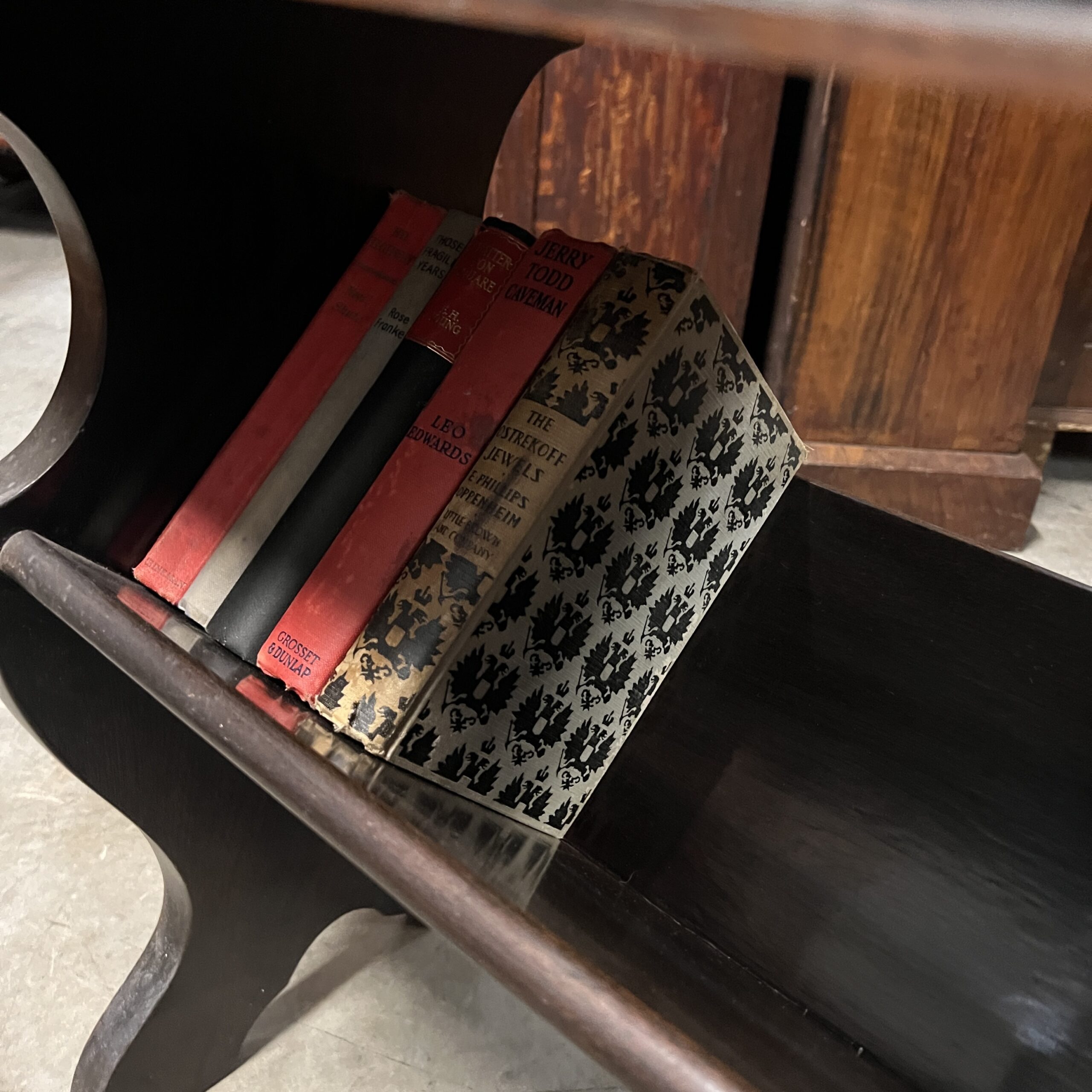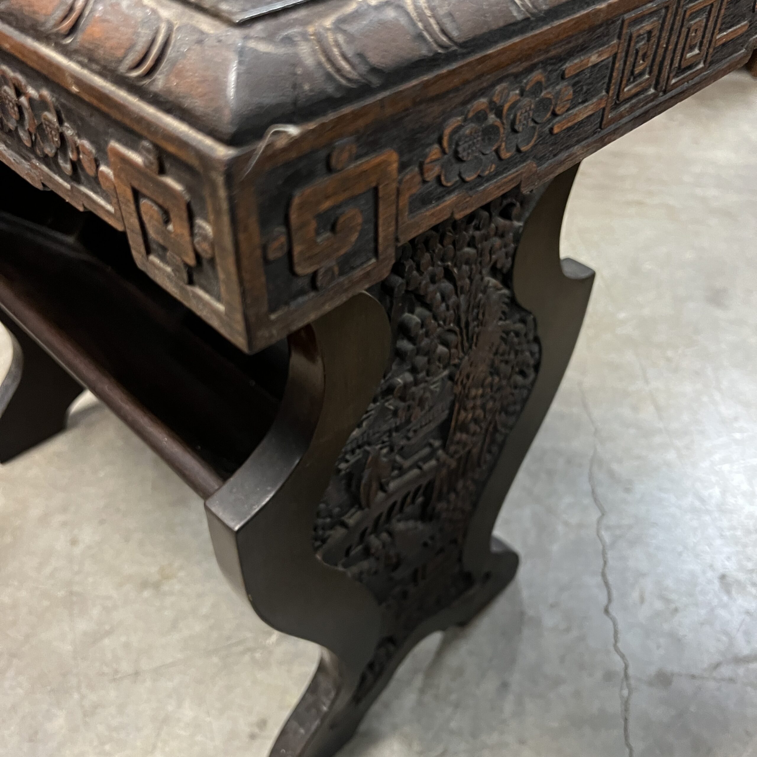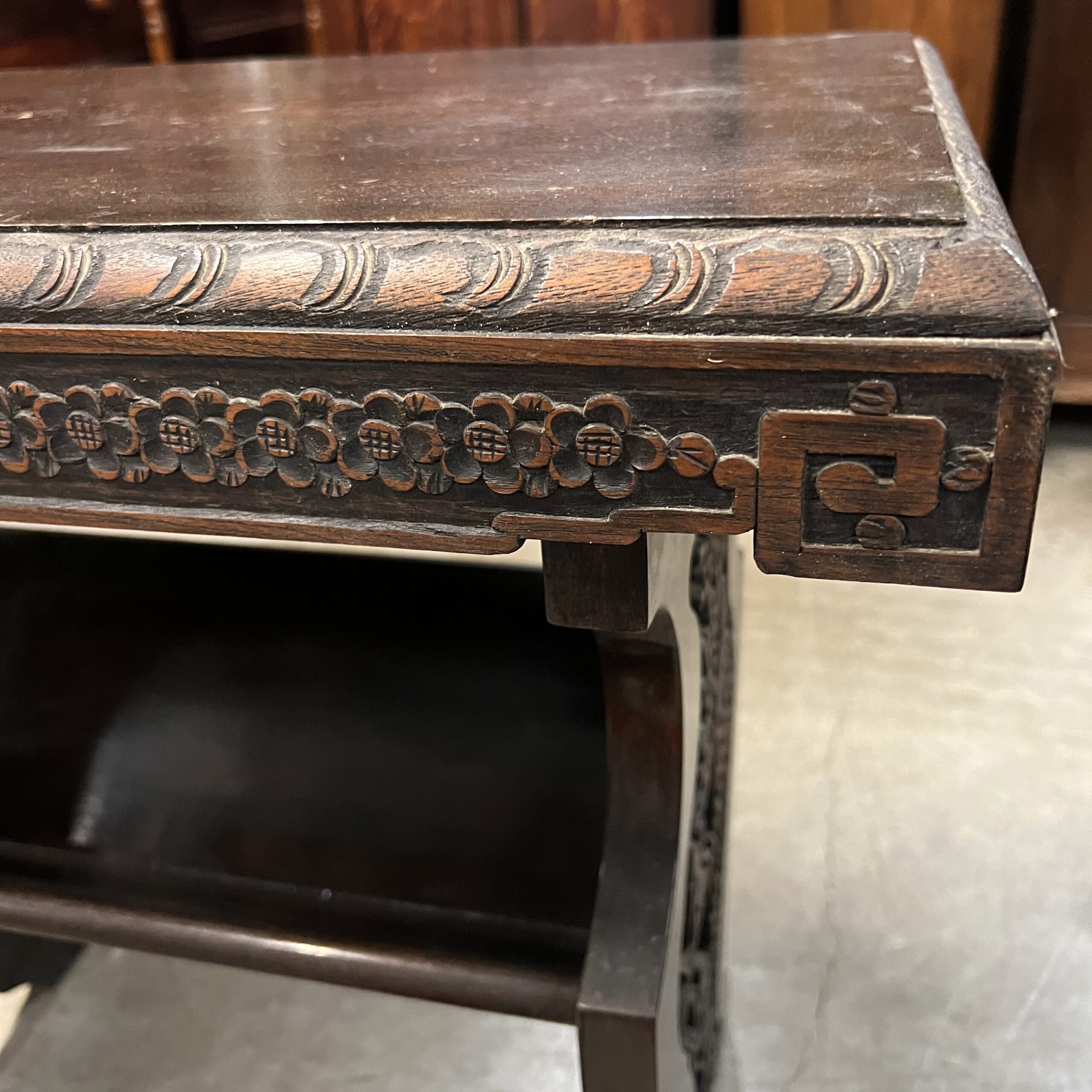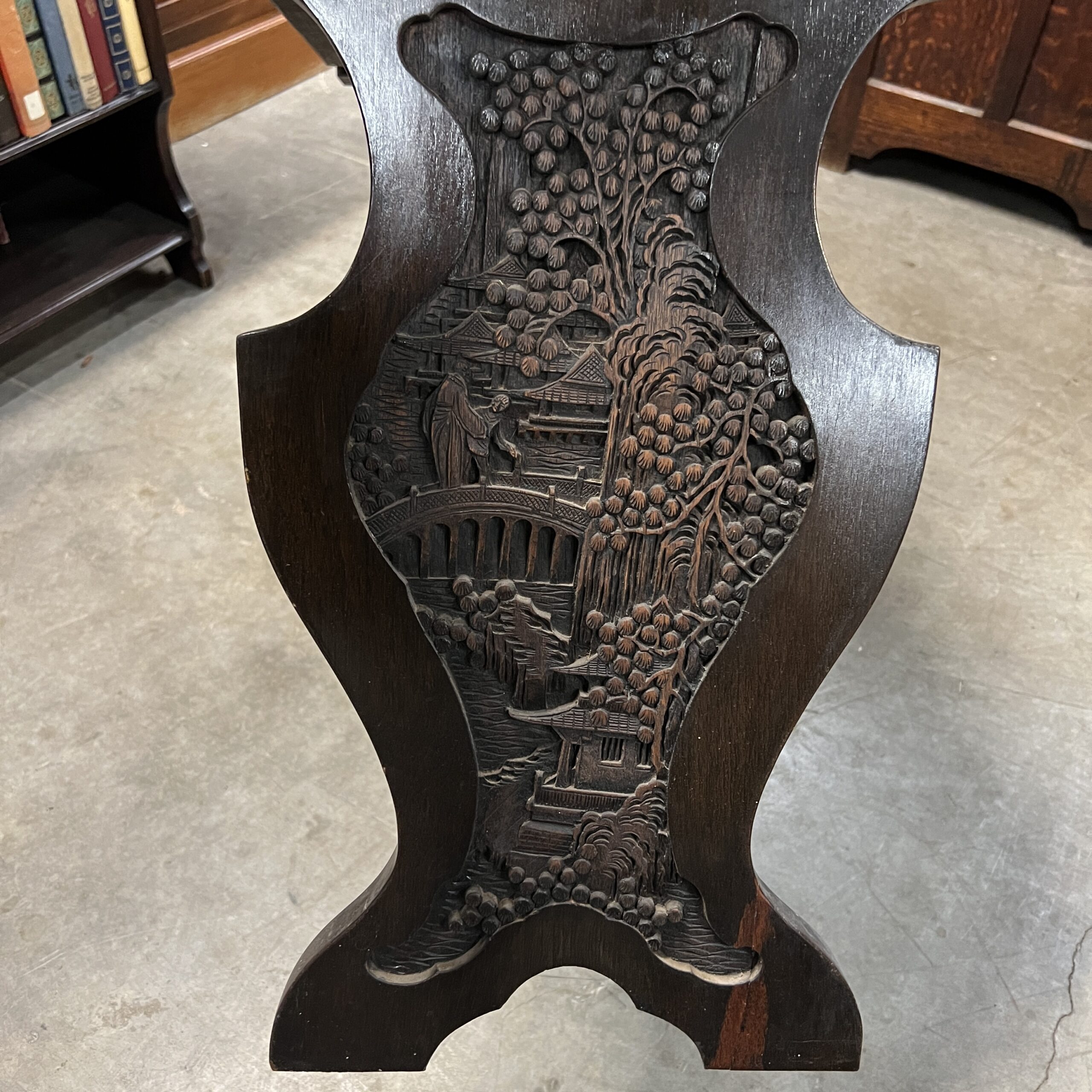 A pair of nicely carved Chinese side tables with a lower angled book shelf. Restored $1,495