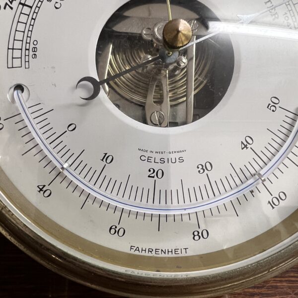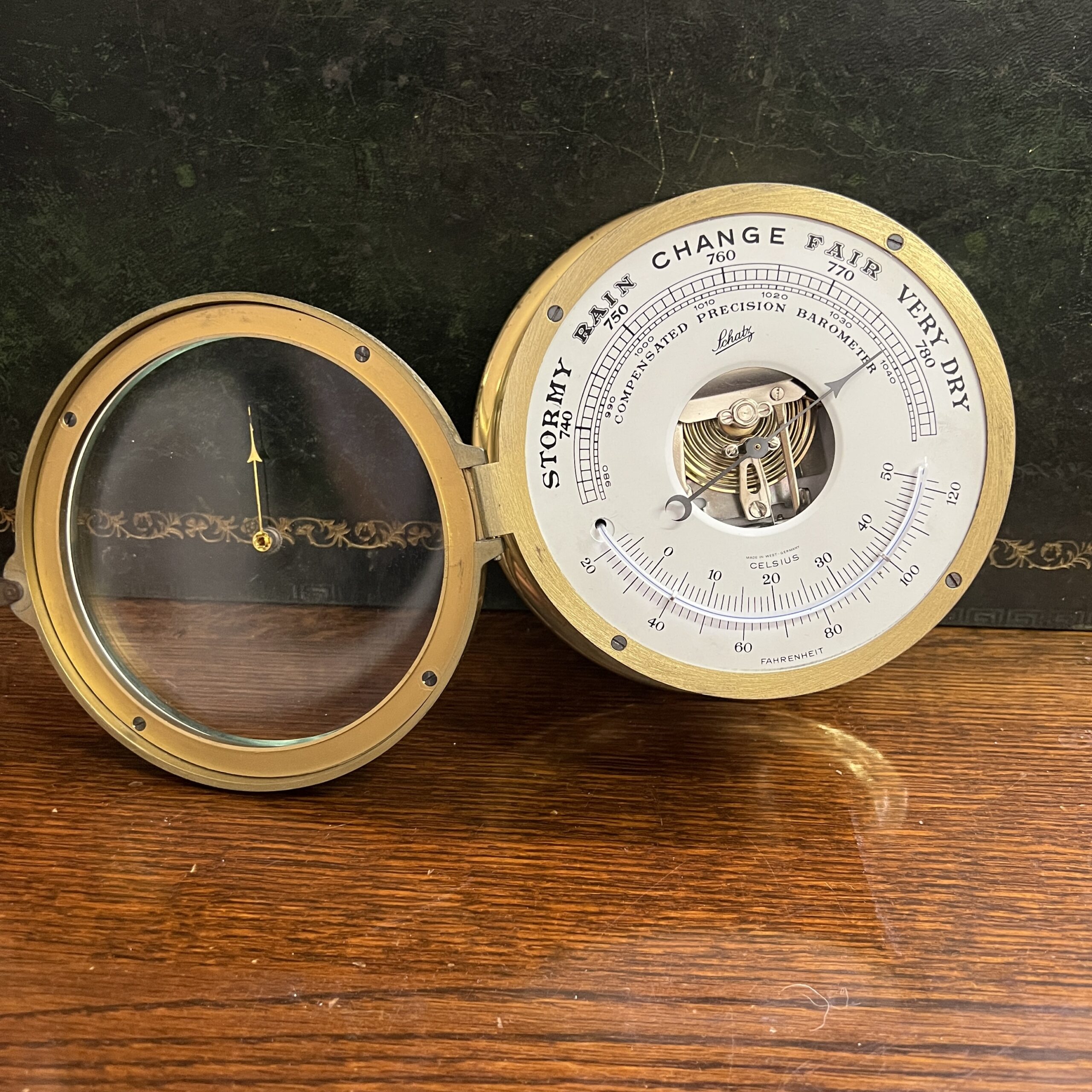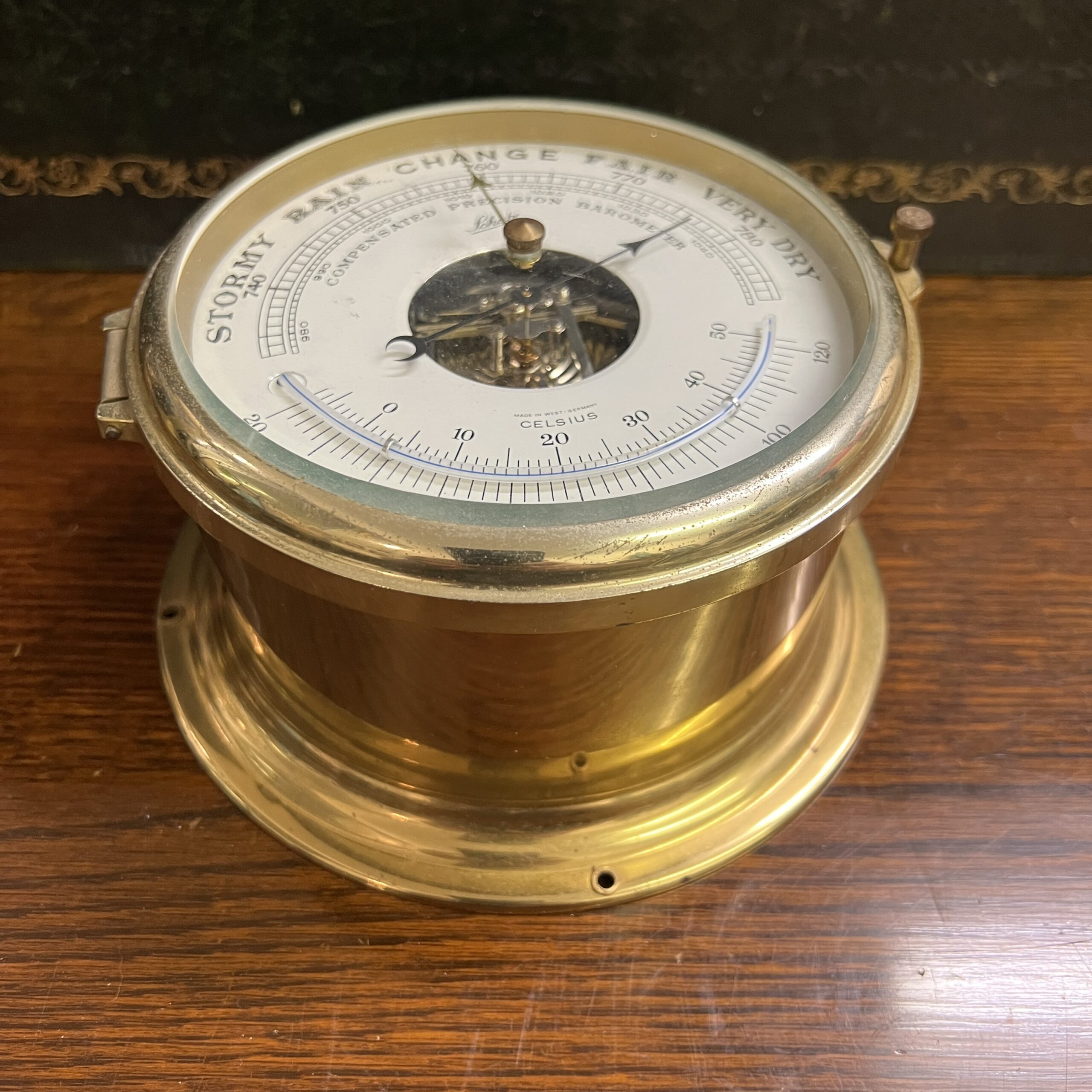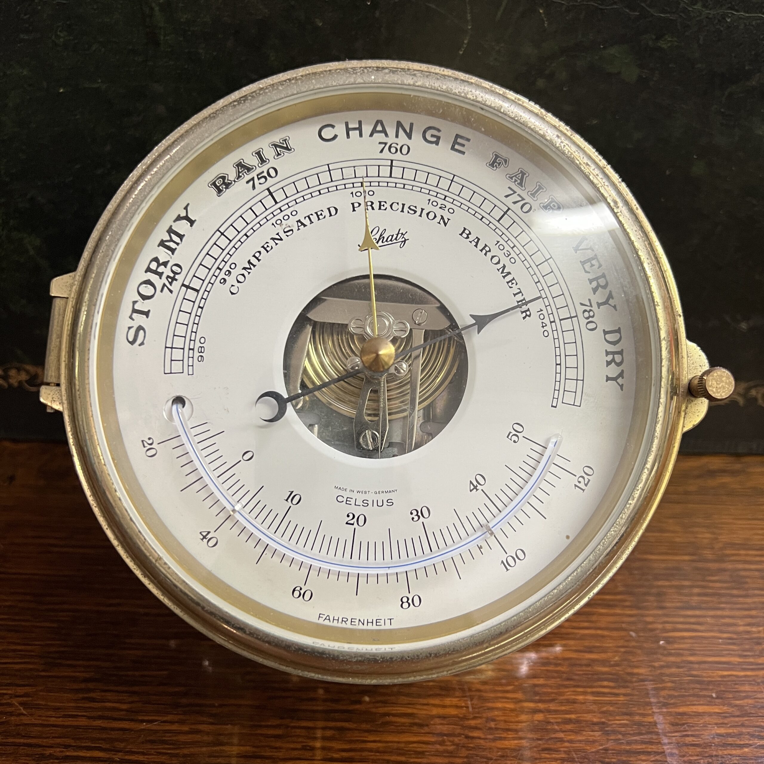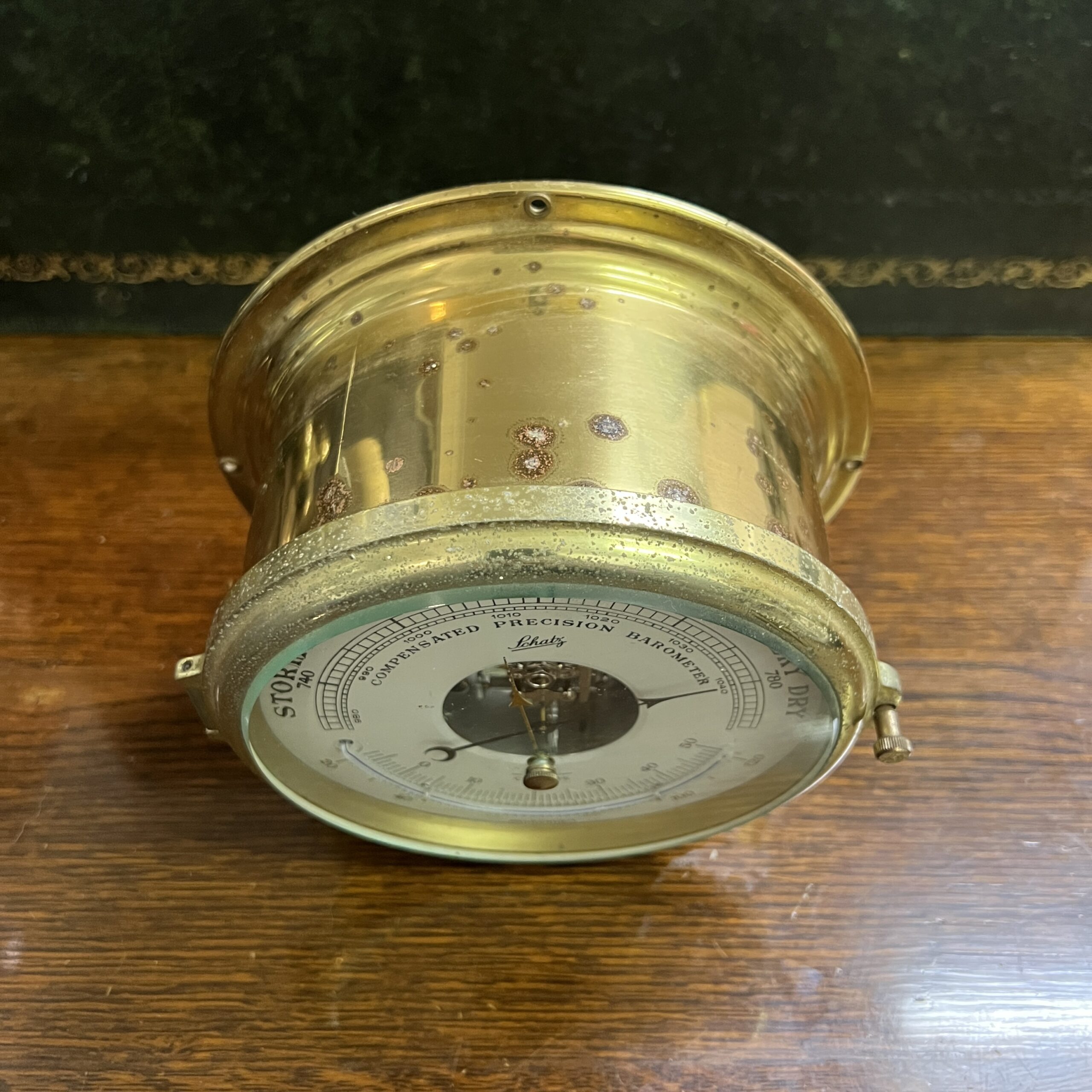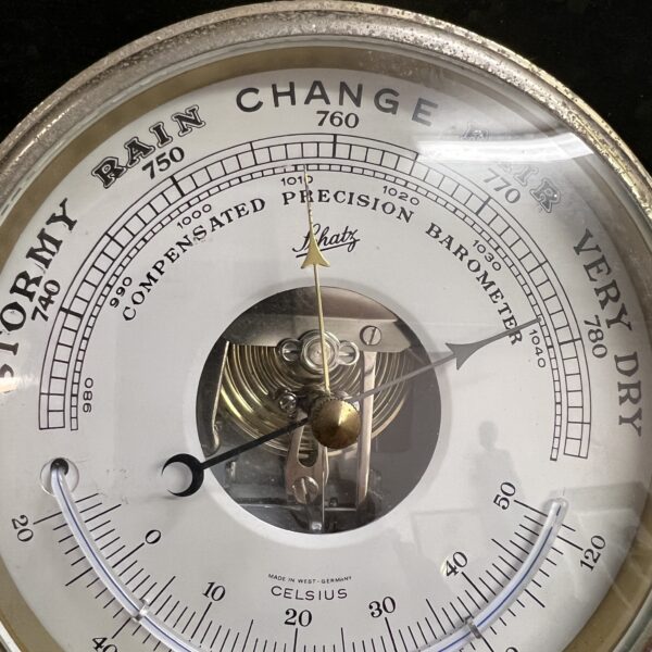 A Brass Ships barometer by Schatz, made in west Germany. Mid 20th Century it would benefit from a re-lacquer 160mm in diameter