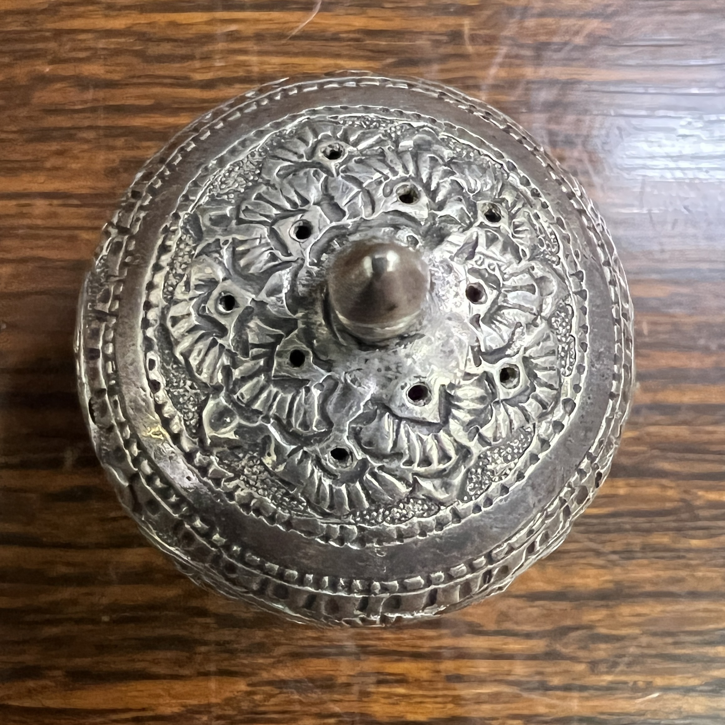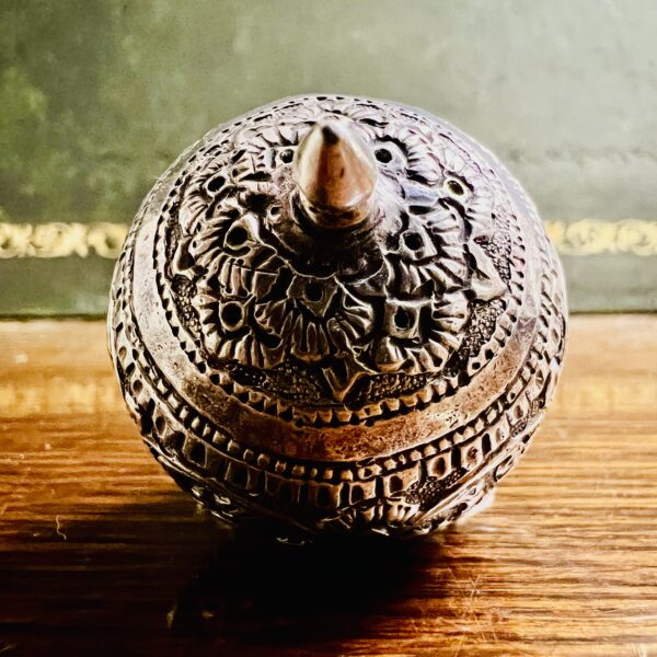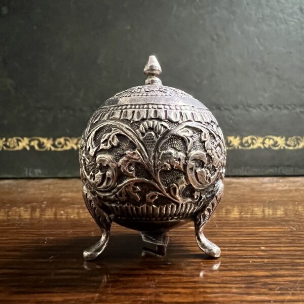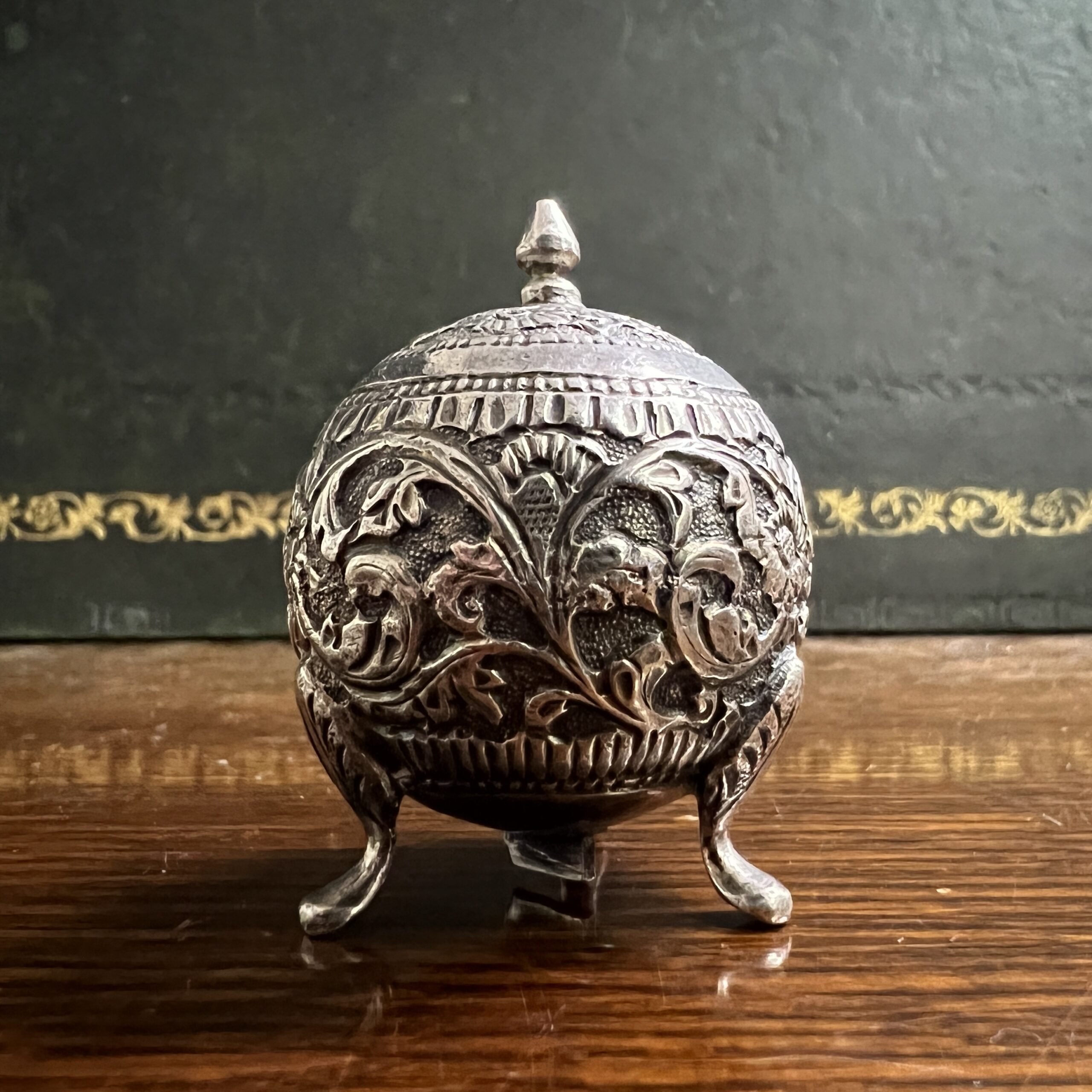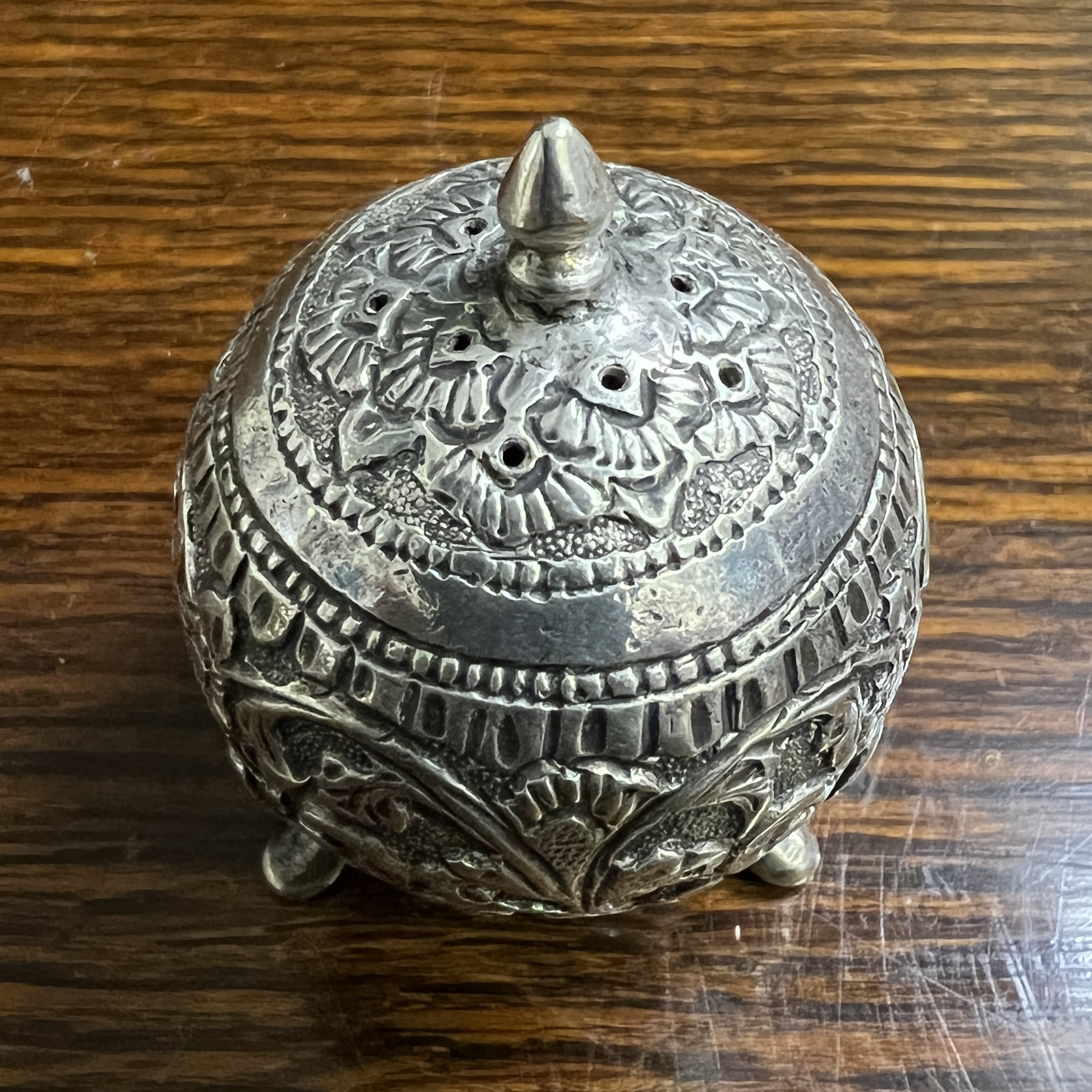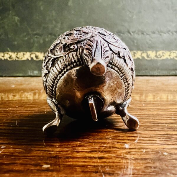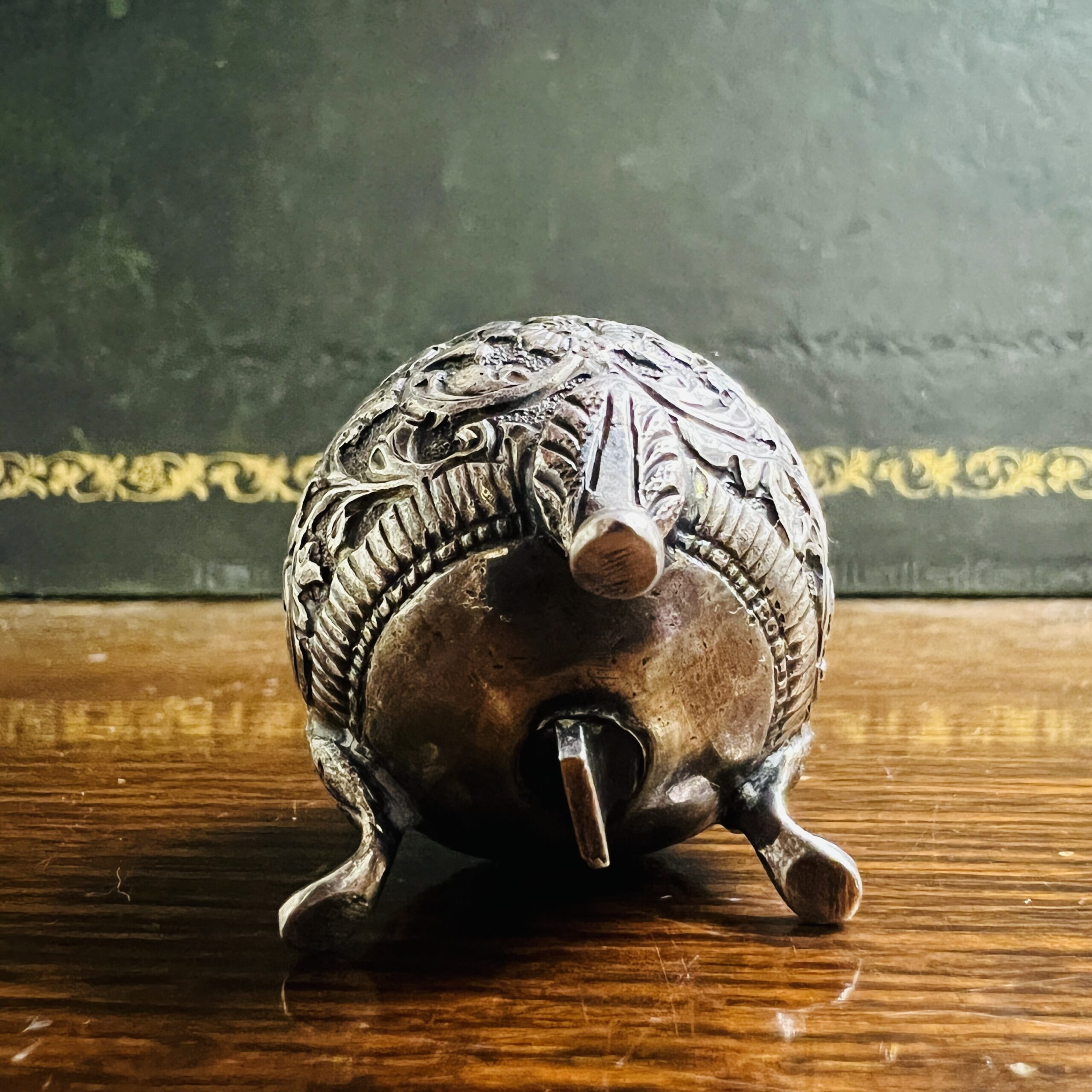 A small Victorian embossed scent ball raised on three legs with holes pierced though the top and a threaded bung below.