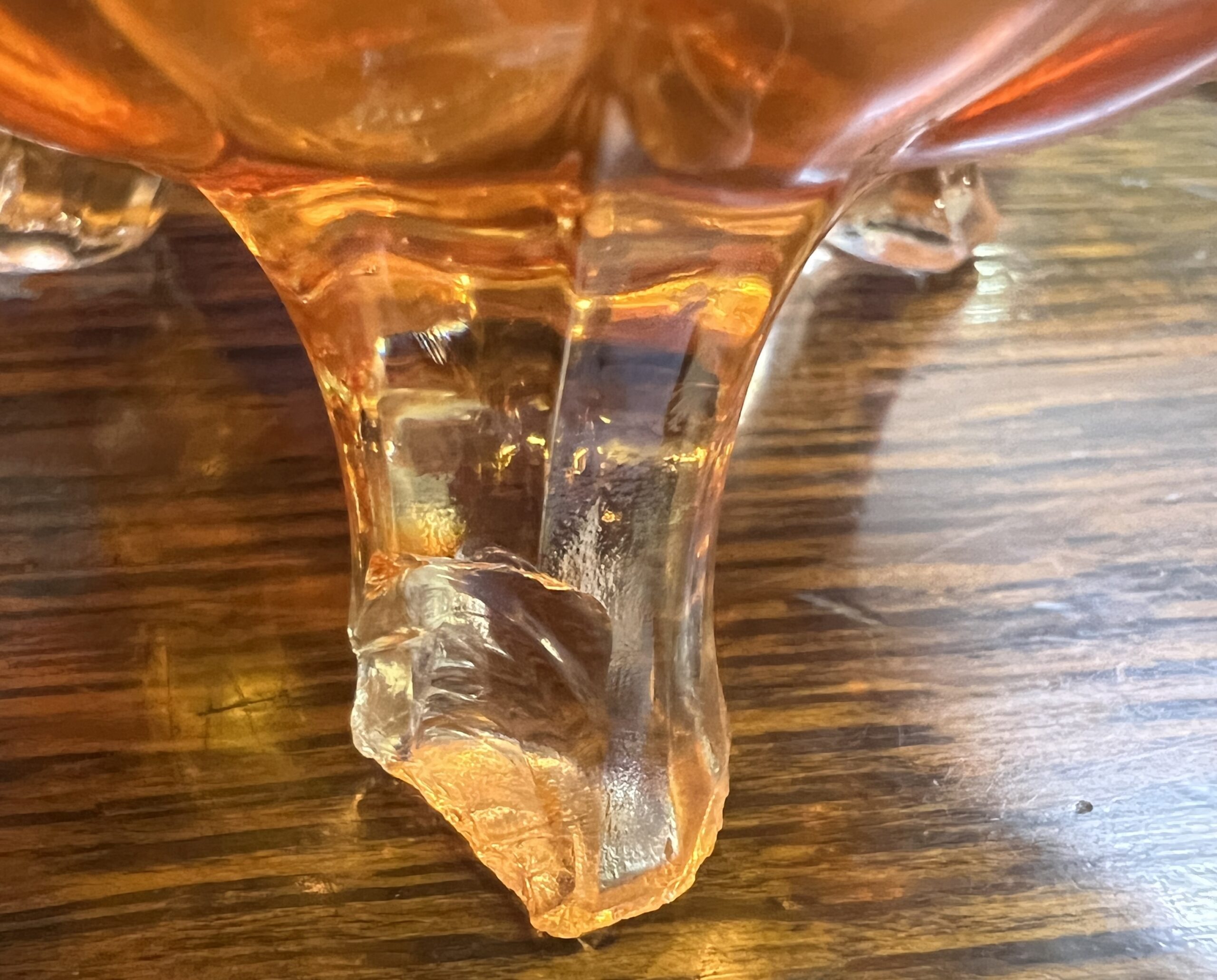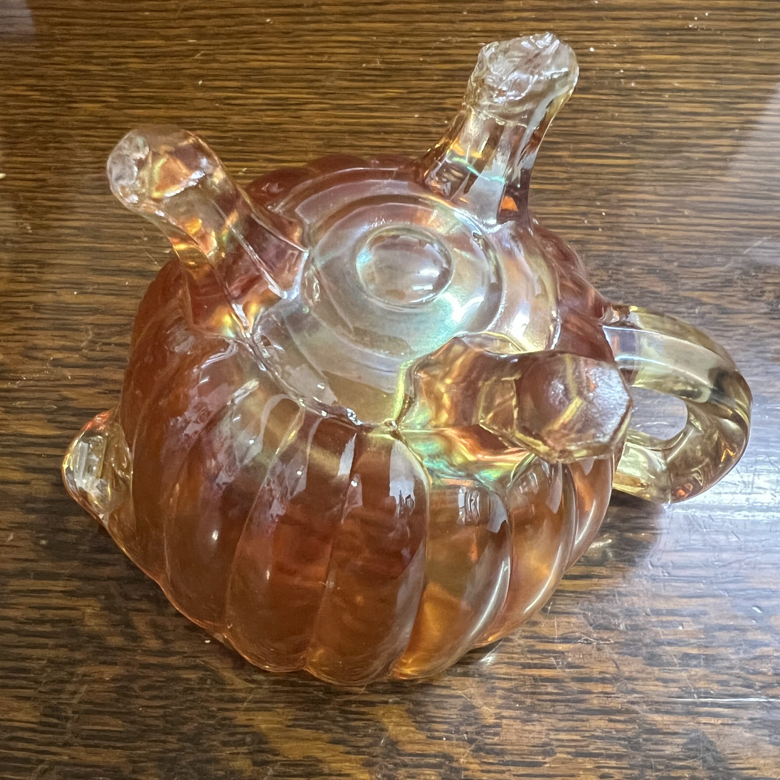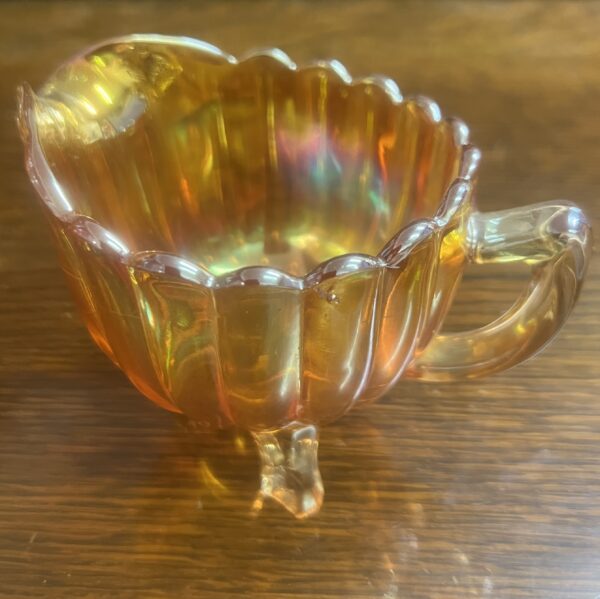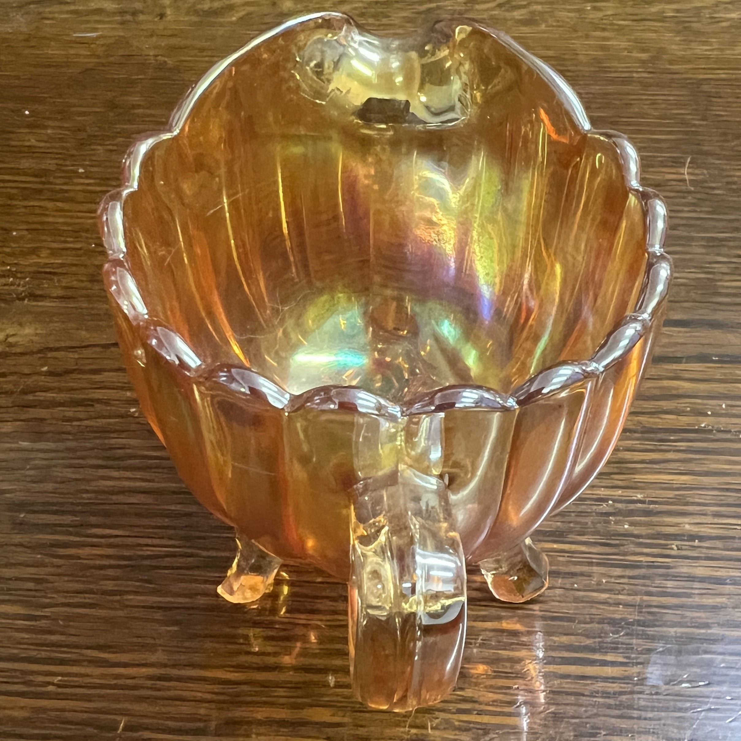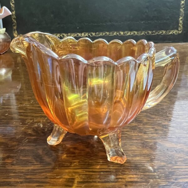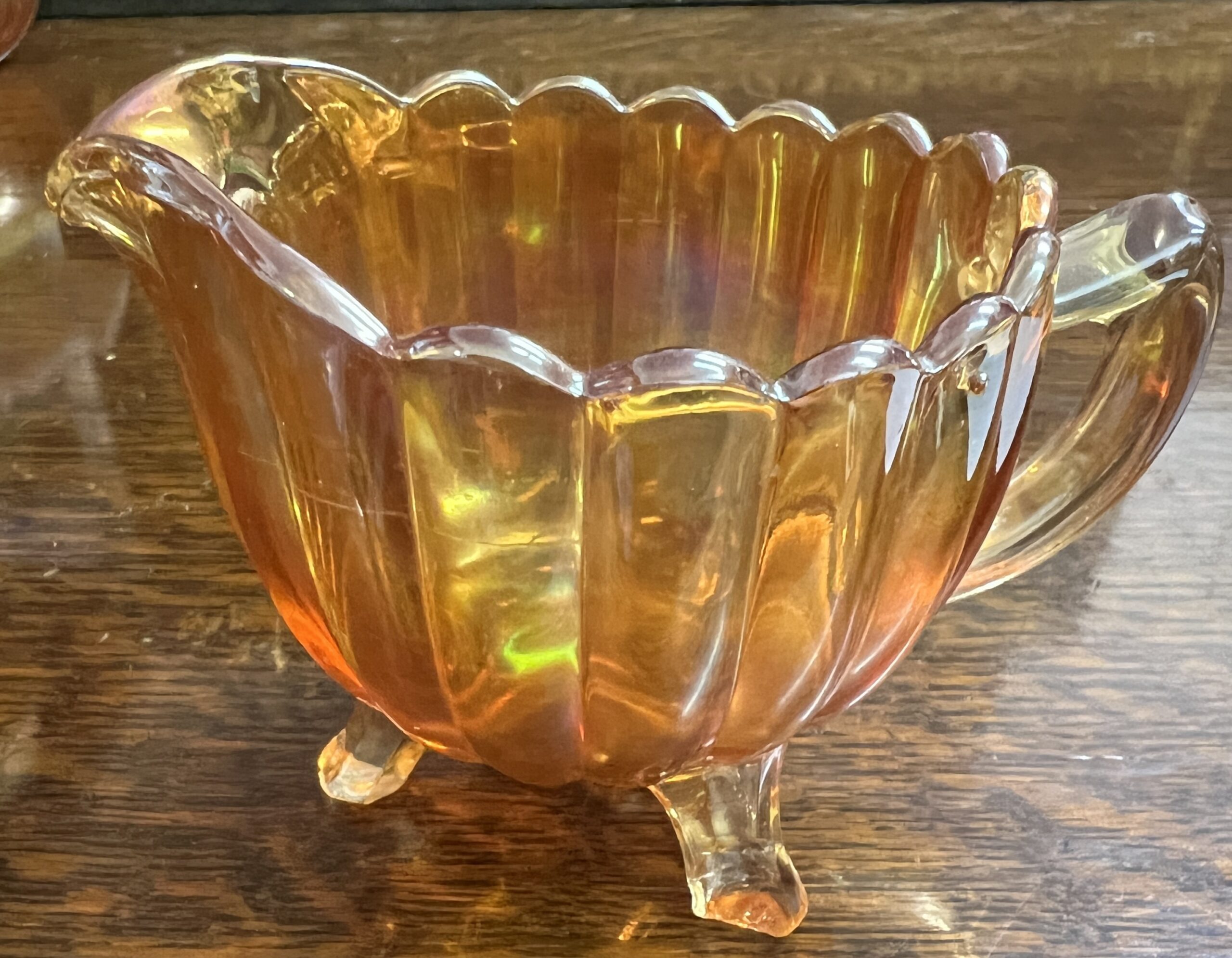 A Carnival glass marigold milk jug on three legs AF one leg is chipped