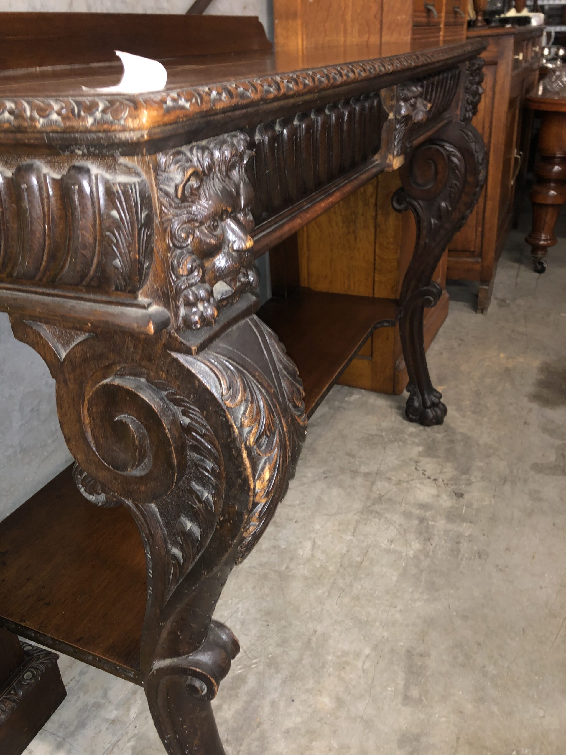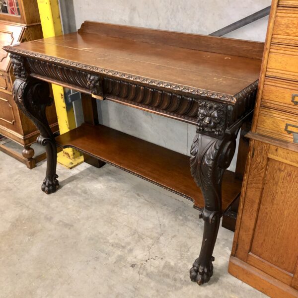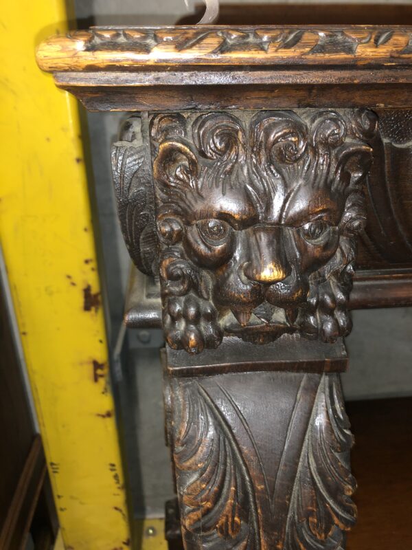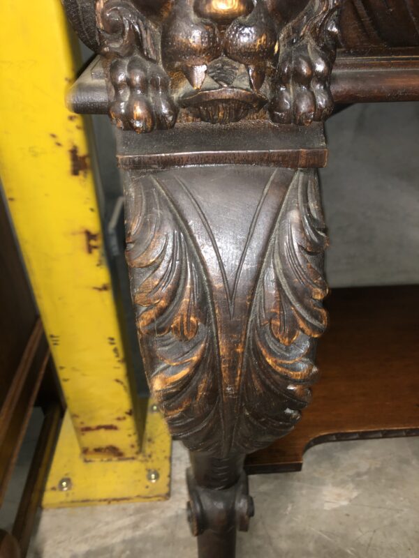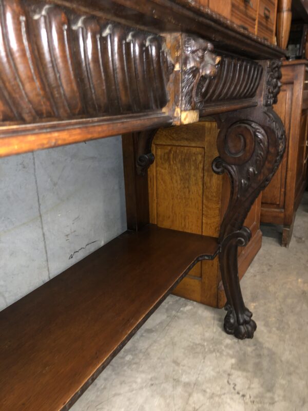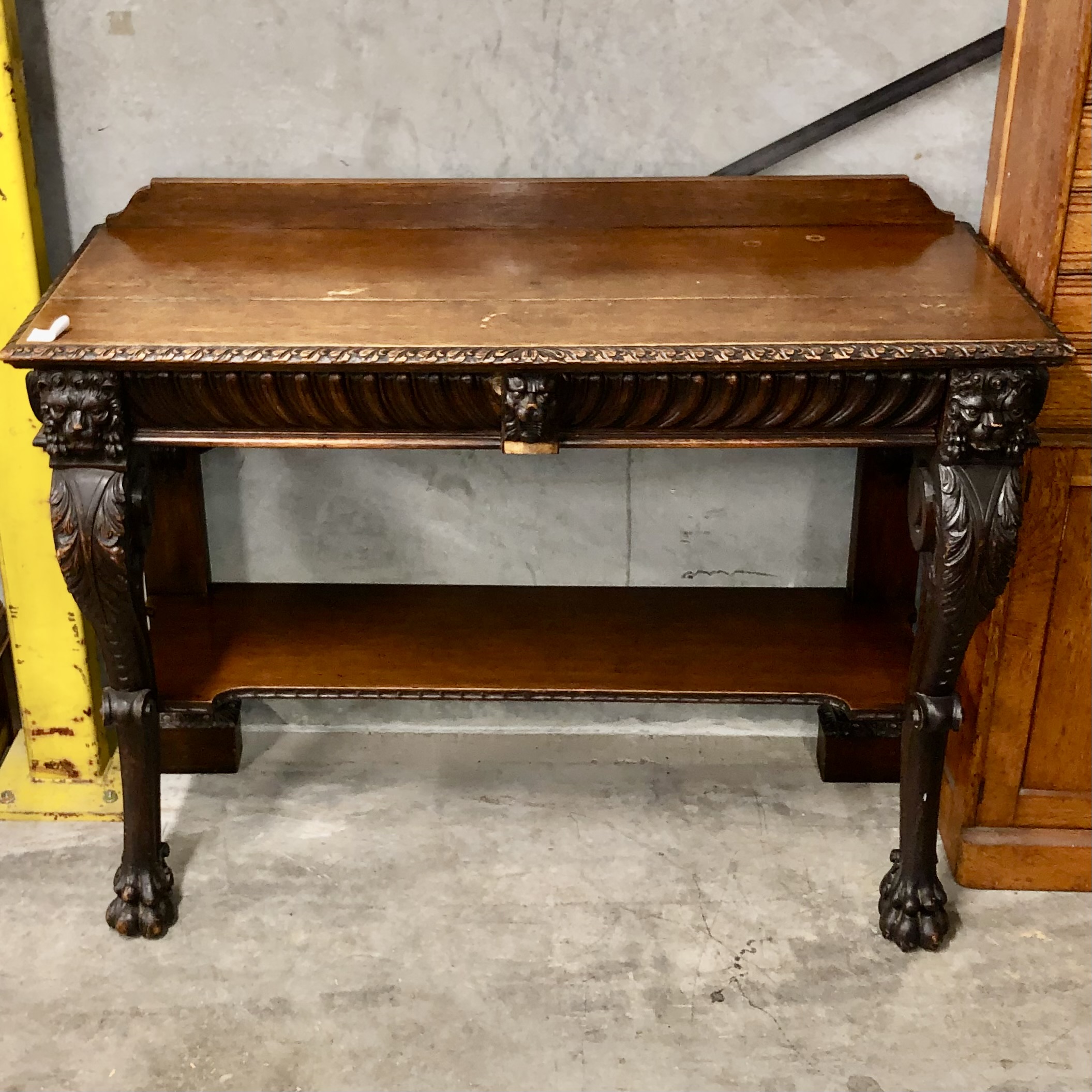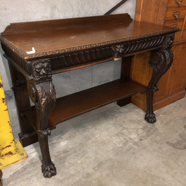 A carved oak Victorian side table with up stand, two drawers with gadrooned decoration. It has carved lion mask details the legs terminate with hairy paw feet, restored price $2,795