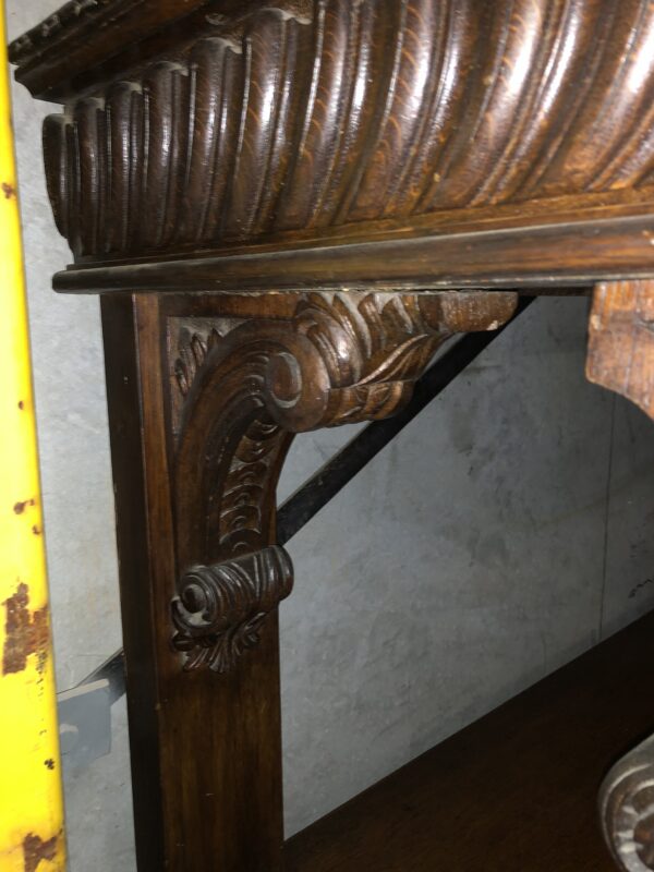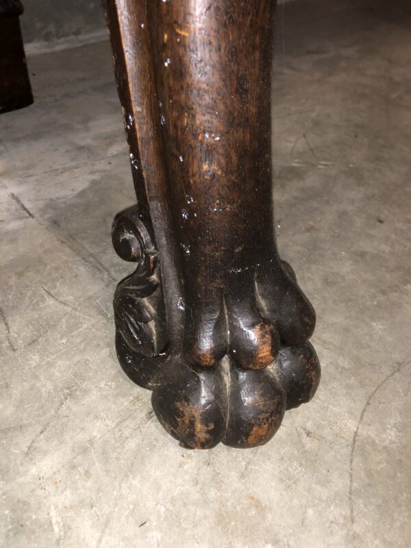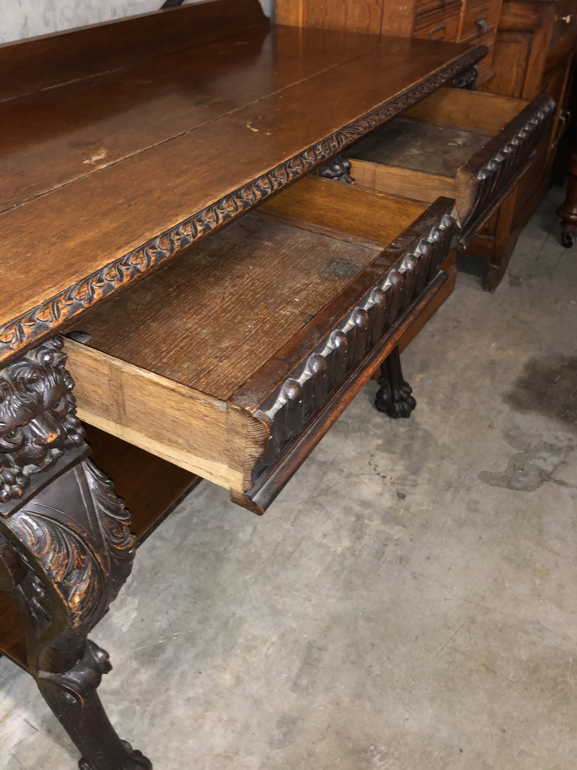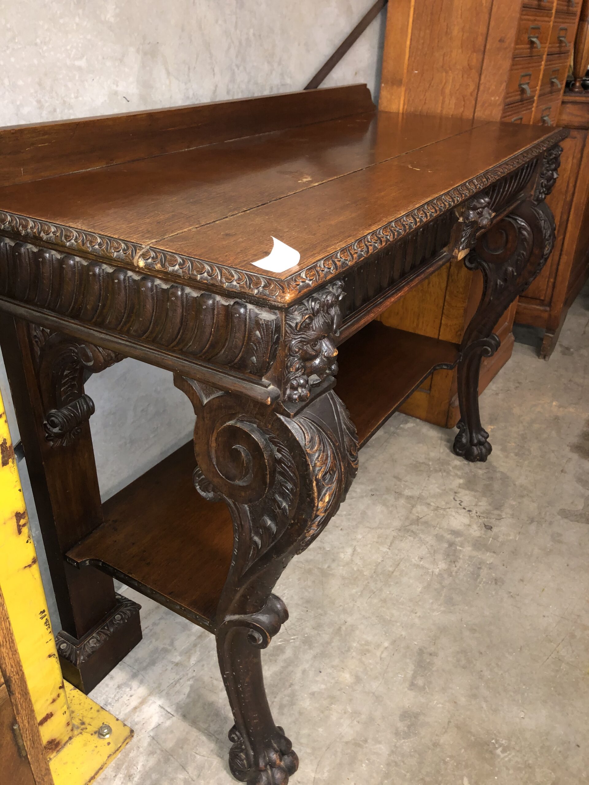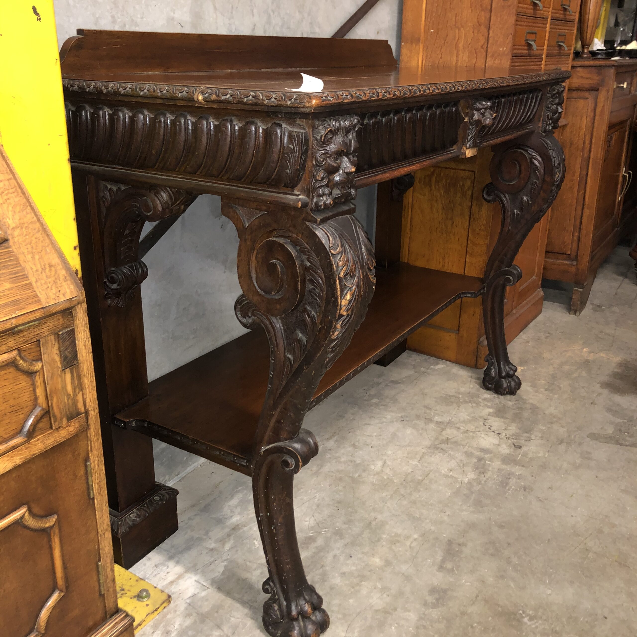 A carved oak Victorian side table with up stand, two drawers with gadrooned decoration. It has carved lion mask details the legs terminate with hairy paw feet, restored price $2,795