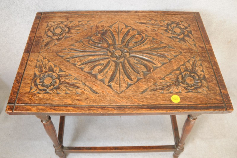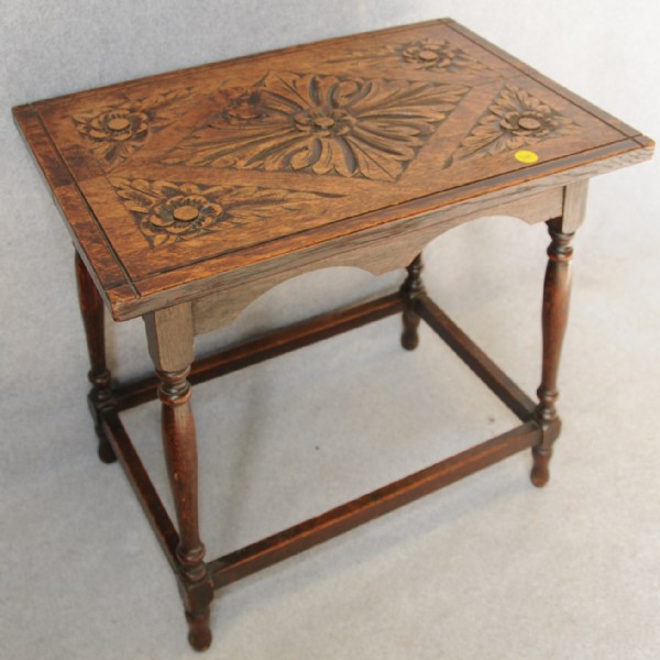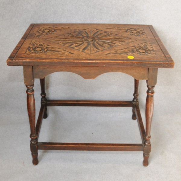 A Victorian oak table with a straight grain top, hand carved decoration & flower designs. Raised on turned legs . Size: 60 high x 60 wide x 40 cm deep.