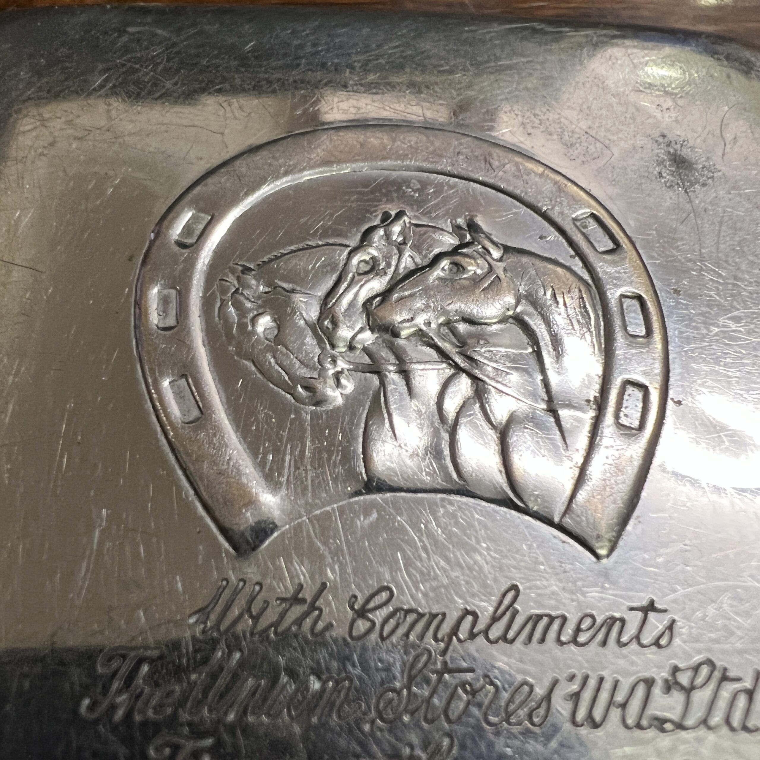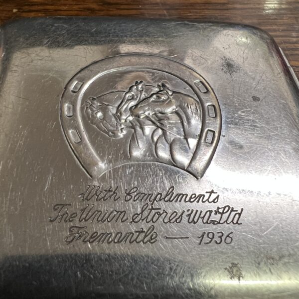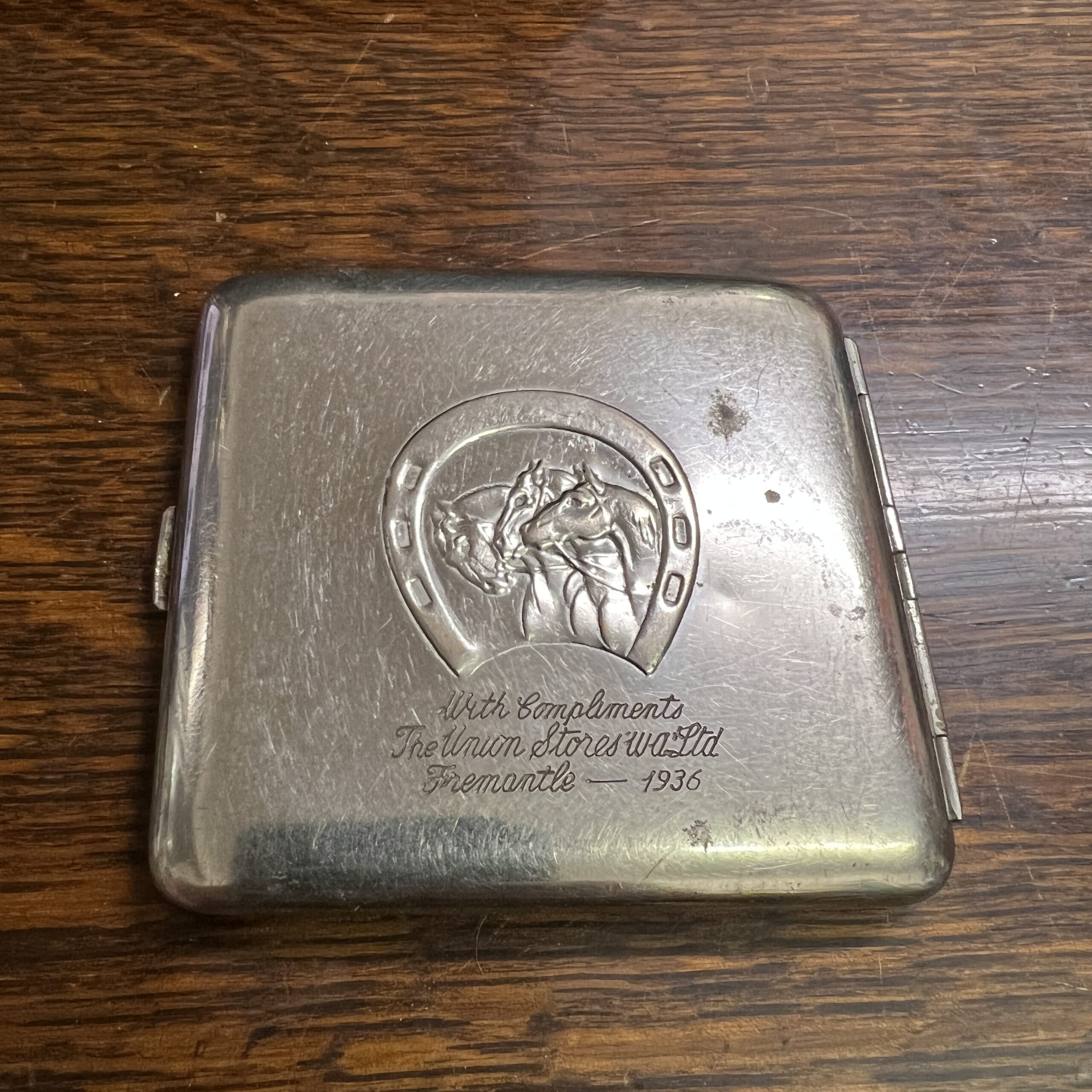 A Cigarette case presented by the union of Fremantle Ltd 1936. The Union Stores was a hardware shop in Fremantle. It was established in 1896 and was originally associated with the J.W. Bateman family. At that time the company was described as Ironmongers and Grocers