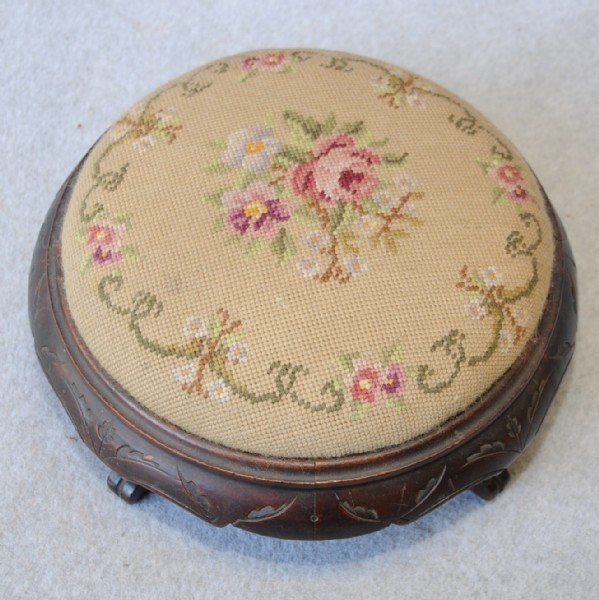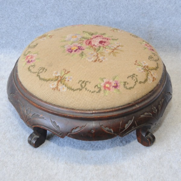 A small circular foot stool with a carved walnut frame raised on squat cabriole legs and having a tapestry upholstered cushion.