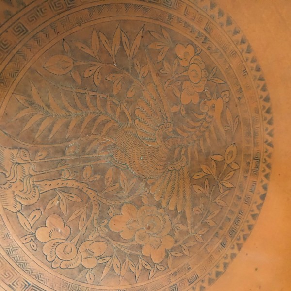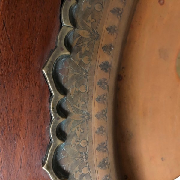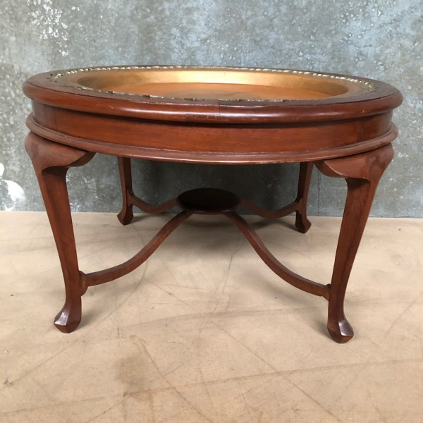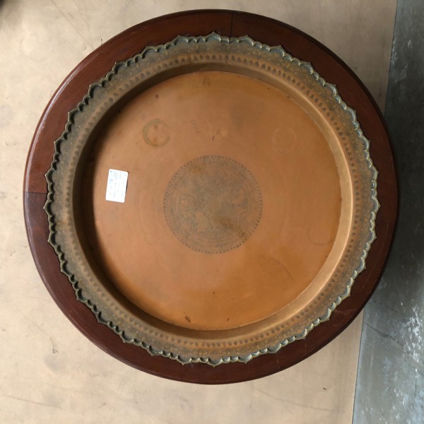 A circular jarrah coffee table with decorative eastern brass insert raised on cabriole legs.