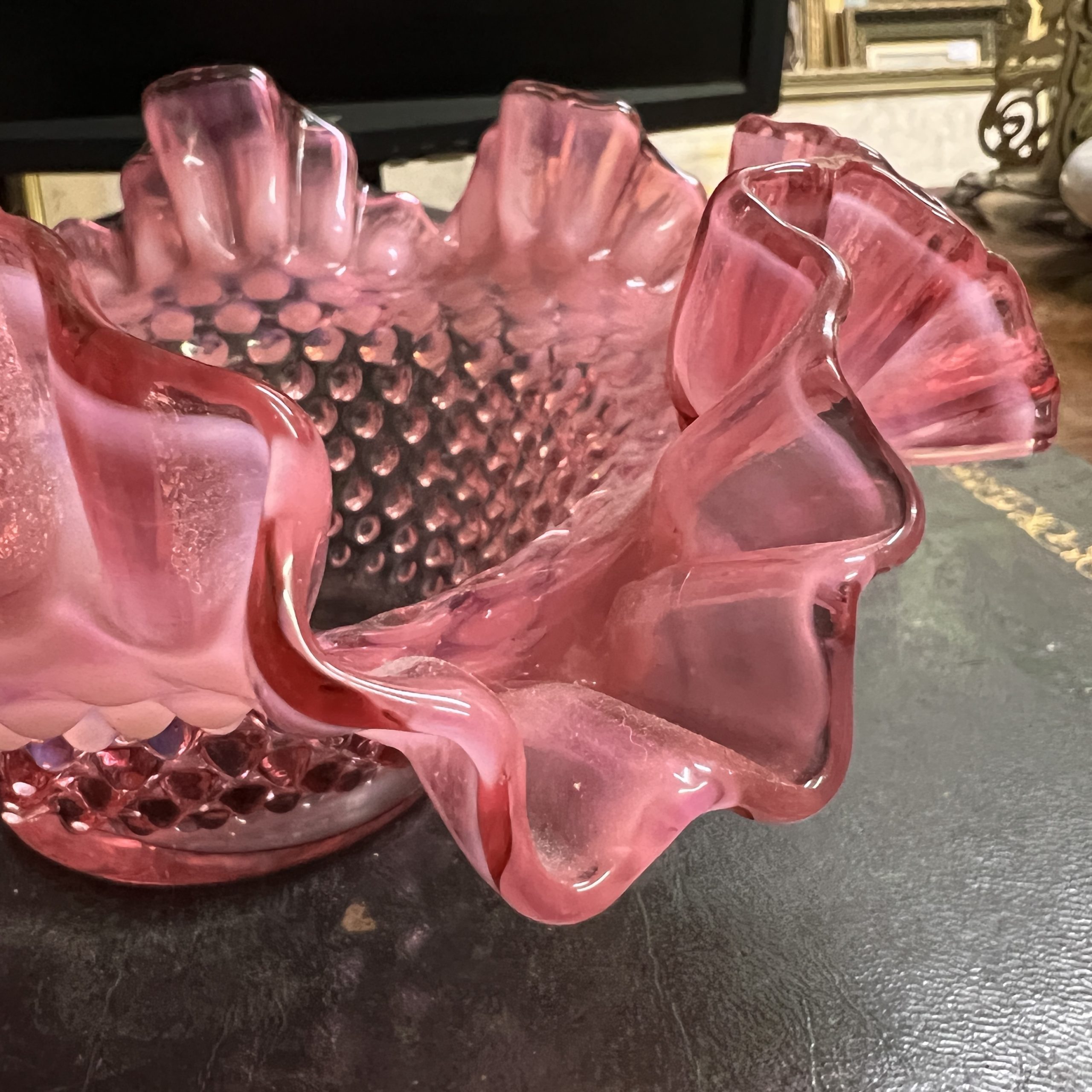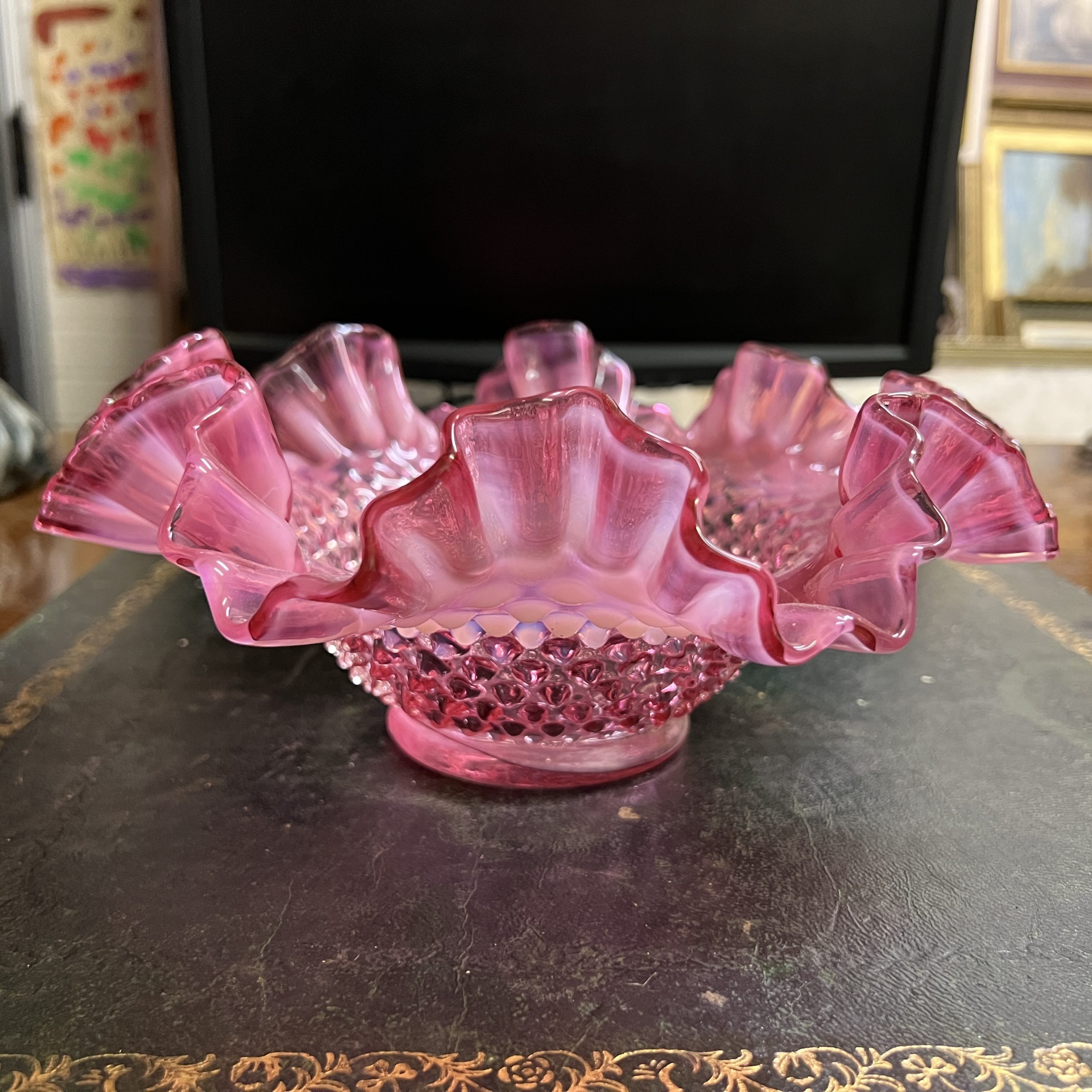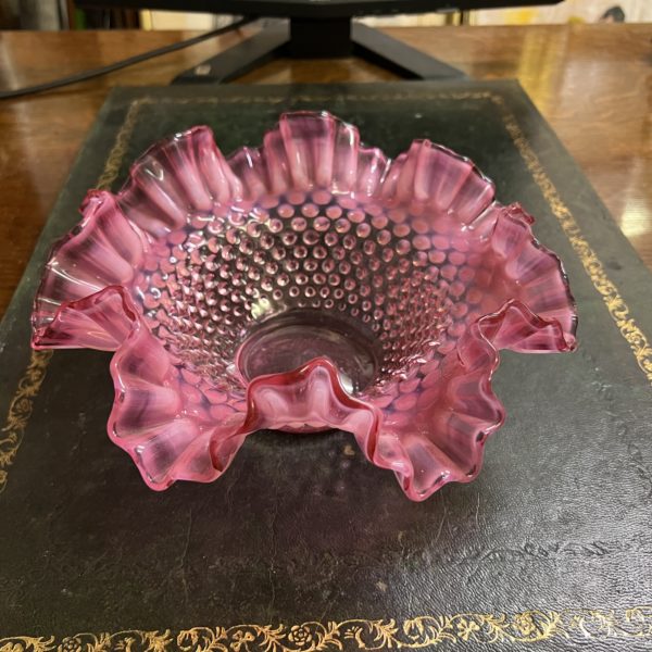 A Cranberry and opalescent Fenton glass frilled hobnail bowl