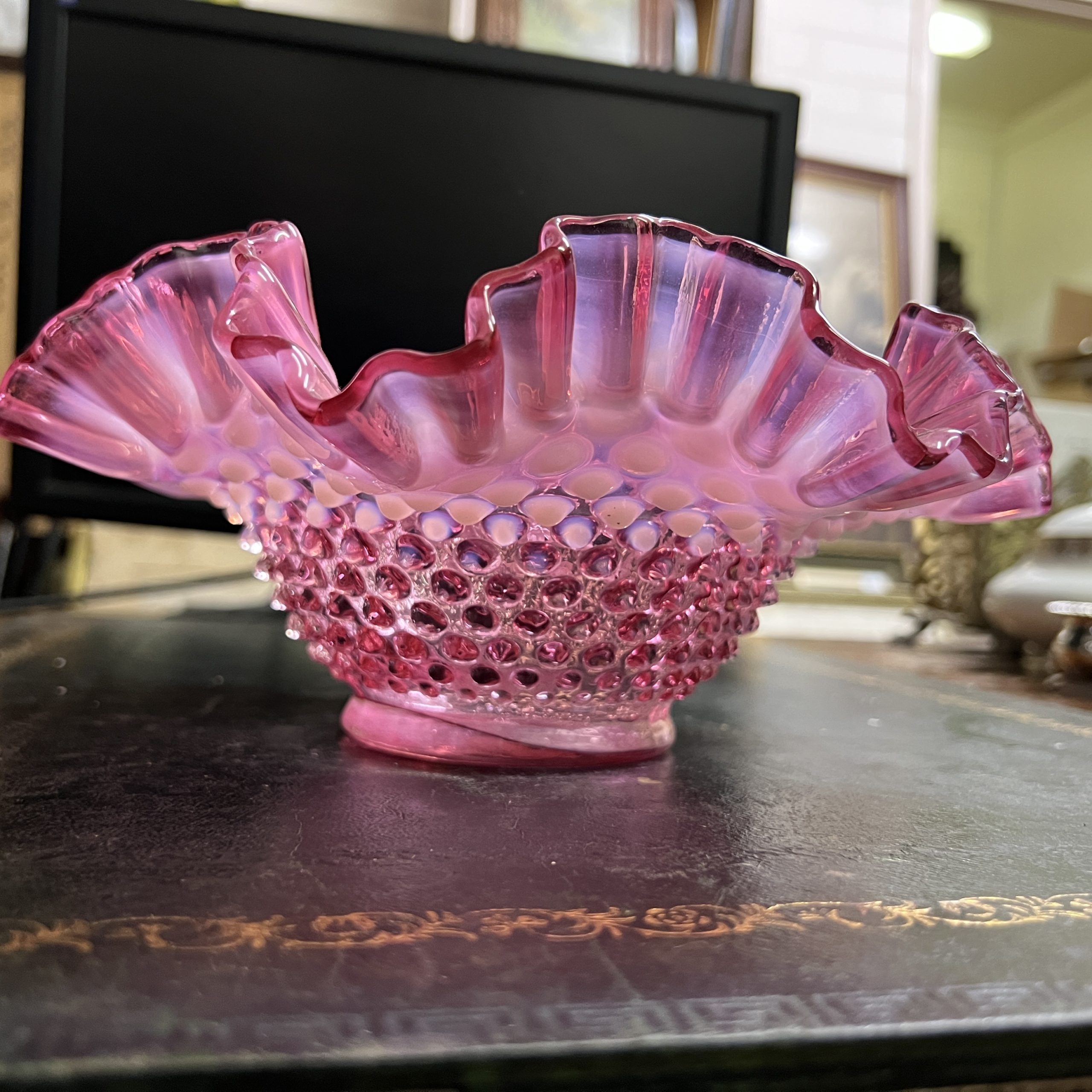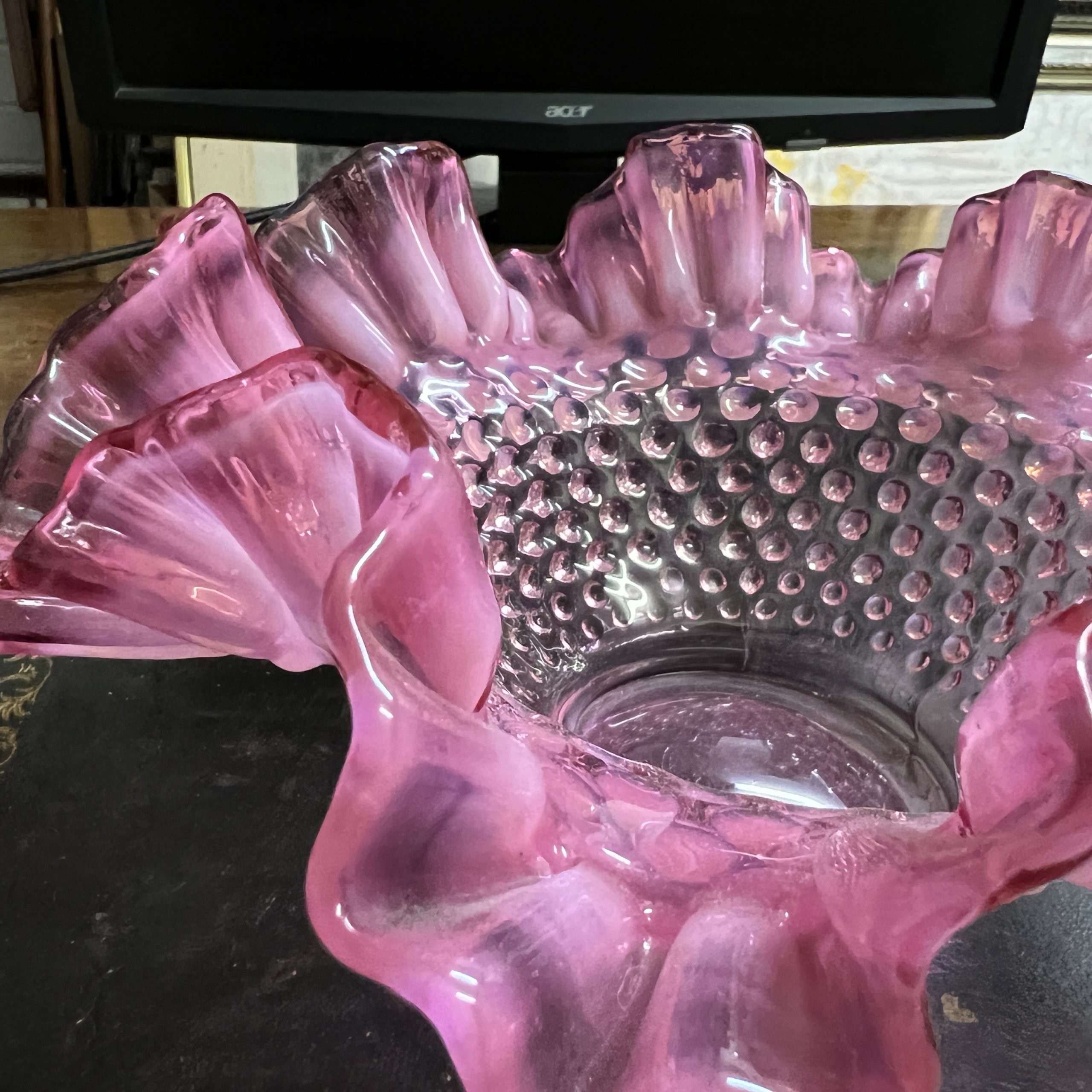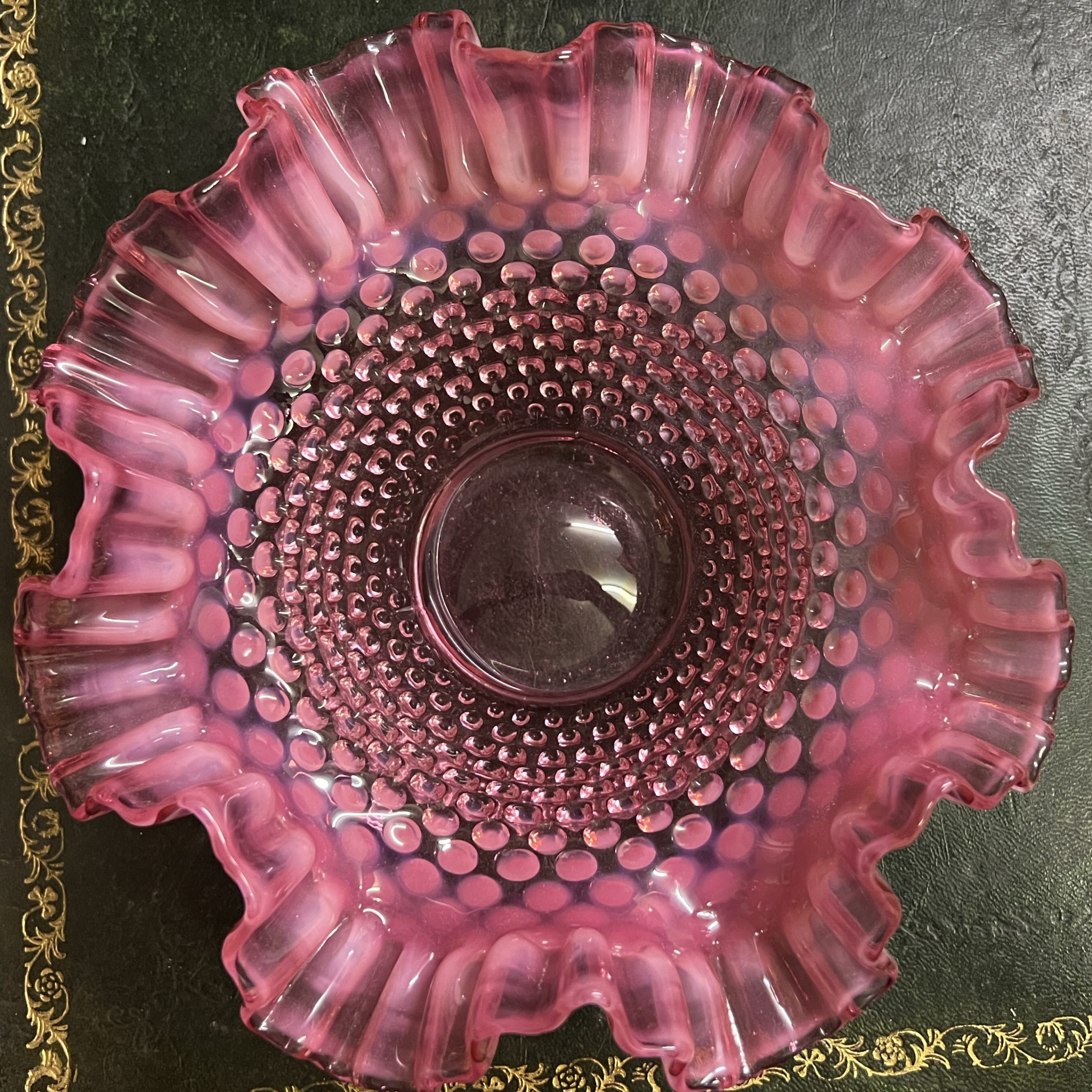 A Cranberry and opalescent Fenton glass frilled hobnail bowl