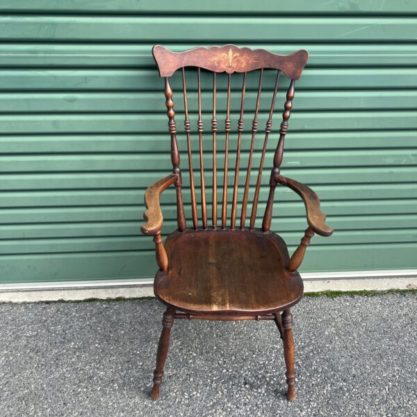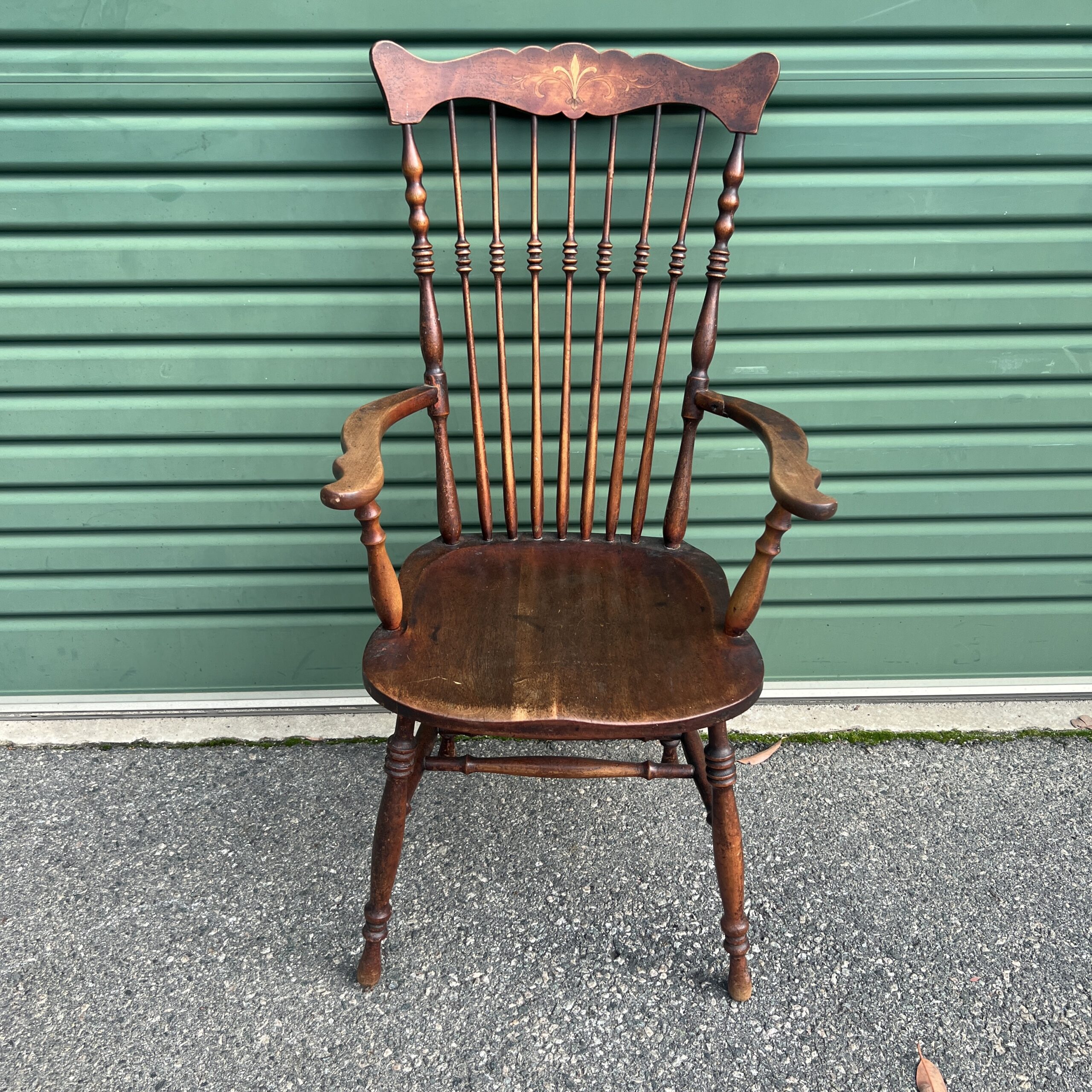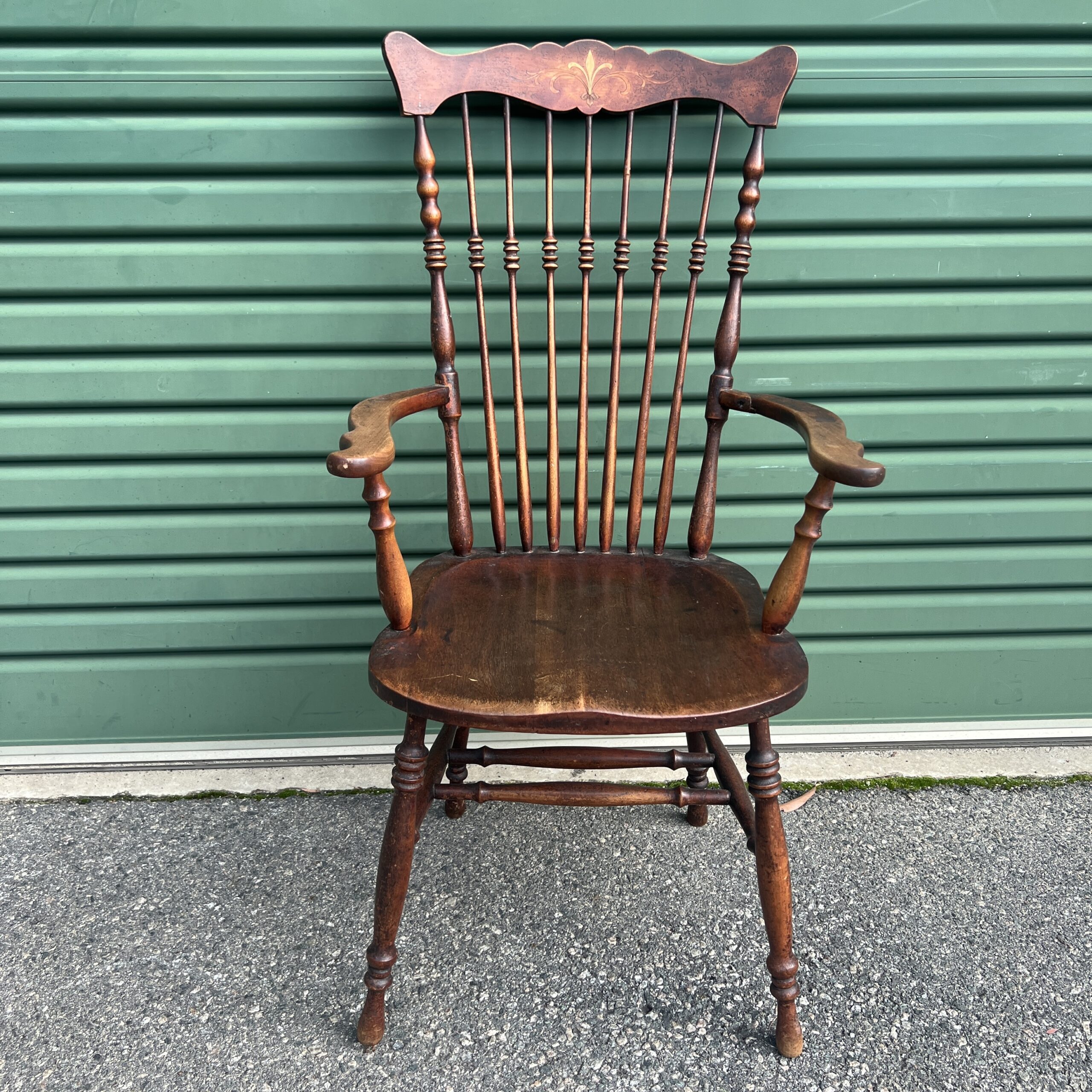 A Dexter spindle back arm chair with shaped top rail with marquetry inlaid detail, raised on turned legs Made in Black River N. Y. U.S.A.