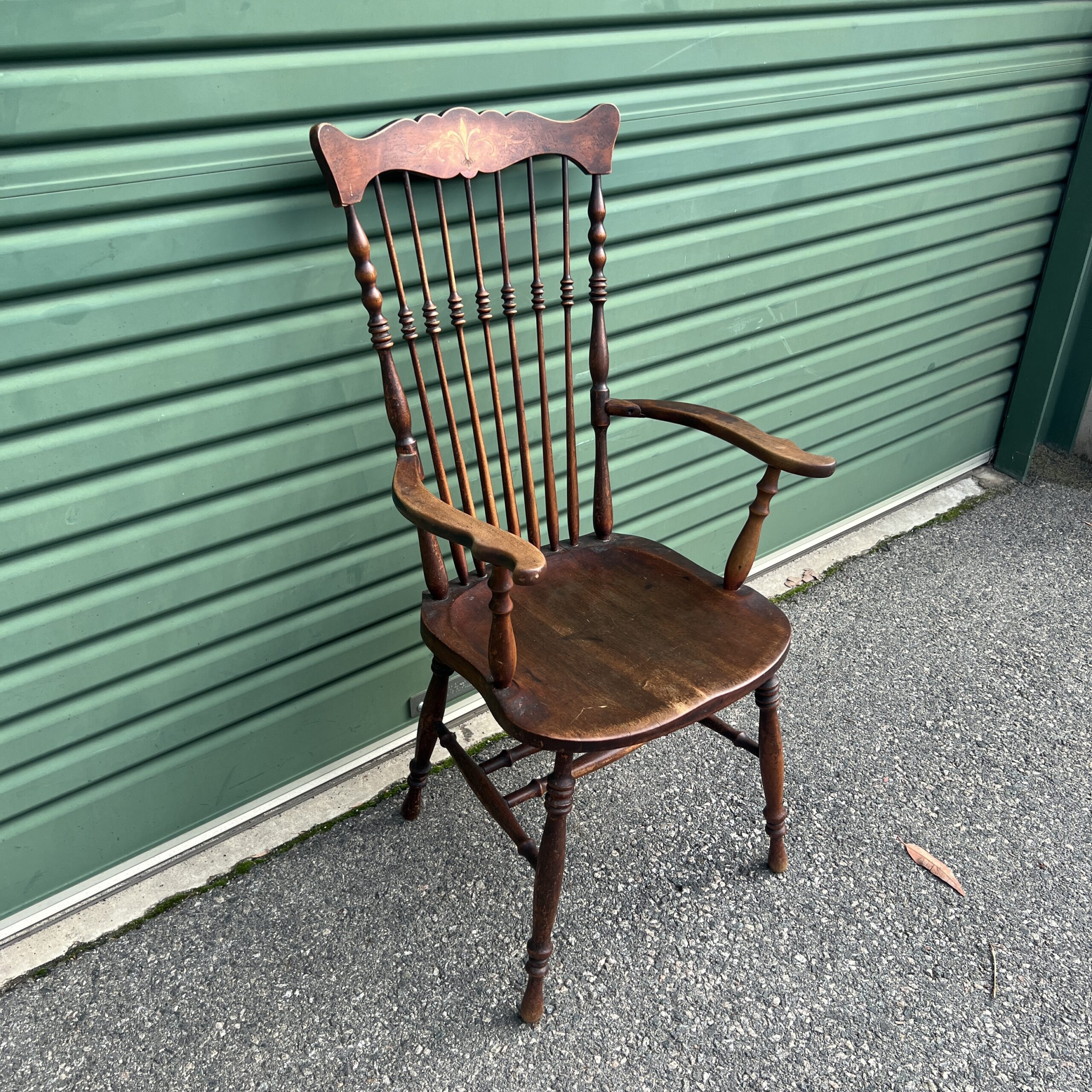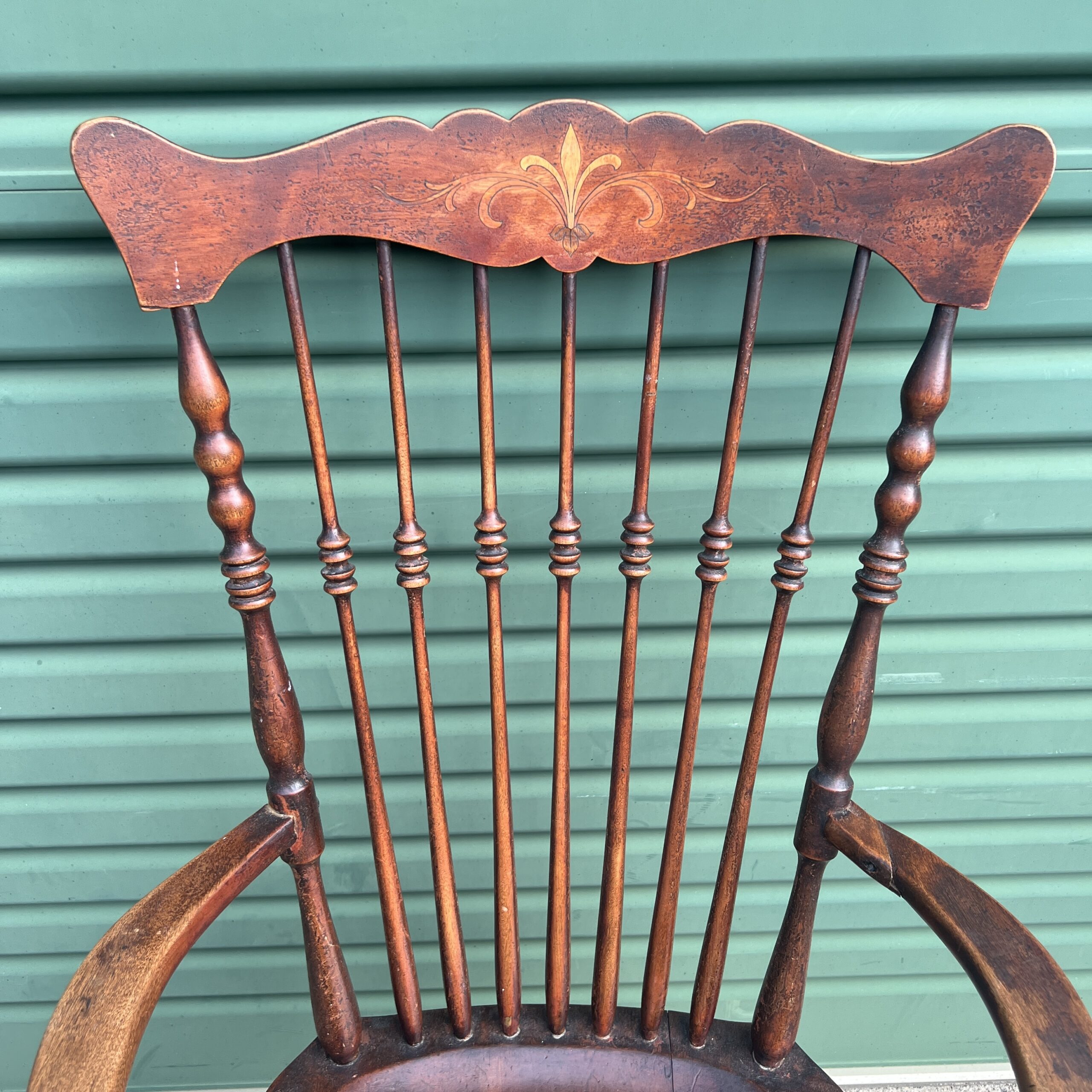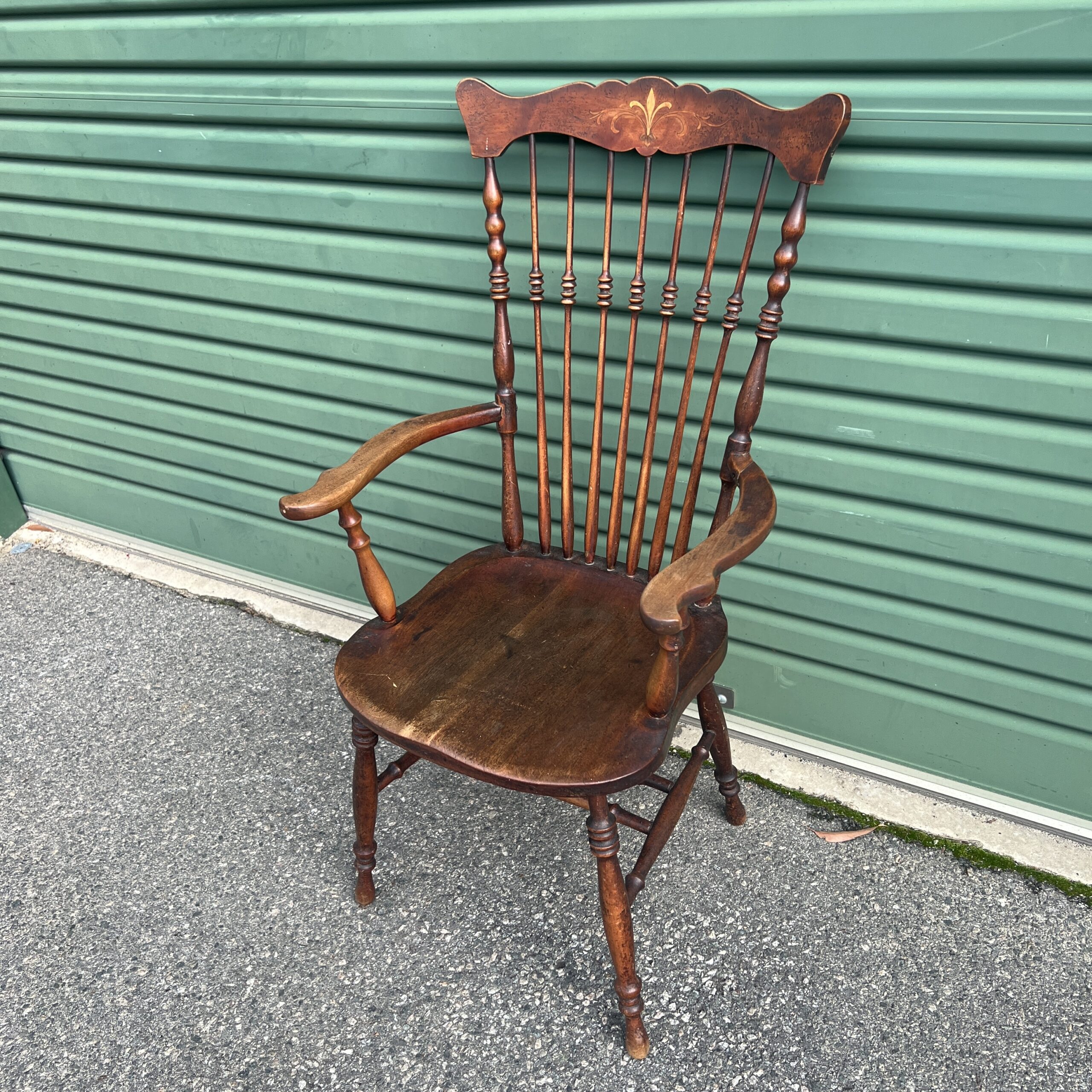 A Dexter spindle back arm chair with shaped top rail with marquetry inlaid detail, raised on turned legs Made in Black River N. Y. U.S.A.