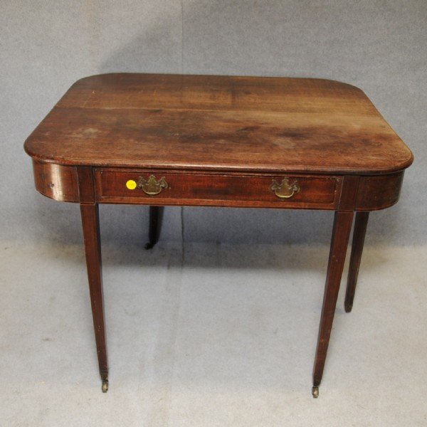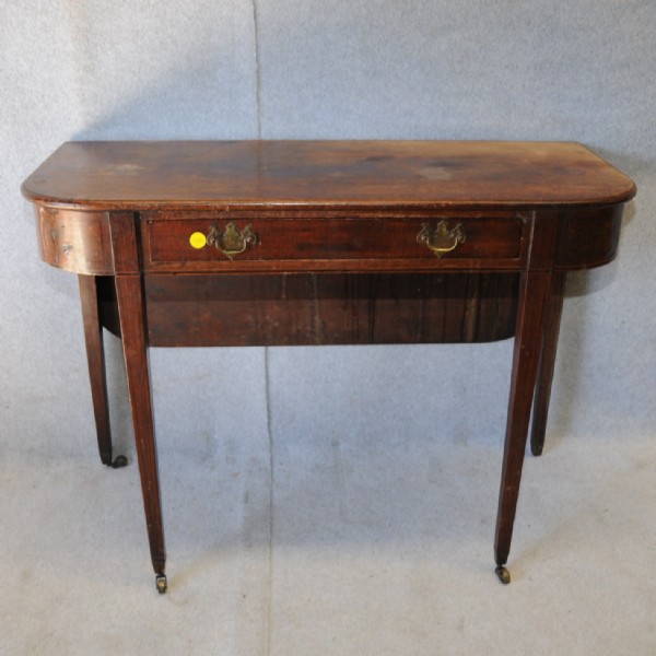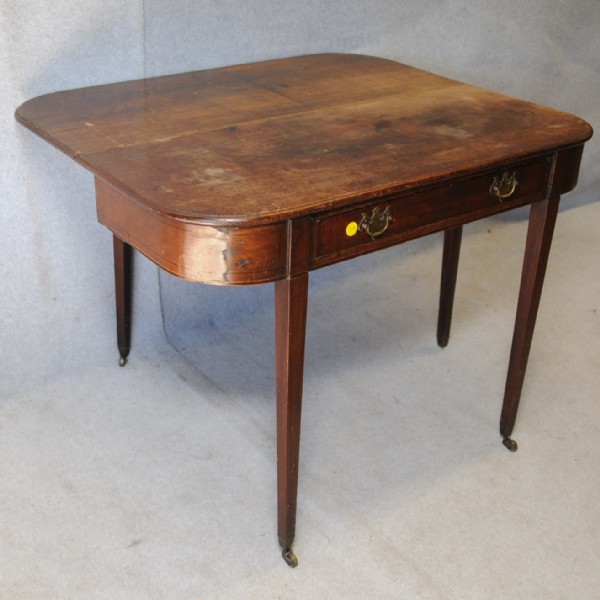 A Regency mahogany and ebony strung drop leaf side table containing a single drawer on square tapering legs.