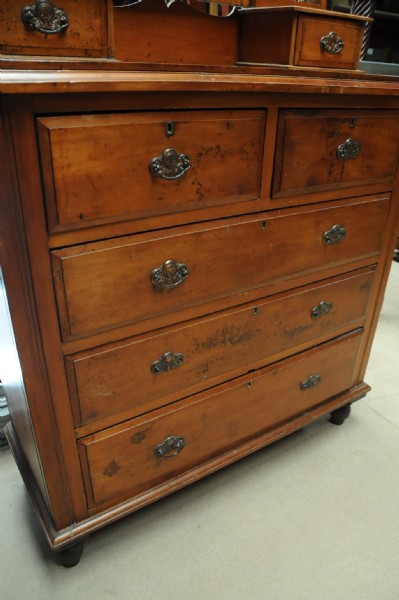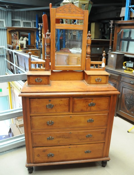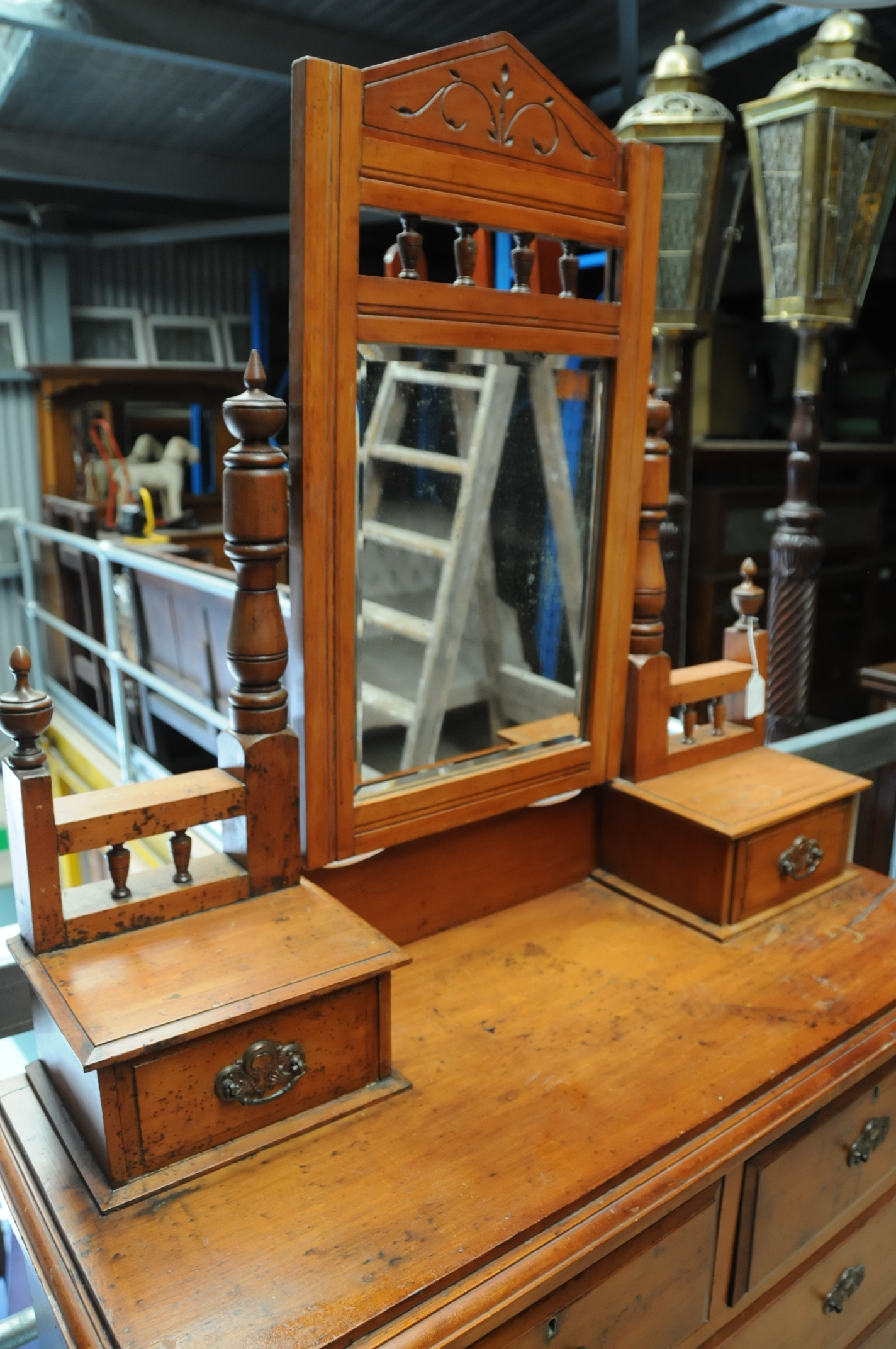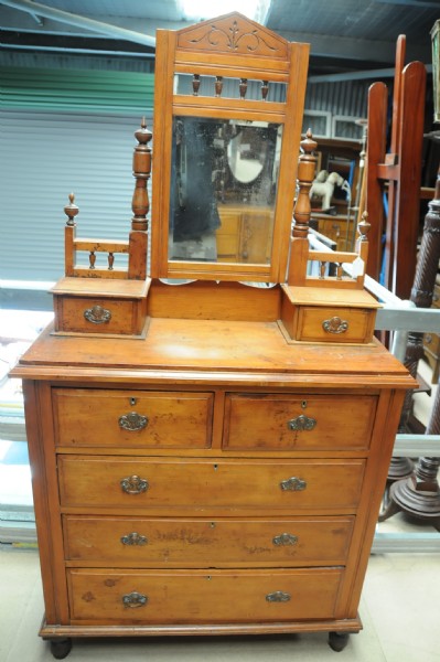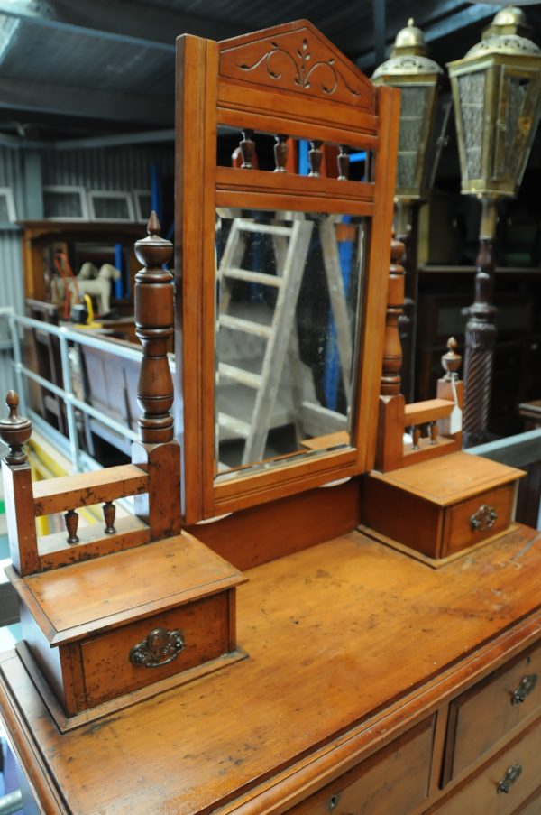 A Kauri pine duchess dressing chest with tilting beveled mirror supported on turned supports. Having small jewellery drawers, the base has two half and three full width drawers all with hand cut dovetails , raised on turned feet.