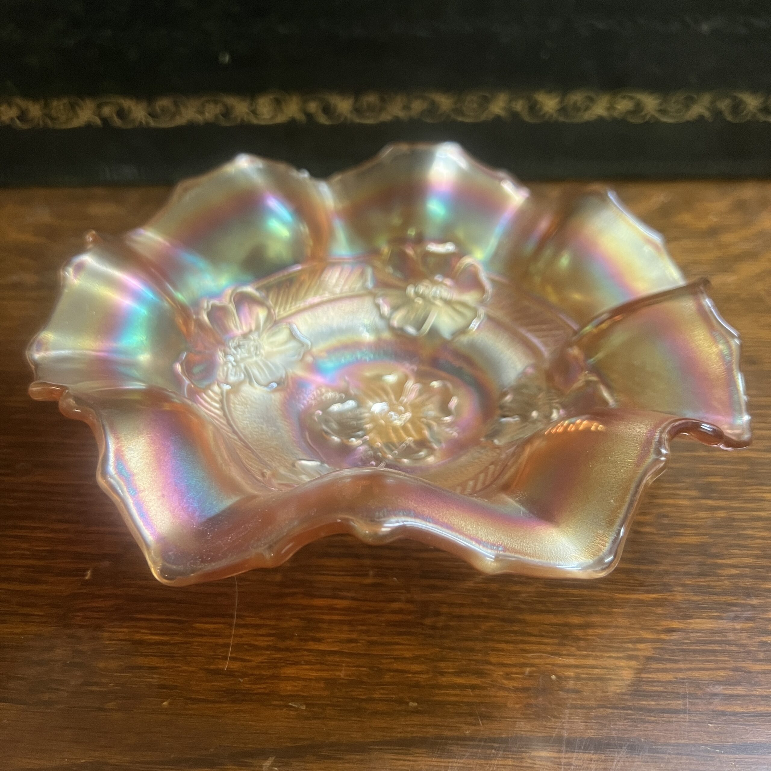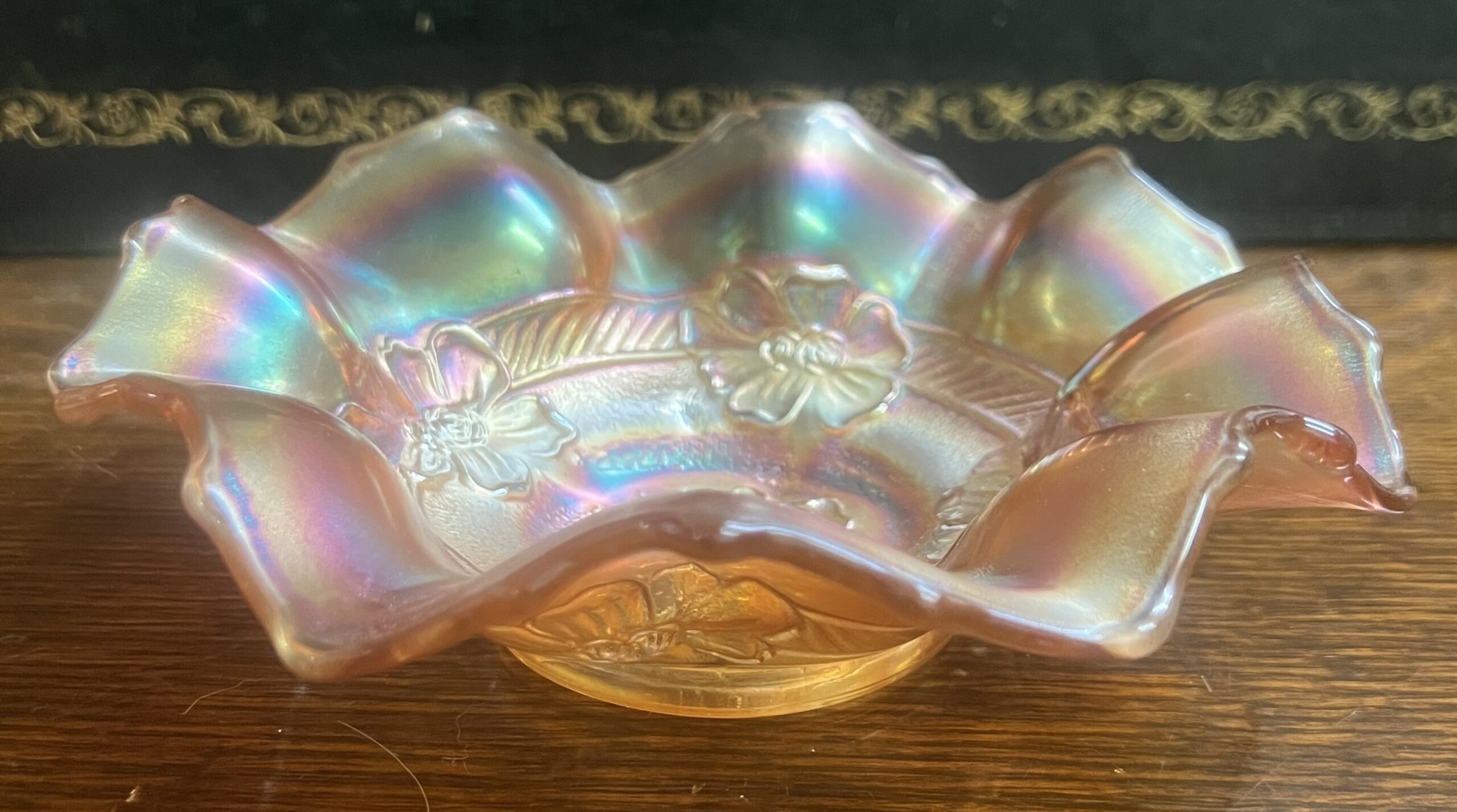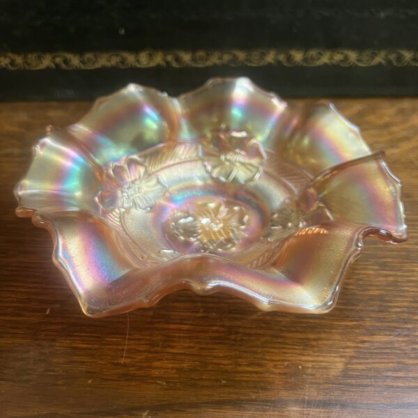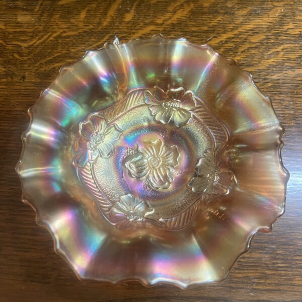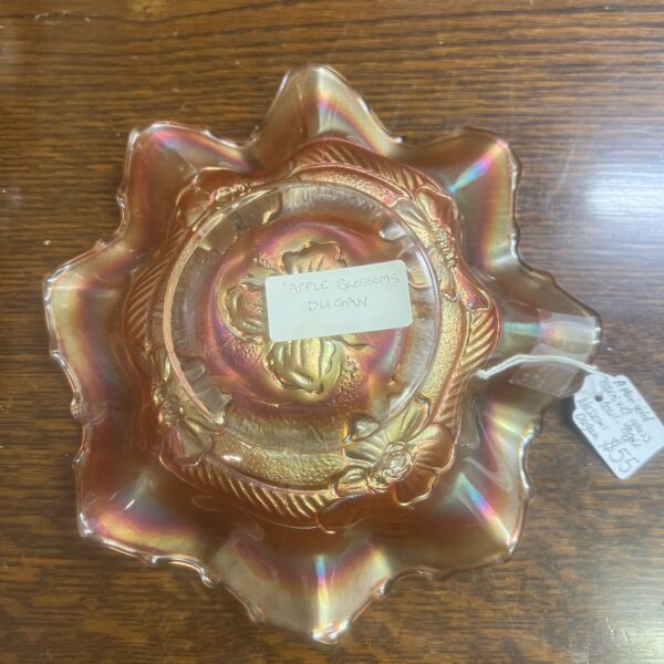A marigold Carnival glass bowl, “apple blossoms” Dugan