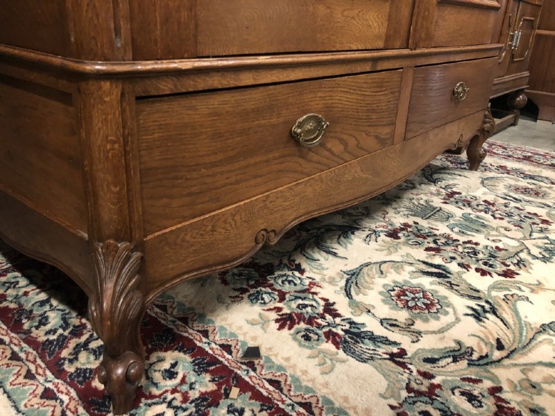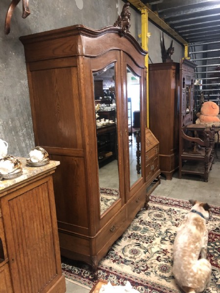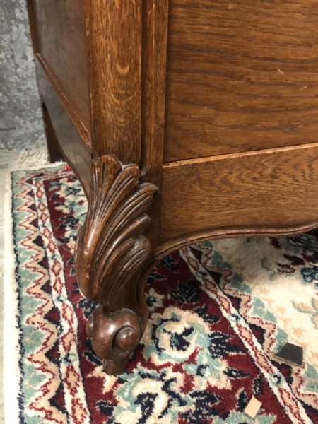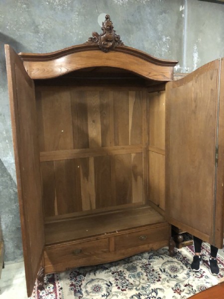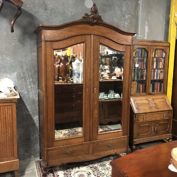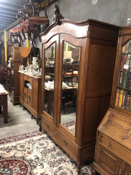 A French early 20th century oak armoire, the two mirror doors enclose clothes hanging space over two drawer. The arched top terminates with a scroll carved crest. Standing on short carved scrolling legs.