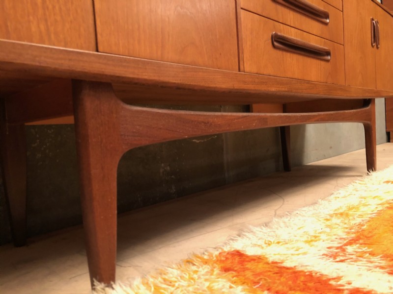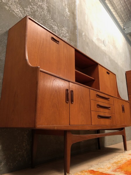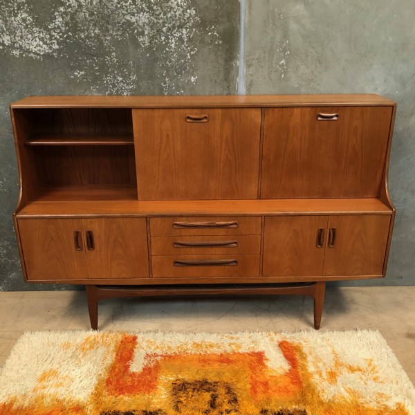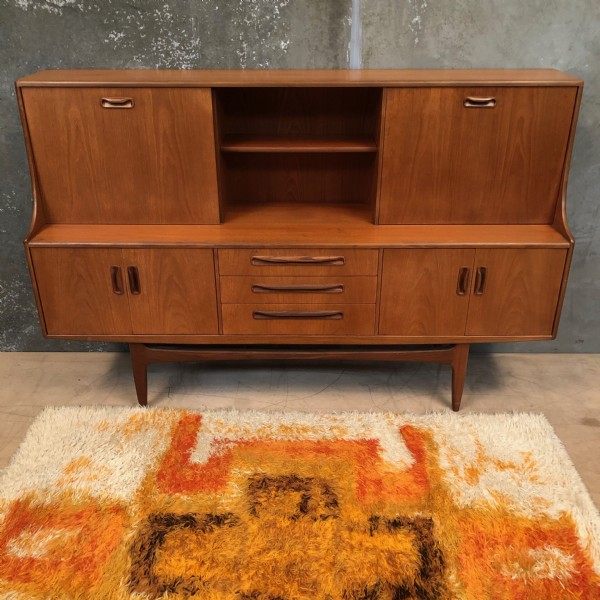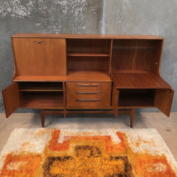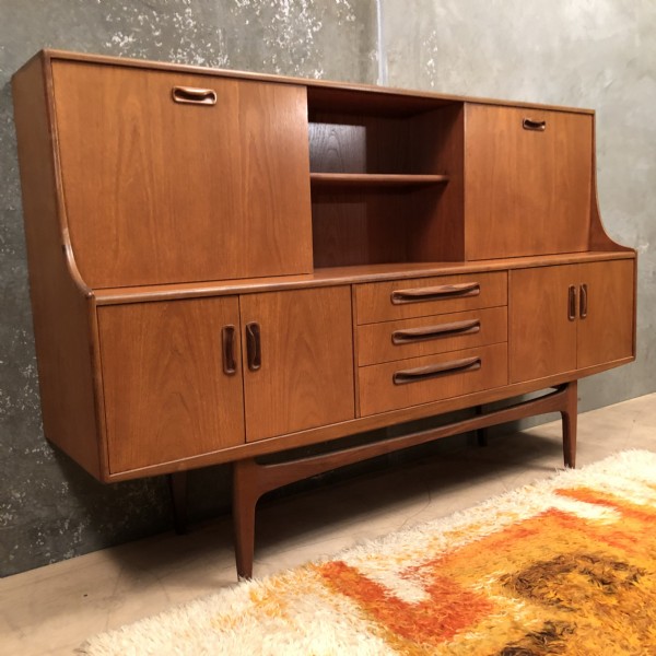 A G Plan Fresco teak Highboard with a single sliding top door, open shelving and drop down cocktail servery. The lower section has a bank of three drawers including a cutlery drawer with double doors on either side enclosing a single shelf.