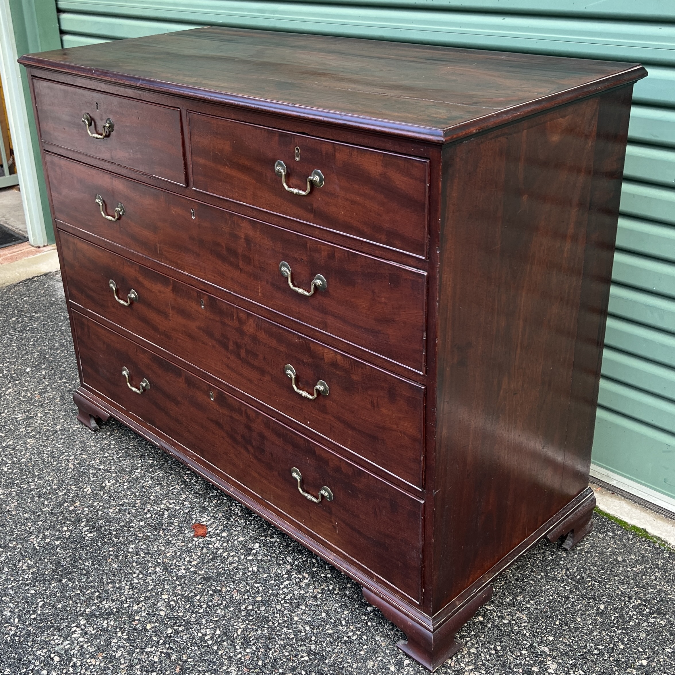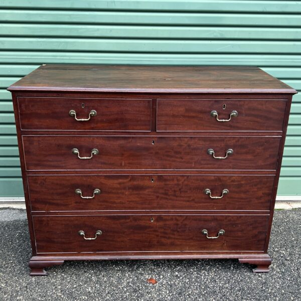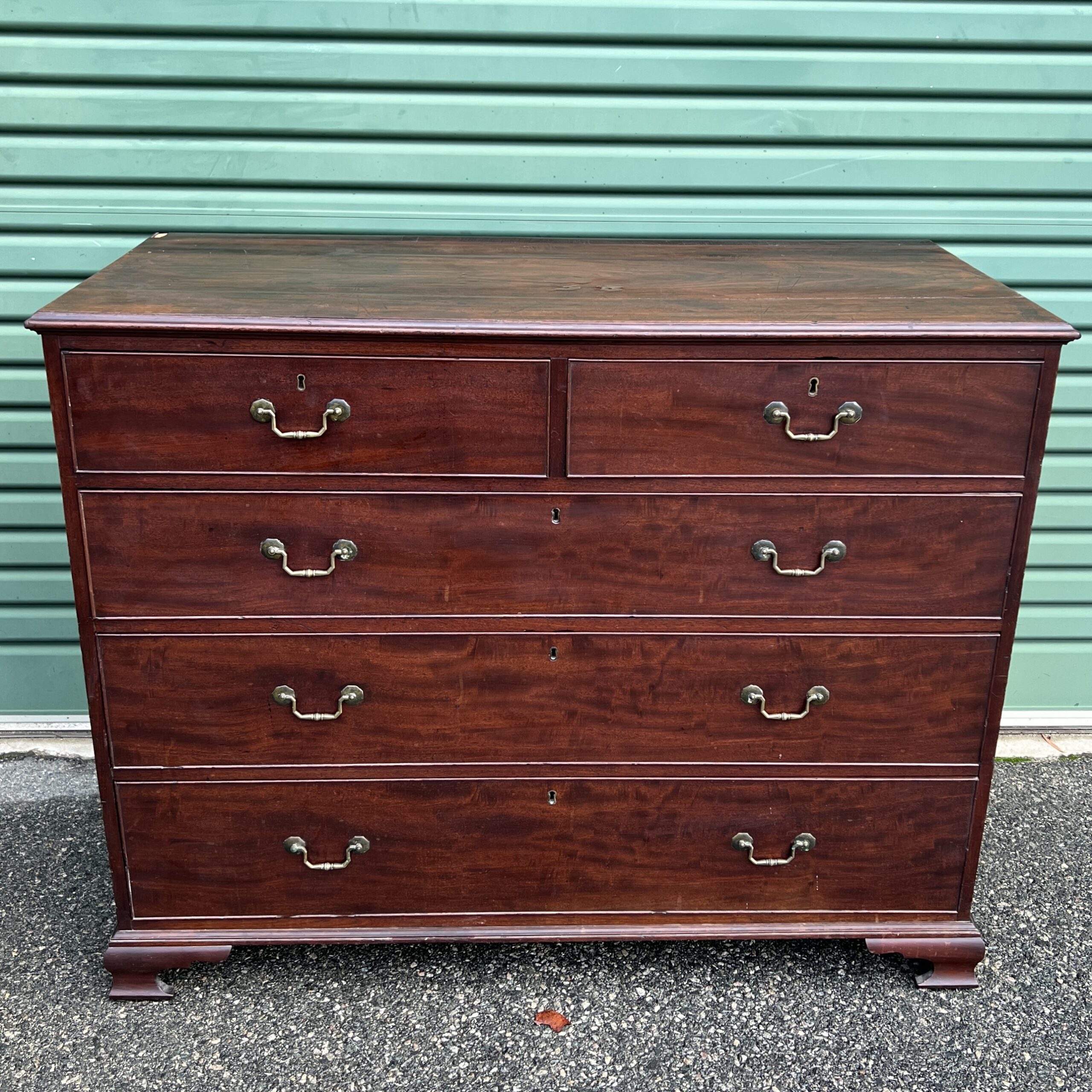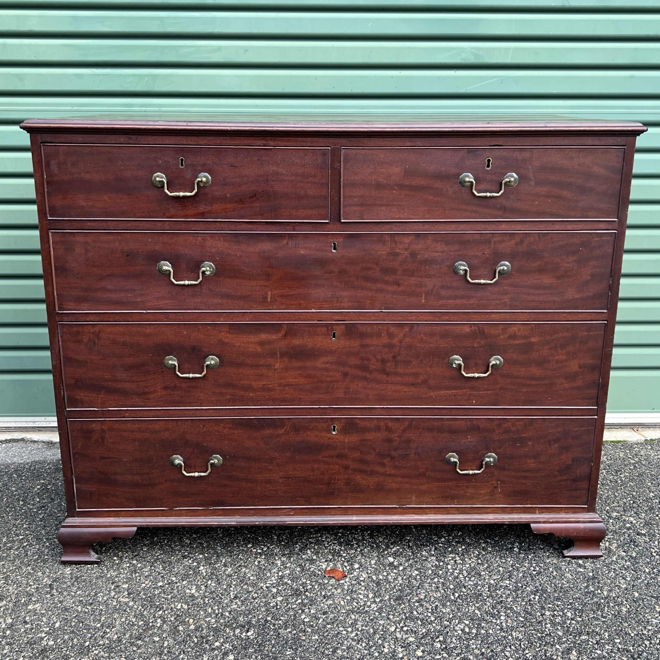 An 18th Century Georgian mahogany chest of drawers with two short and three long cock beaded drawers, each with original solid brass handles, hour glass escutcheon and are oak lined with finely hand cut dovetail joints, raised it’s original ogee bracket feet