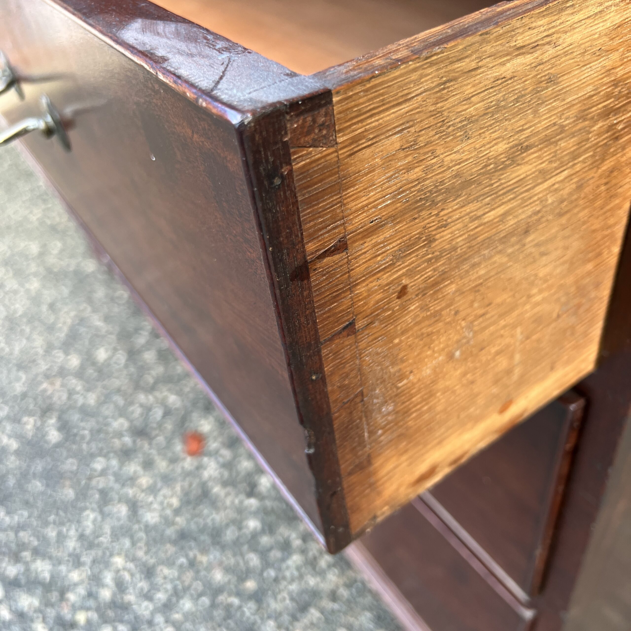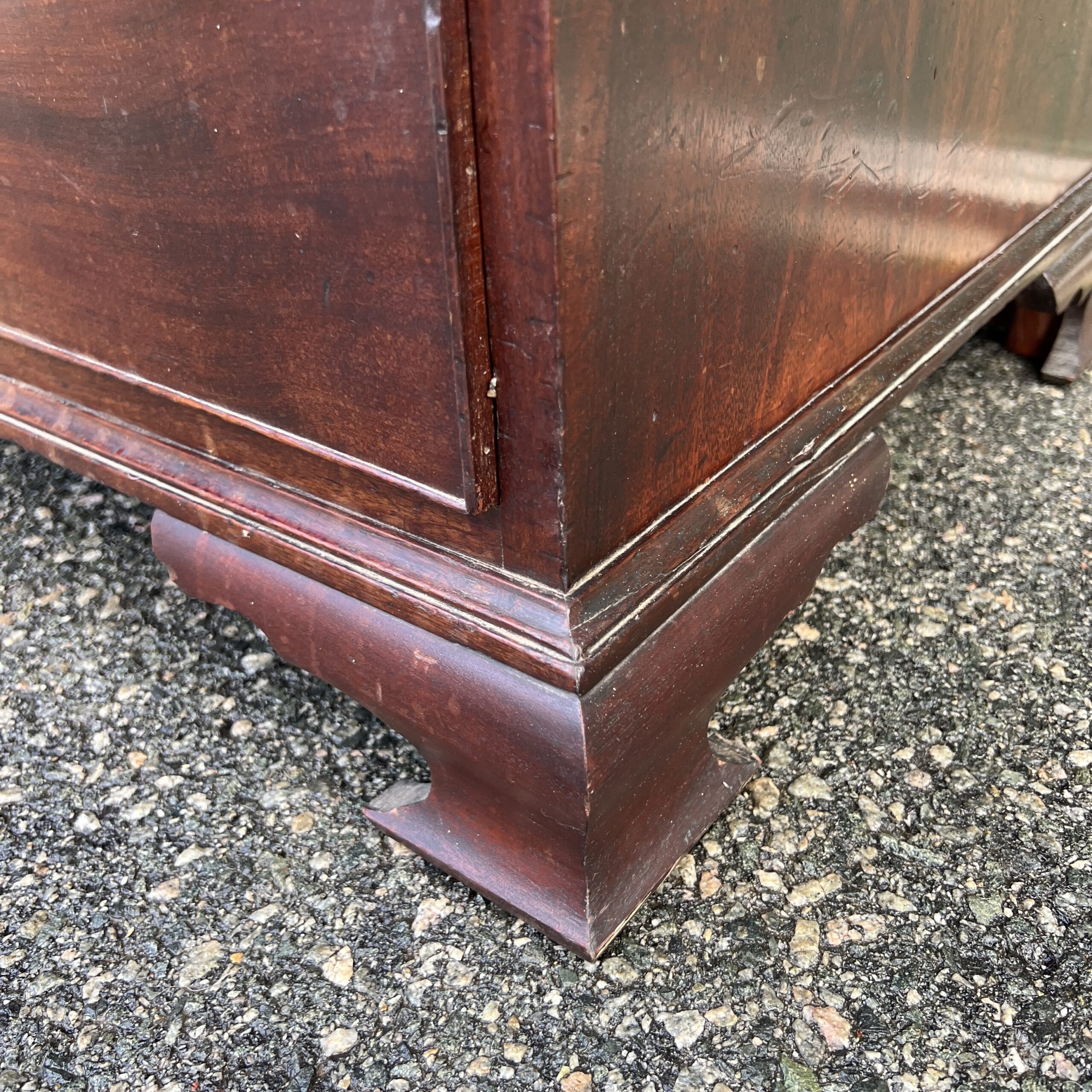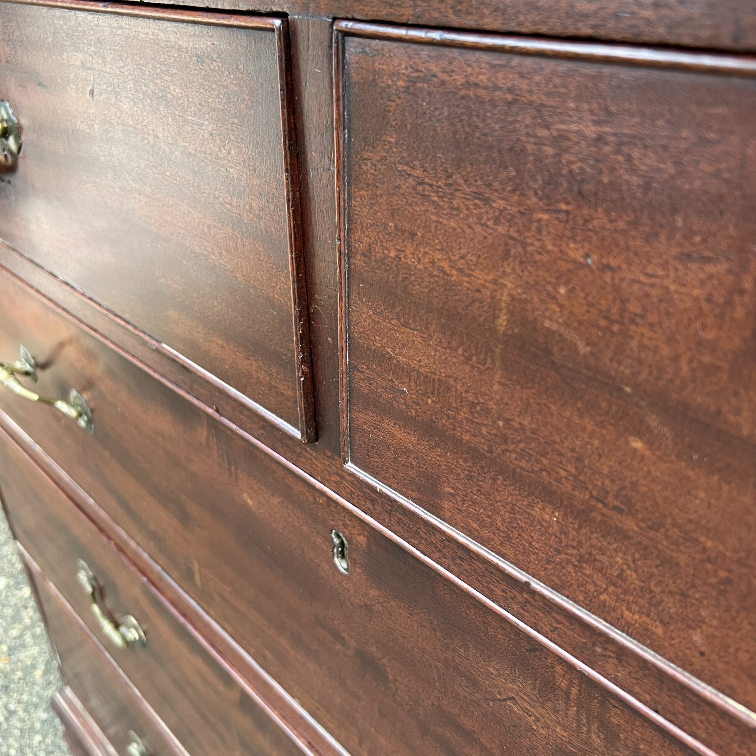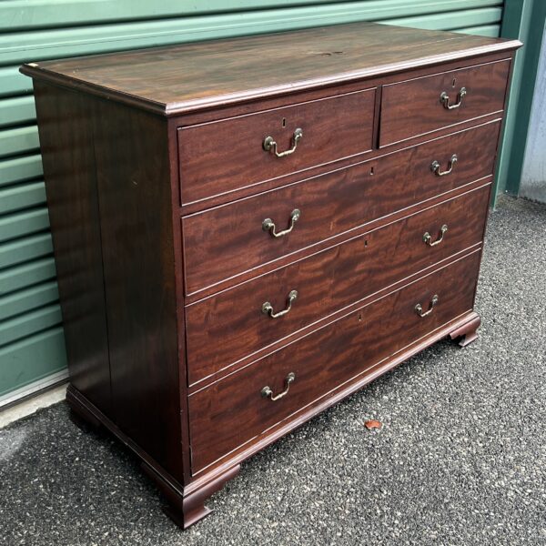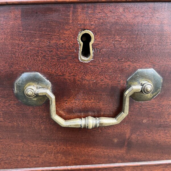 An 18th Century Georgian mahogany chest of drawers with two short and three long cock beaded drawers, each with original solid brass handles, hour glass escutcheon and are oak lined with finely hand cut dovetail joints, raised it’s original ogee bracket feet