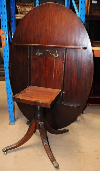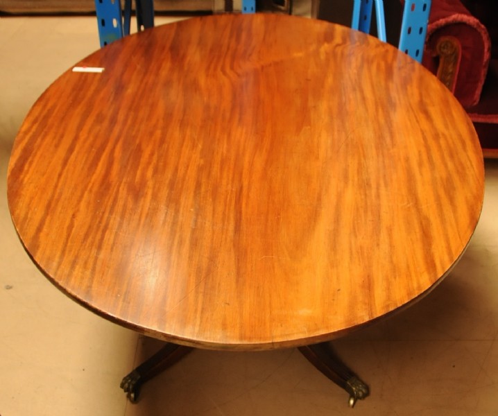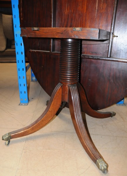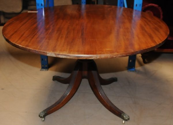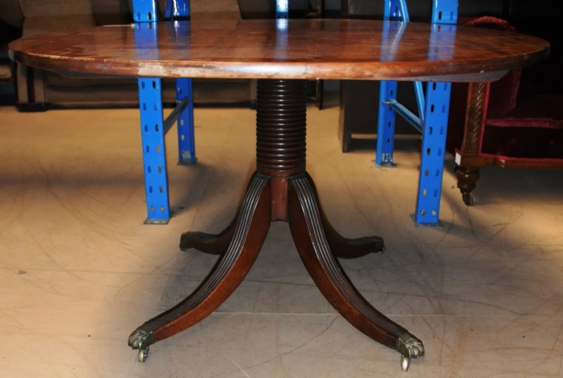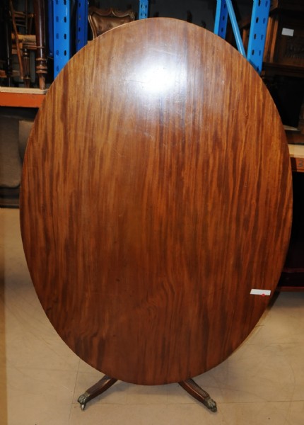 A George III Mahogany oval tilt-top table.  The one piece top has well figured grain and is supported on a ring turned pedestal.  There are four out swept legs each with reeded decoration terminating with brass paw mounts and brass casters.  Fitted with all it’s original catches and having great patination. Will comfortably seat six people.