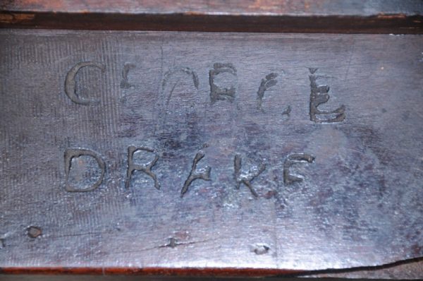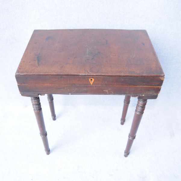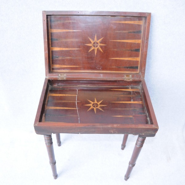 A George IV mahogany backgammon games table raised on ring turned legs, signed George Drake. Missing a small drawer and in need of TLC.