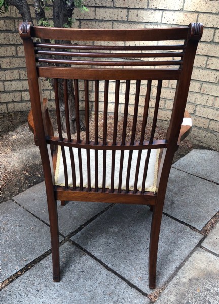 A George IV mahogany spindle back arm chair with shaped arms and supports, upholstered seat raised on square tapering legs