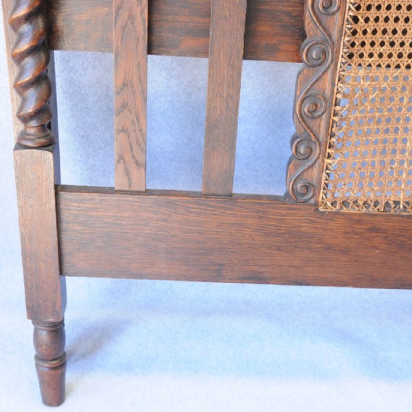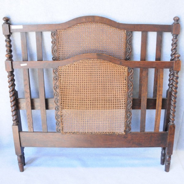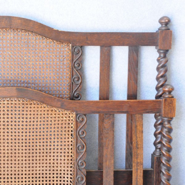 A Jacobean style double bed with bowed top rail and barley twist supports, the centred rattan panels with carved scrolls, flanked on both sides with slats, raised on turned legs.