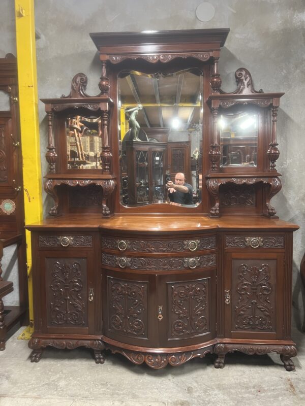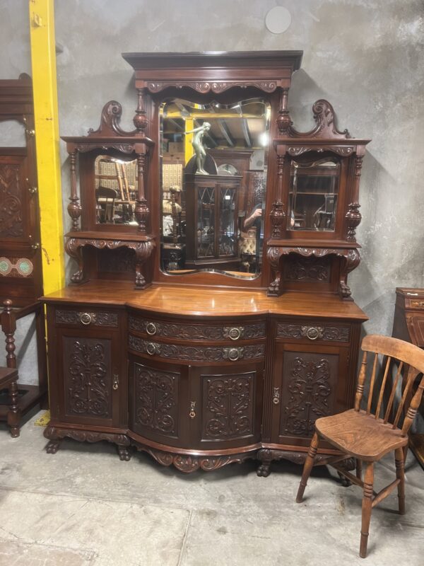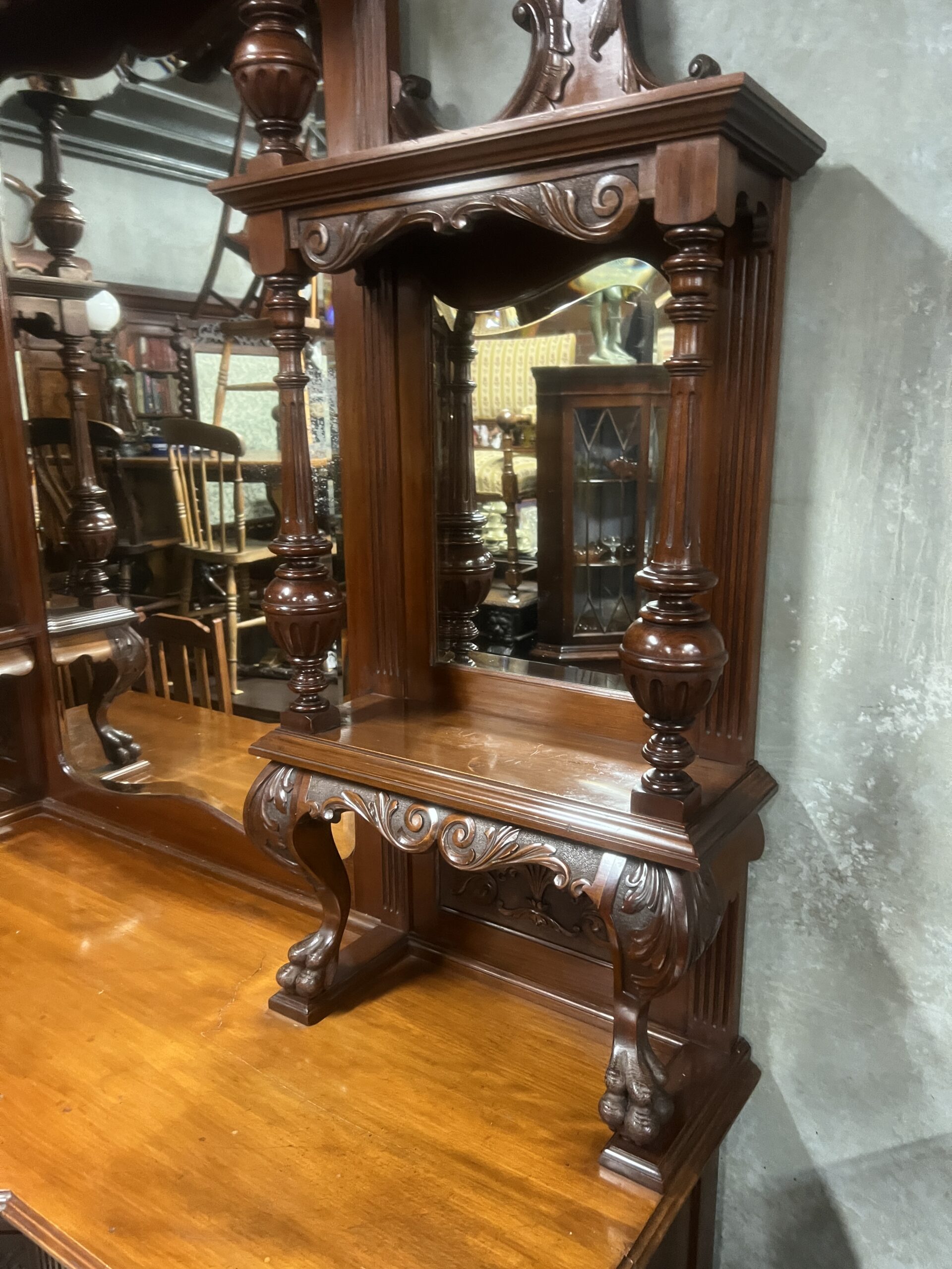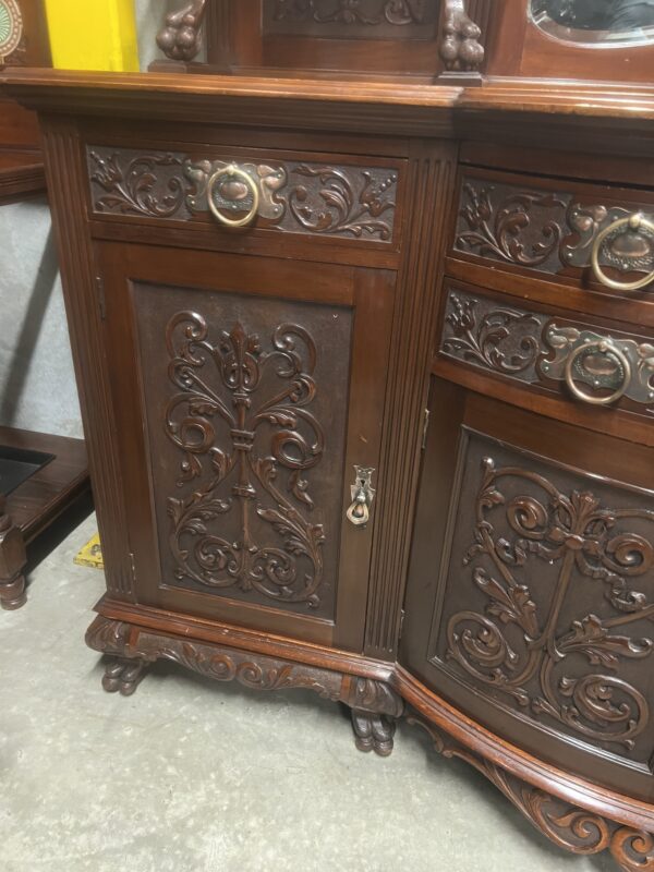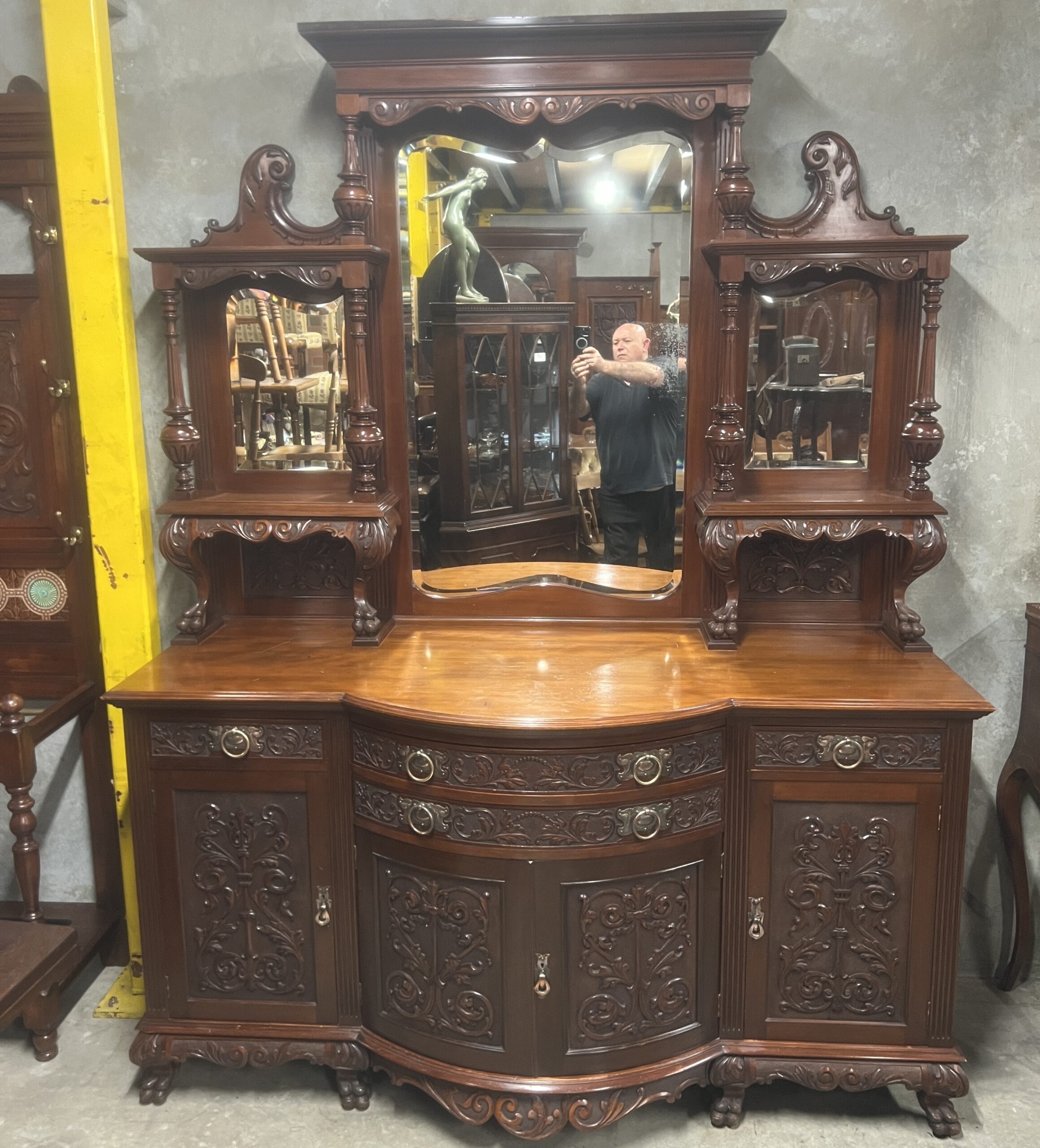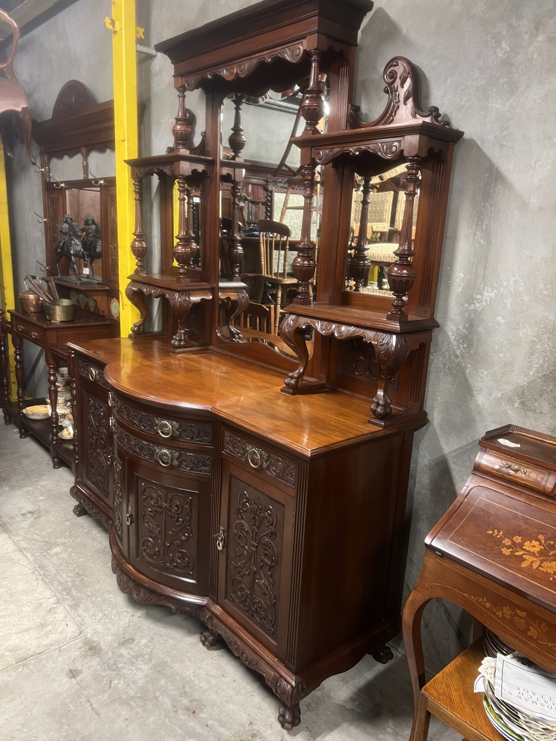 A large Australian bowed front mirror back sideboard. The larger framed central mirror is flanked on either side by smaller mirrors which are also shaped and beveled. The smaller mirrors have a shelf below and are raised on hairy paw legs and turned columns terminating with a scrolling detail. The bottom section has a series of drawers and doors each decoratively carved and having all the original copper and brass handles. The base has a carved apron and is also raised on carved hairy paw feet. This piece is reputedly from Melton Sheep Station South Australia and was purchased during a late 19th/early 20th century wool boom.