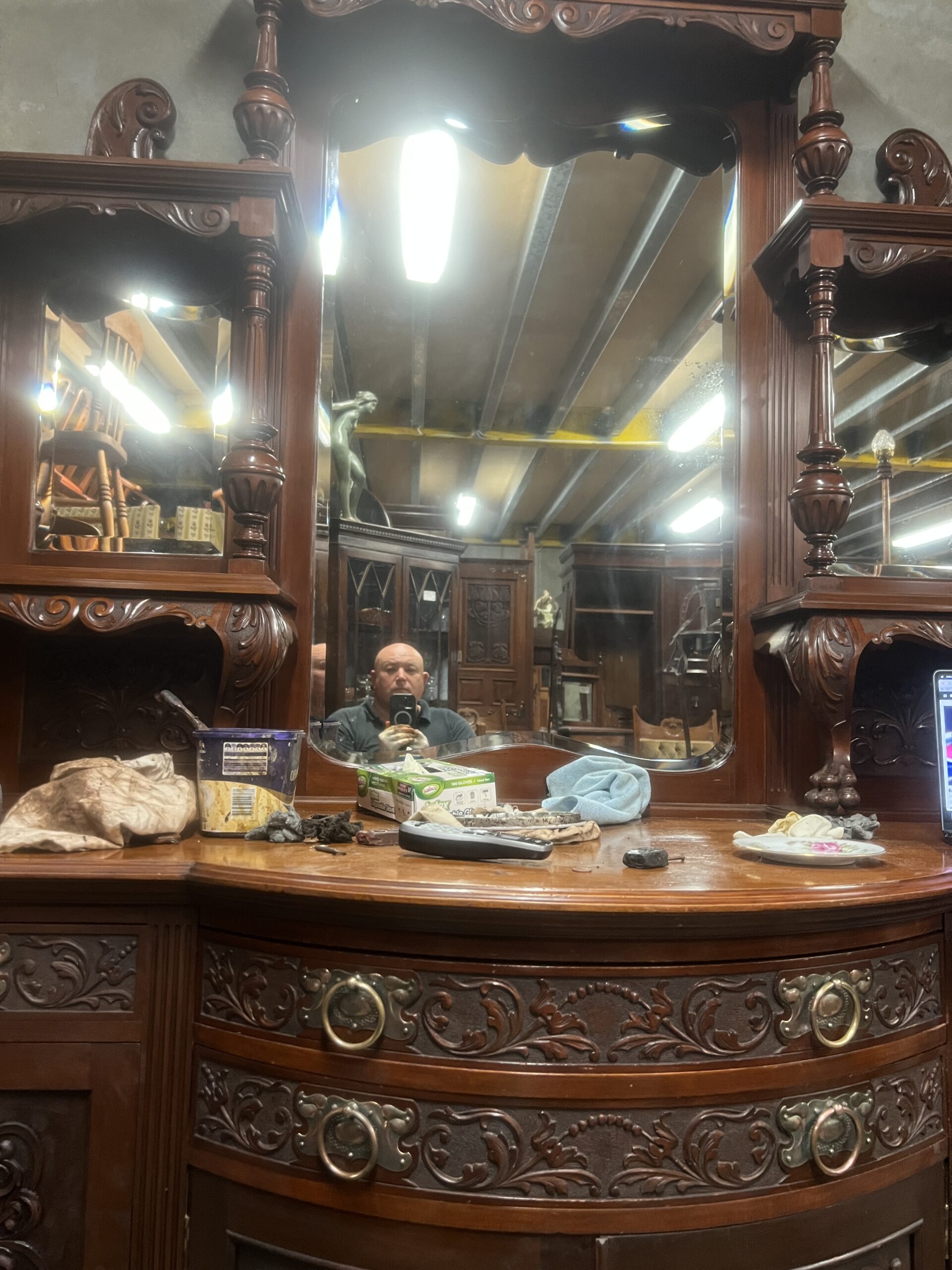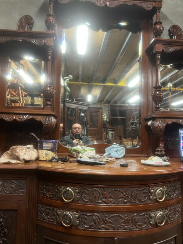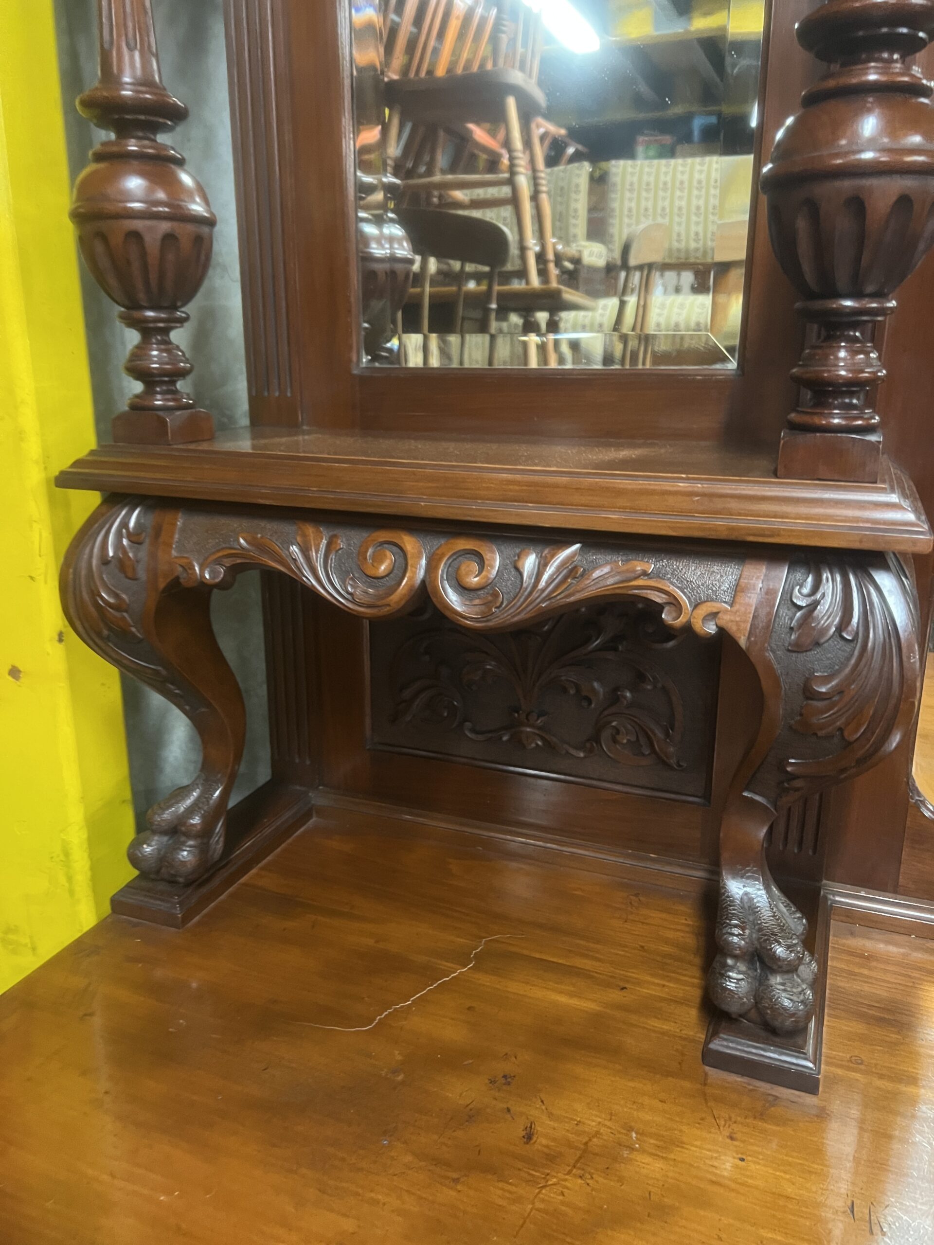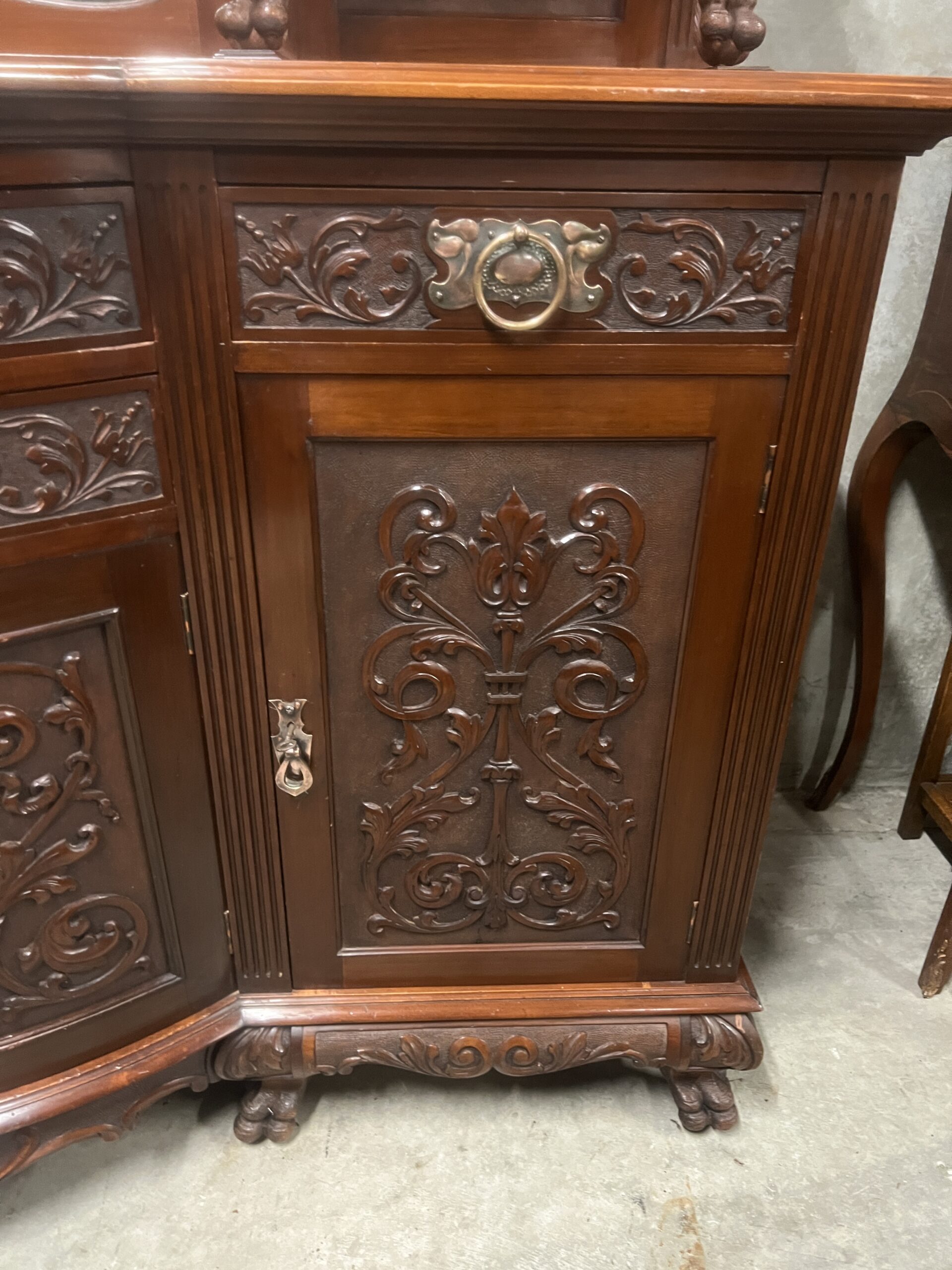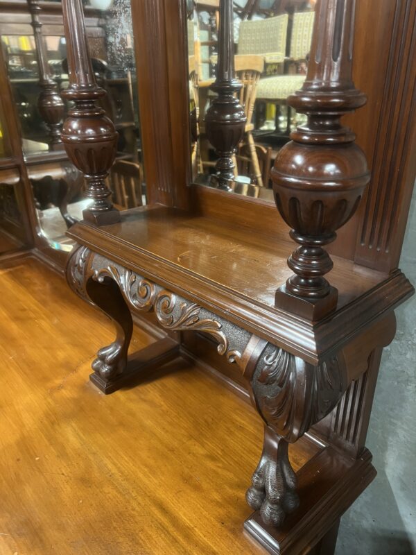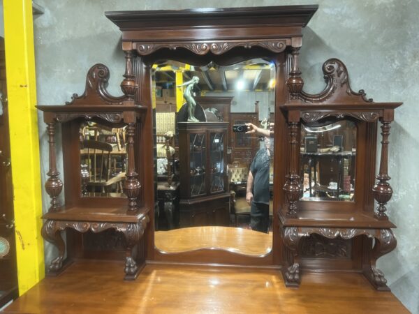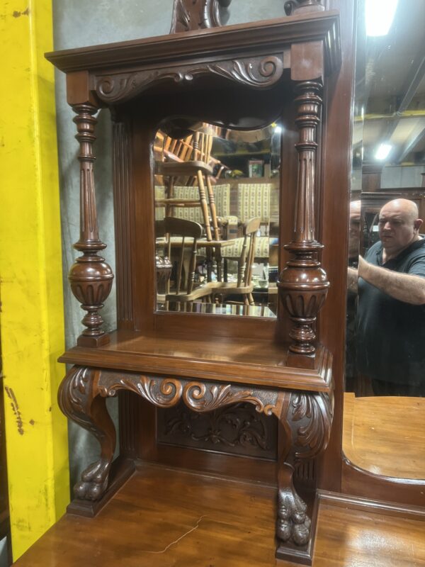 A large Australian bowed front mirror back sideboard. The larger framed central mirror is flanked on either side by smaller mirrors which are also shaped and beveled. The smaller mirrors have a shelf below and are raised on hairy paw legs and turned columns terminating with a scrolling detail. The bottom section has a series of drawers and doors each decoratively carved and having all the original copper and brass handles. The base has a carved apron and is also raised on carved hairy paw feet. This piece is reputedly from Melton Sheep Station South Australia and was purchased during a late 19th/early 20th century wool boom.