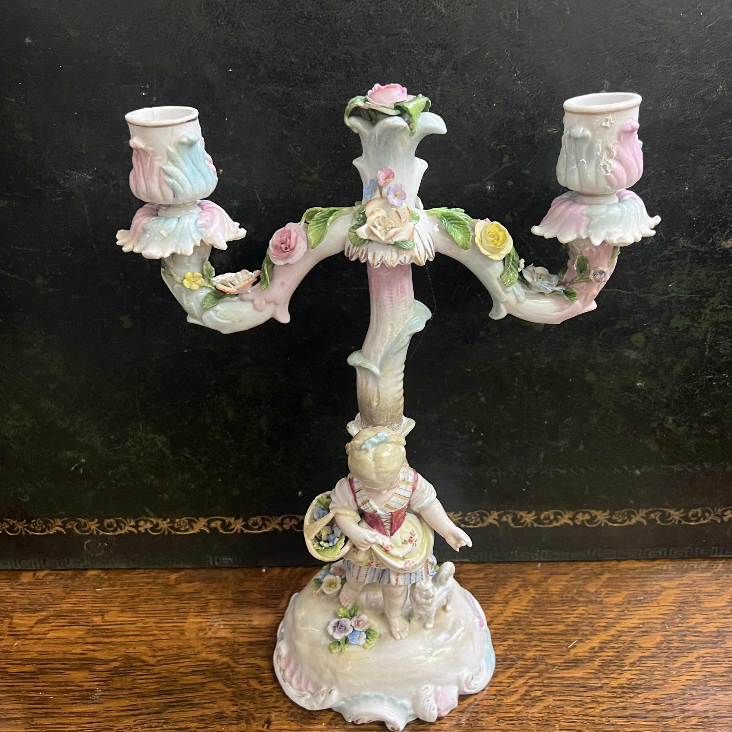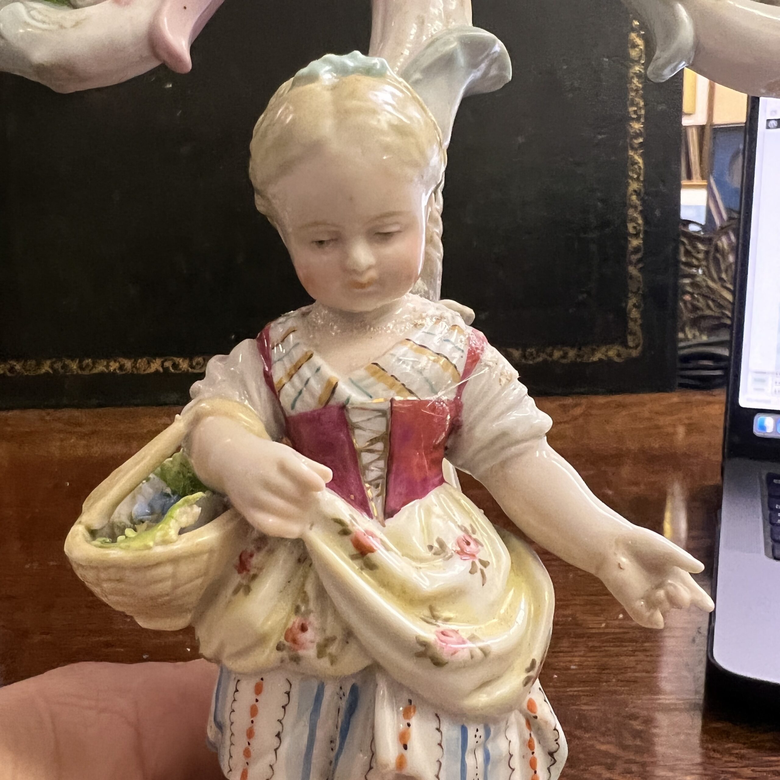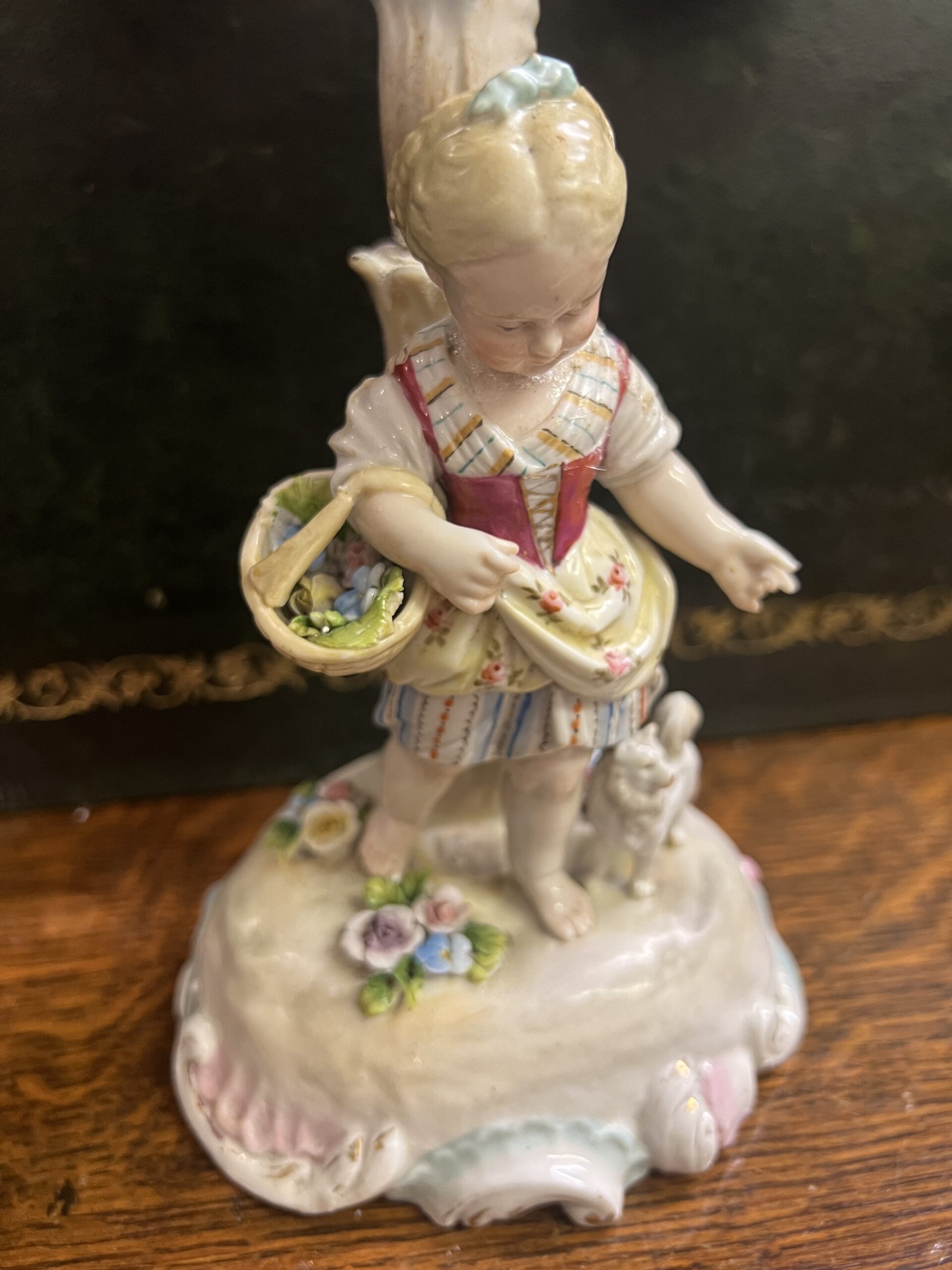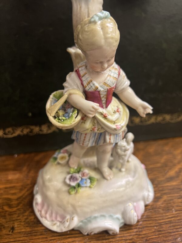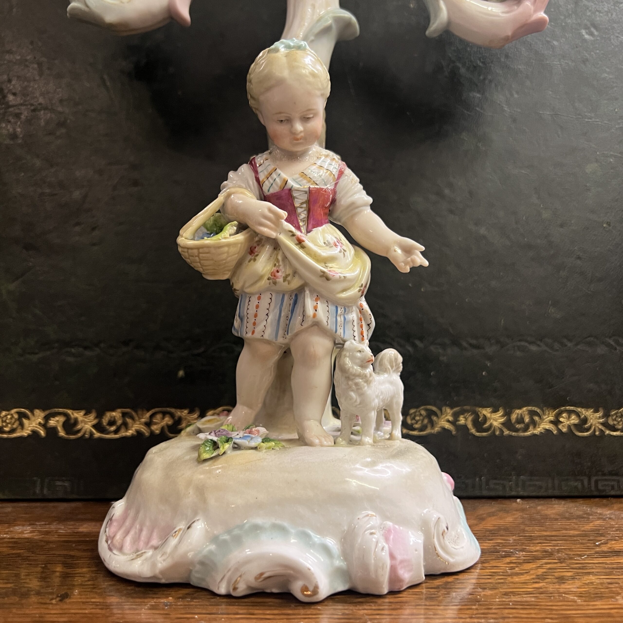 A late 19th century hand painted Meissen porcelain figural candelabra young girl with a basket of flowers accompanied by her dog , AF some small loses to flower petals and a re-glue to a candle cup