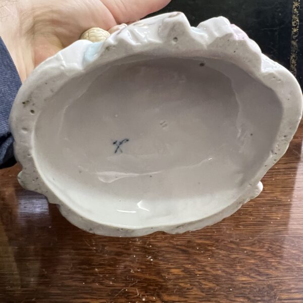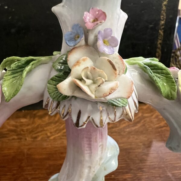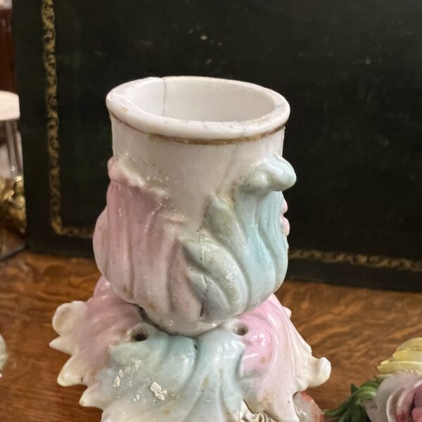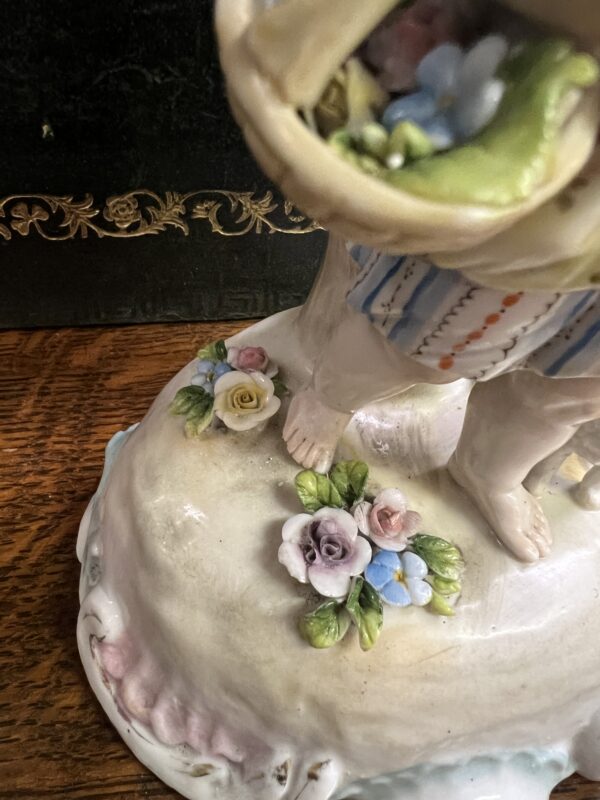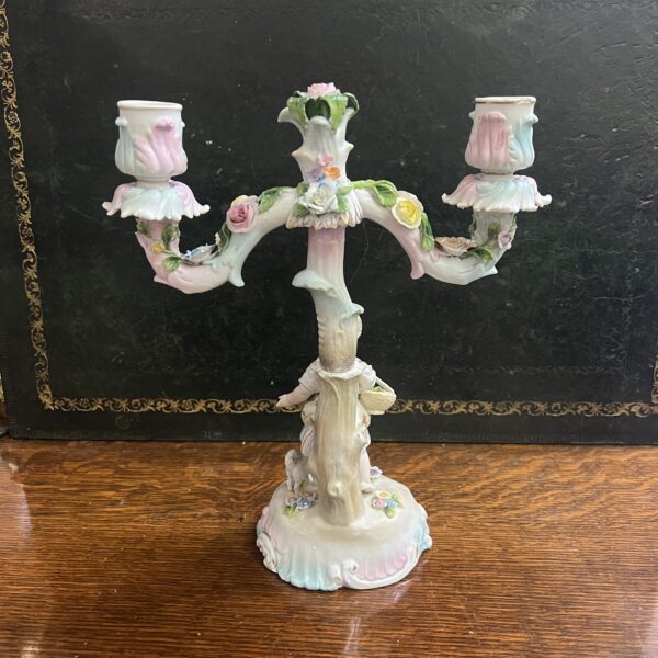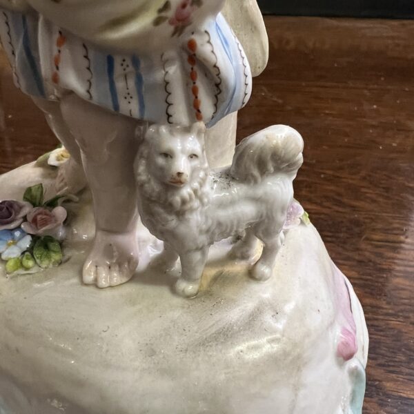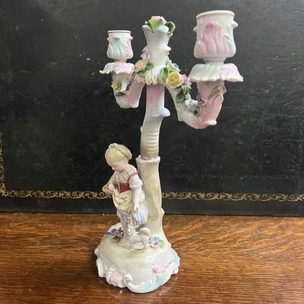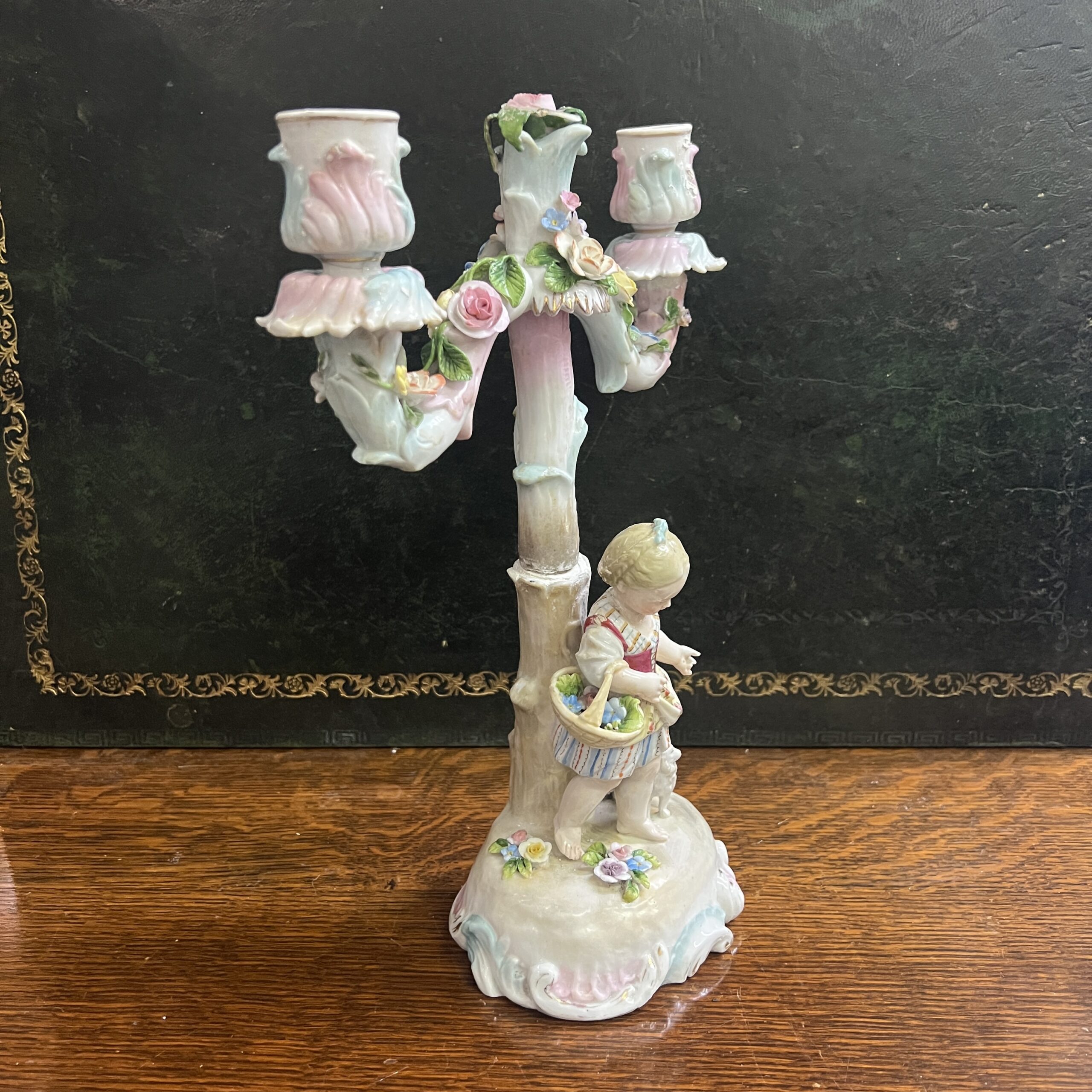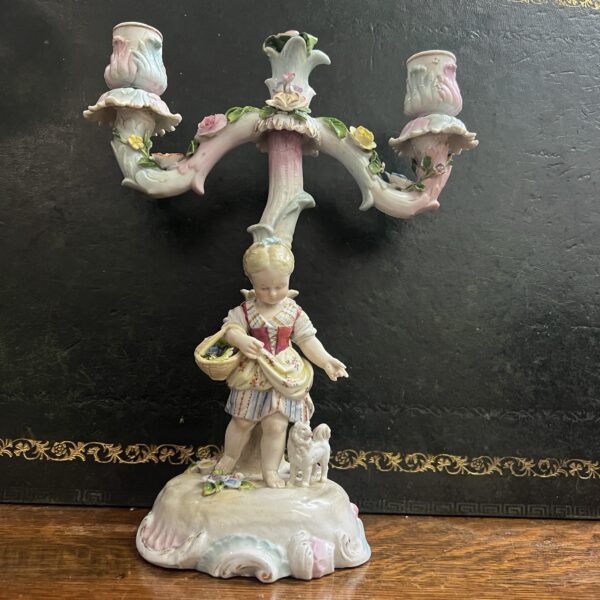 A late 19th century hand painted Meissen porcelain figural candelabra young girl with a basket of flowers accompanied by her dog , AF some small loses to flower petals and a re-glue to a candle cup