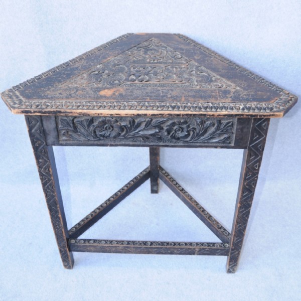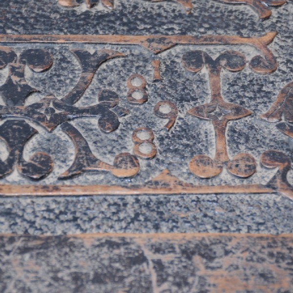 A late 19th century profusely carved table with square tapering legs and stretcher. The date has been incorporated into the carved top.