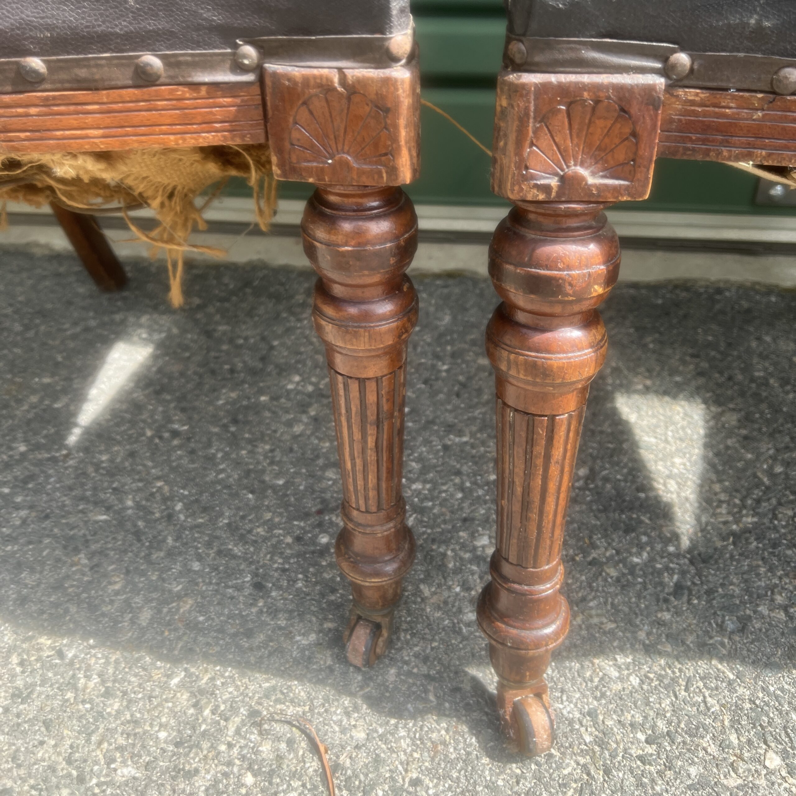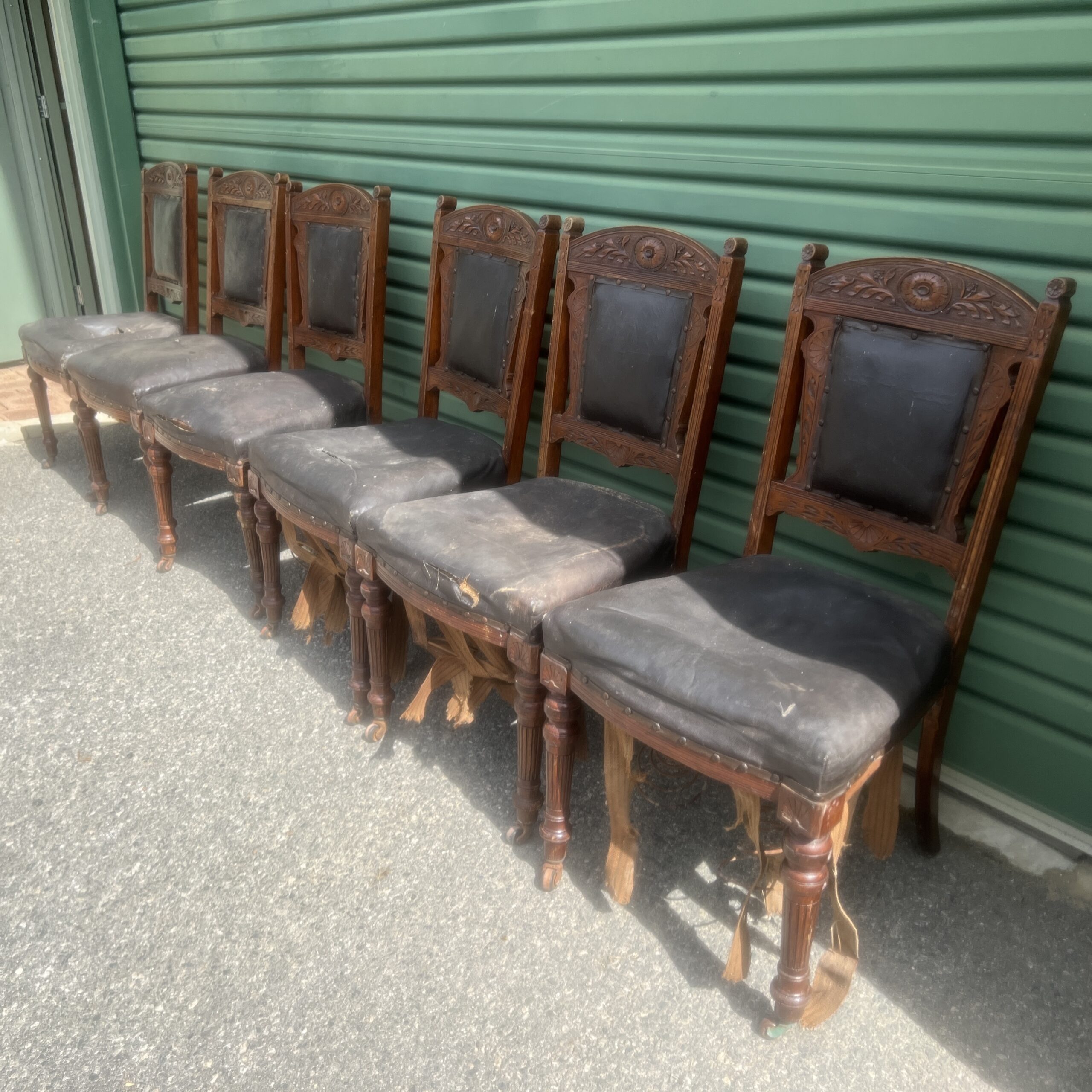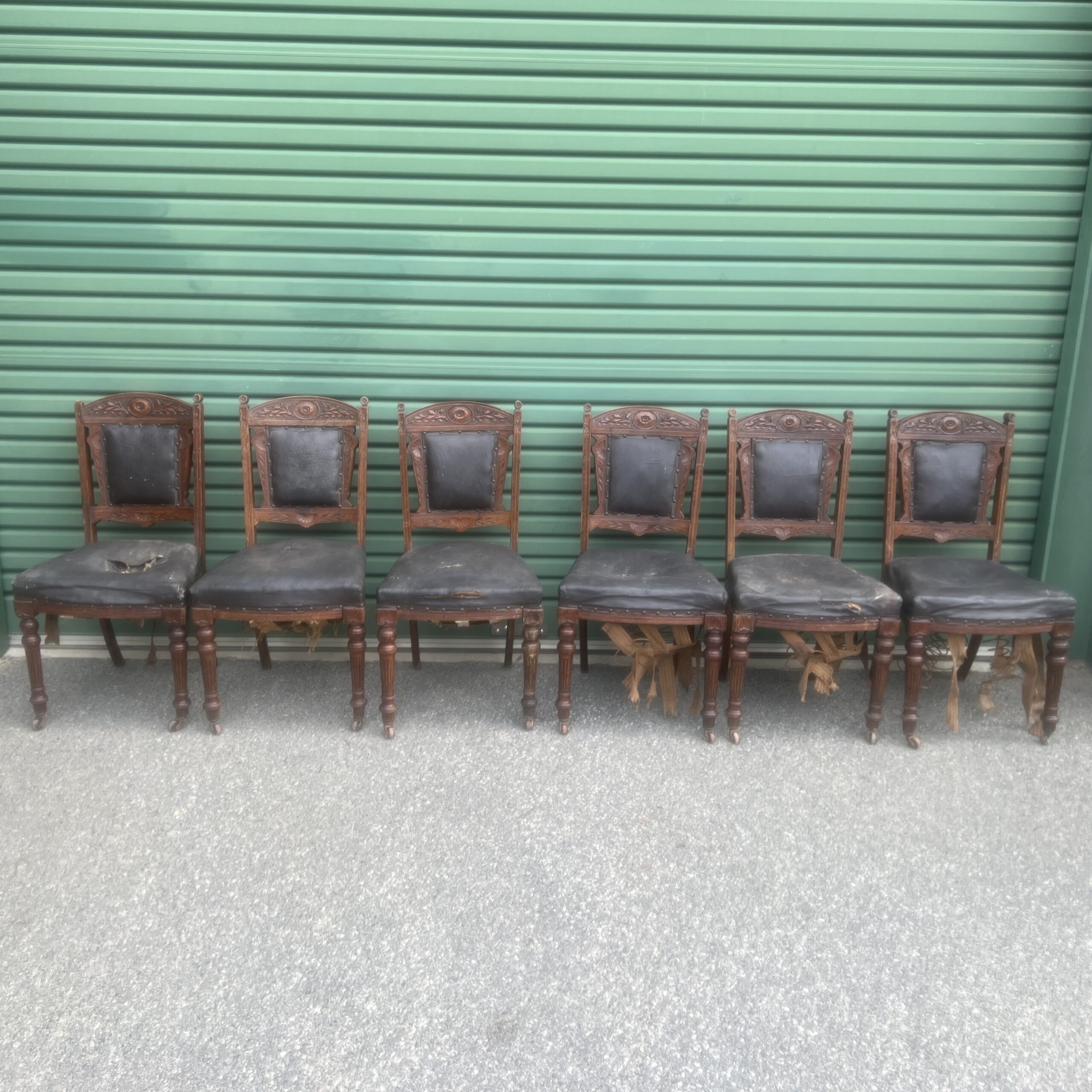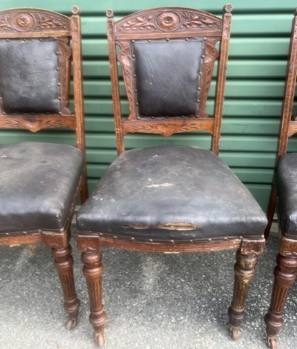A late 19th century French set of six chairs beautifully carved dining chairs having upholstered seat and back rest, turned and reeded legs on casters Restoration:- Woodwork $220 plus GST per chair. Upholstery depending on fabric would cost around $300 plus GST per chair