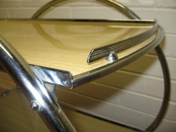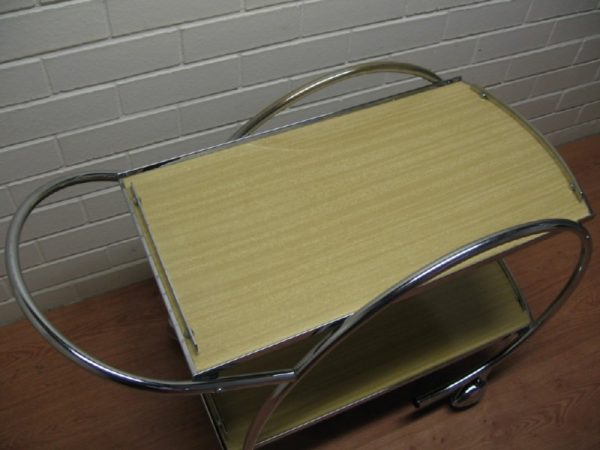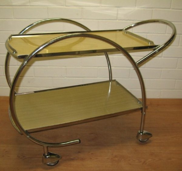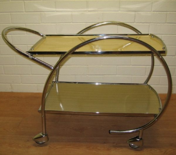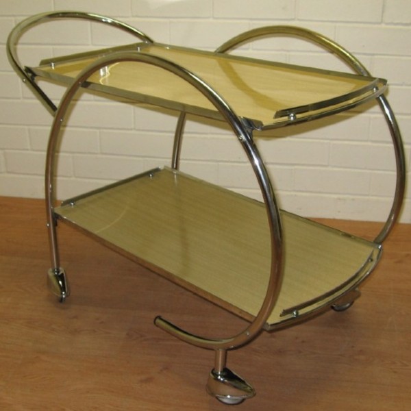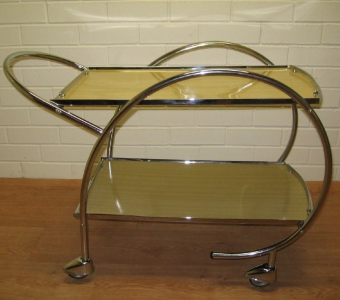 A late Art Deco period chrome and laminate two tier tea/cocktail trolley, with perfect Deco lines, hooded wheel guards and in great condition.