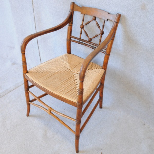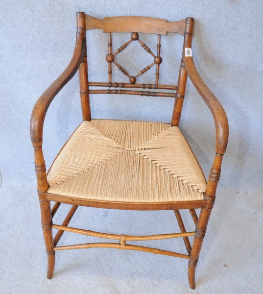 A late Regency spindle turned open arm chair with shaped and moulded arm rests and seagrass seat base. Size: 83 high x 52 wide x 43cm deep.