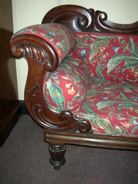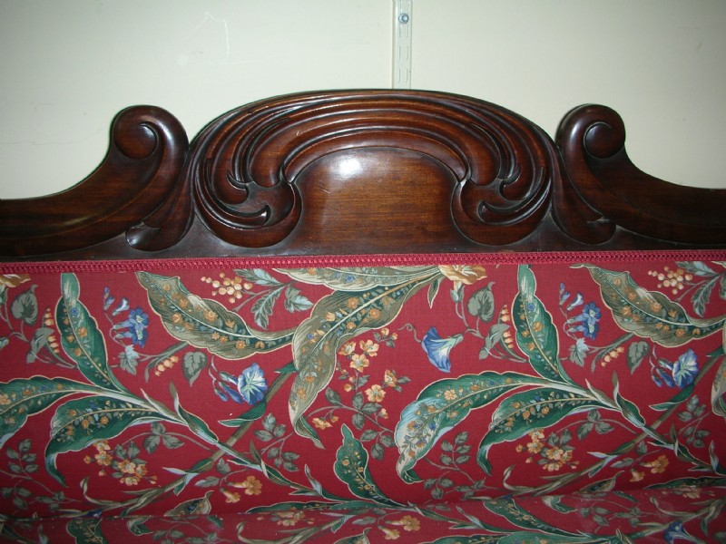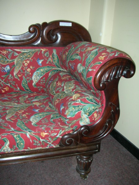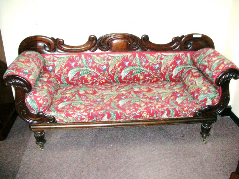 A mahogany William IV scroll end settee with typical ” C” scroll carved decoration, the arms scrolling over and incorporating a bolster cushion, raised on turned and reeded legs with brass casters.